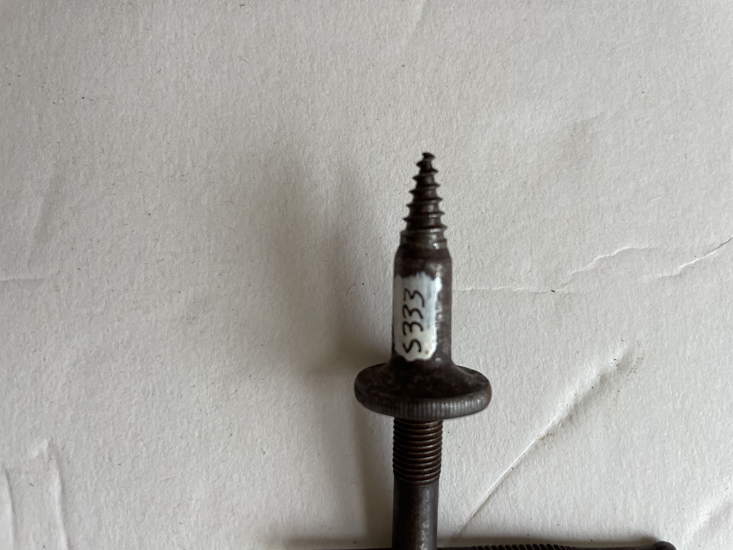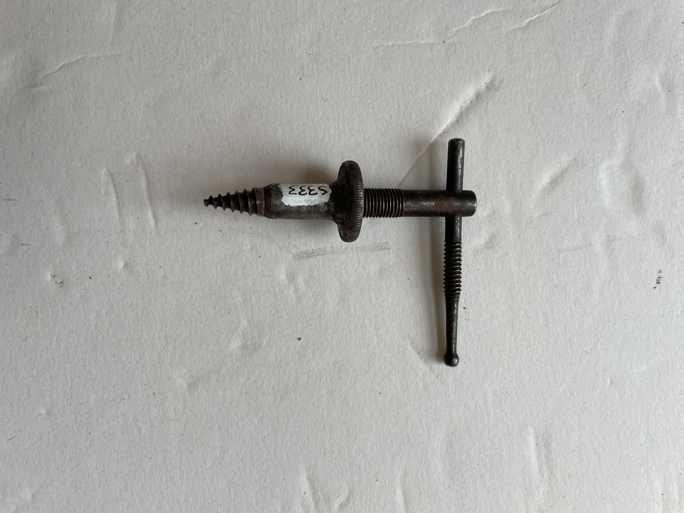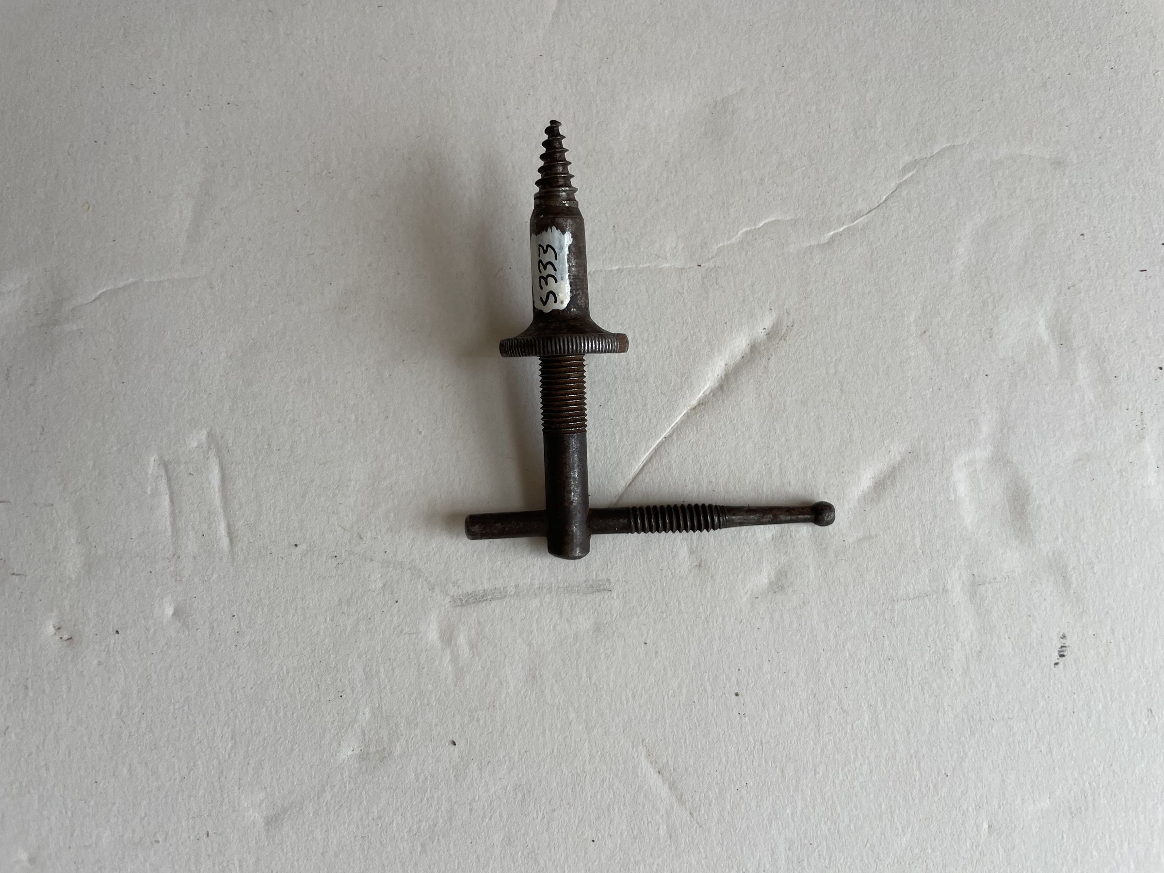 Two screws linked together at a 90 degree angle. Unknown purpose.