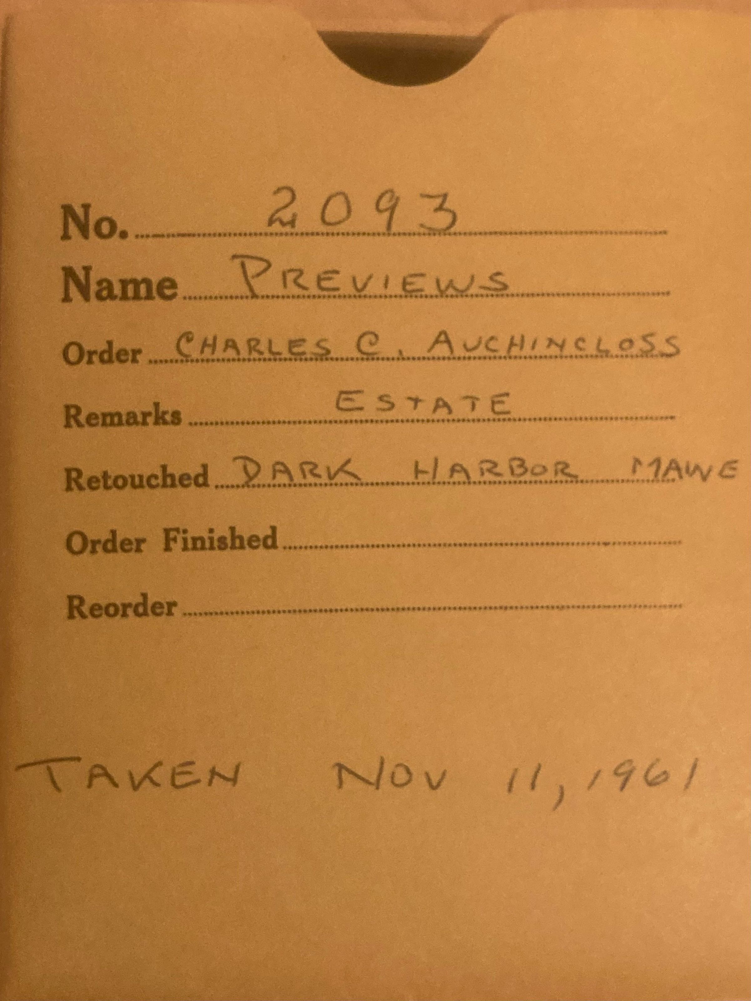 No. 2093, Previews, Charles C. Auchincloss estate, Dark Harbor, taken Nov. 11, 1961