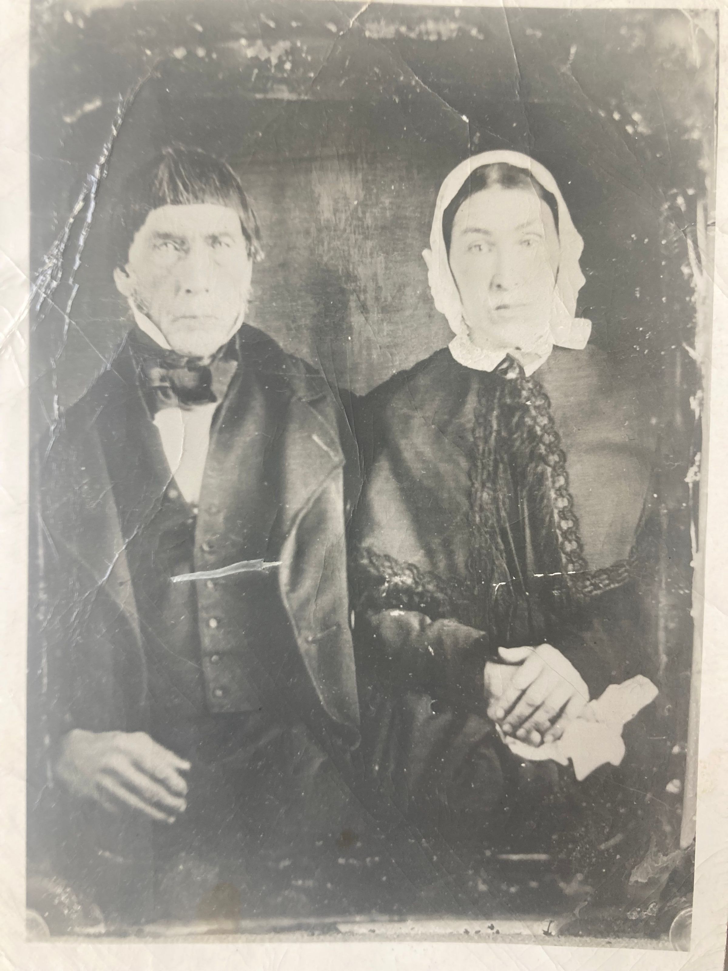 Snapshot-size photograph (copy of older image?) of Francis Lowell Grindel (alt. Grindle, Grindell, Grindall) and his second wife, Eliza Harlow. Note on verso says the image was taken in 1835, but date seems incorrect, as according to Farrow, Francis's first wife died in September of 1839. He married Eliza in 1840, so possibly the date should be 1845.