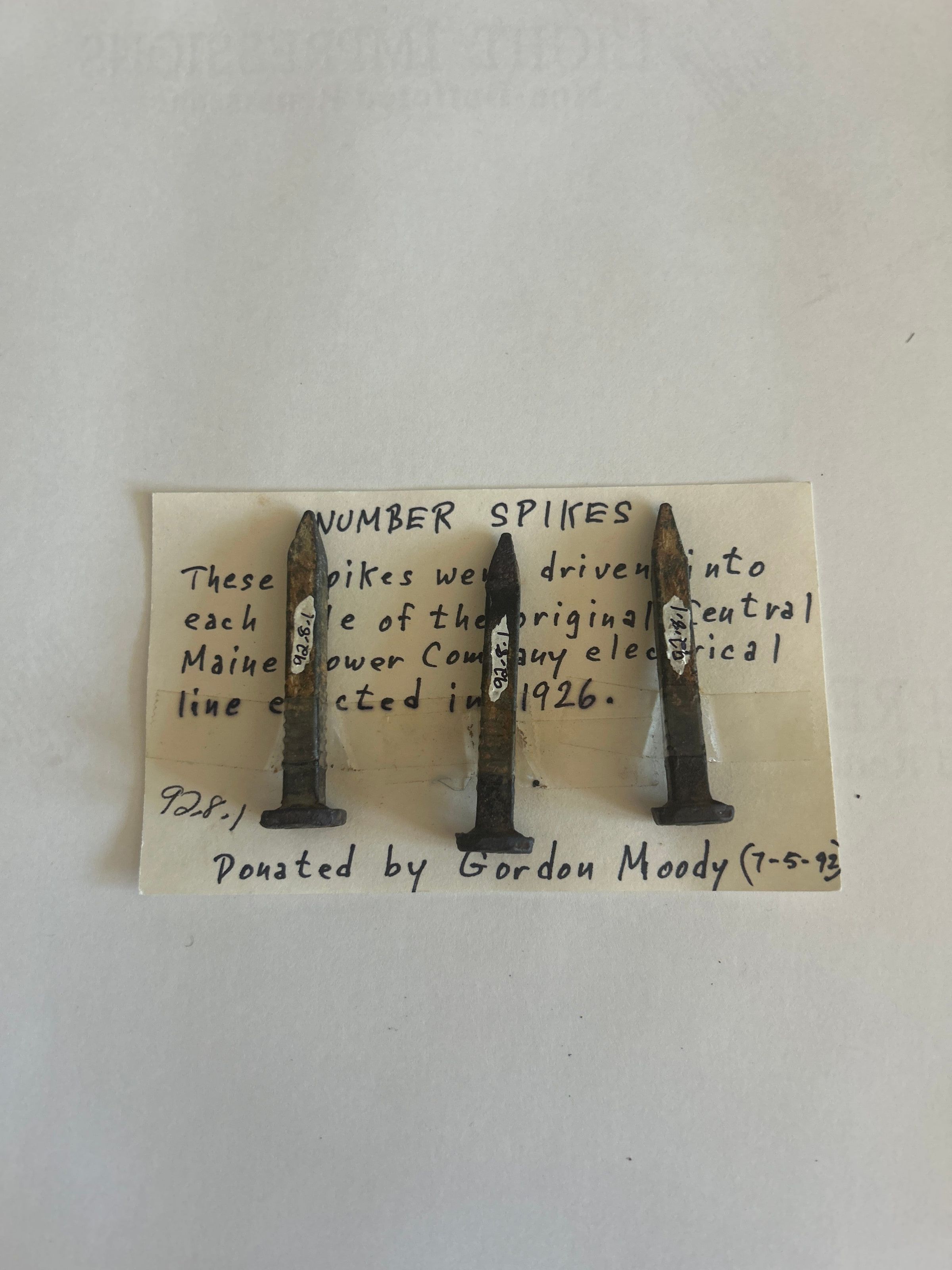 SPECIAL SIGNIFICANCE: Spike was removed from a Central Maine Power Electric Pole that had been erected in 1926.