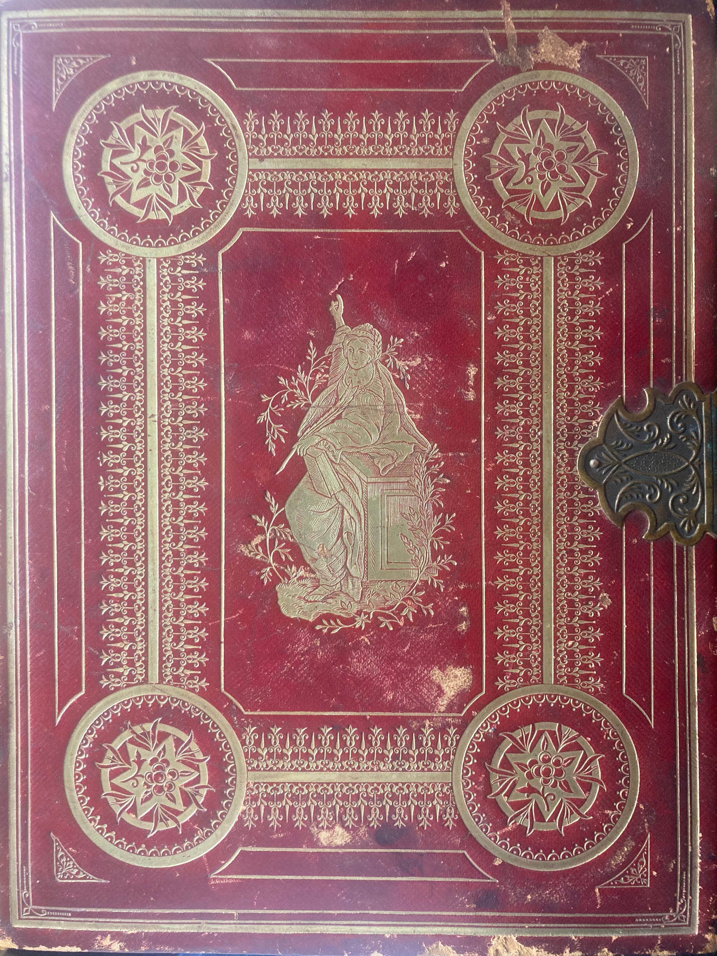 Grindel family bible, red leather binding, brass clasp. Center pages include marriage certificate of James Francis Grindel and Theresa Ruthsen Rose, 5 February 1866, and spaces for family portraits, of which only several remain: