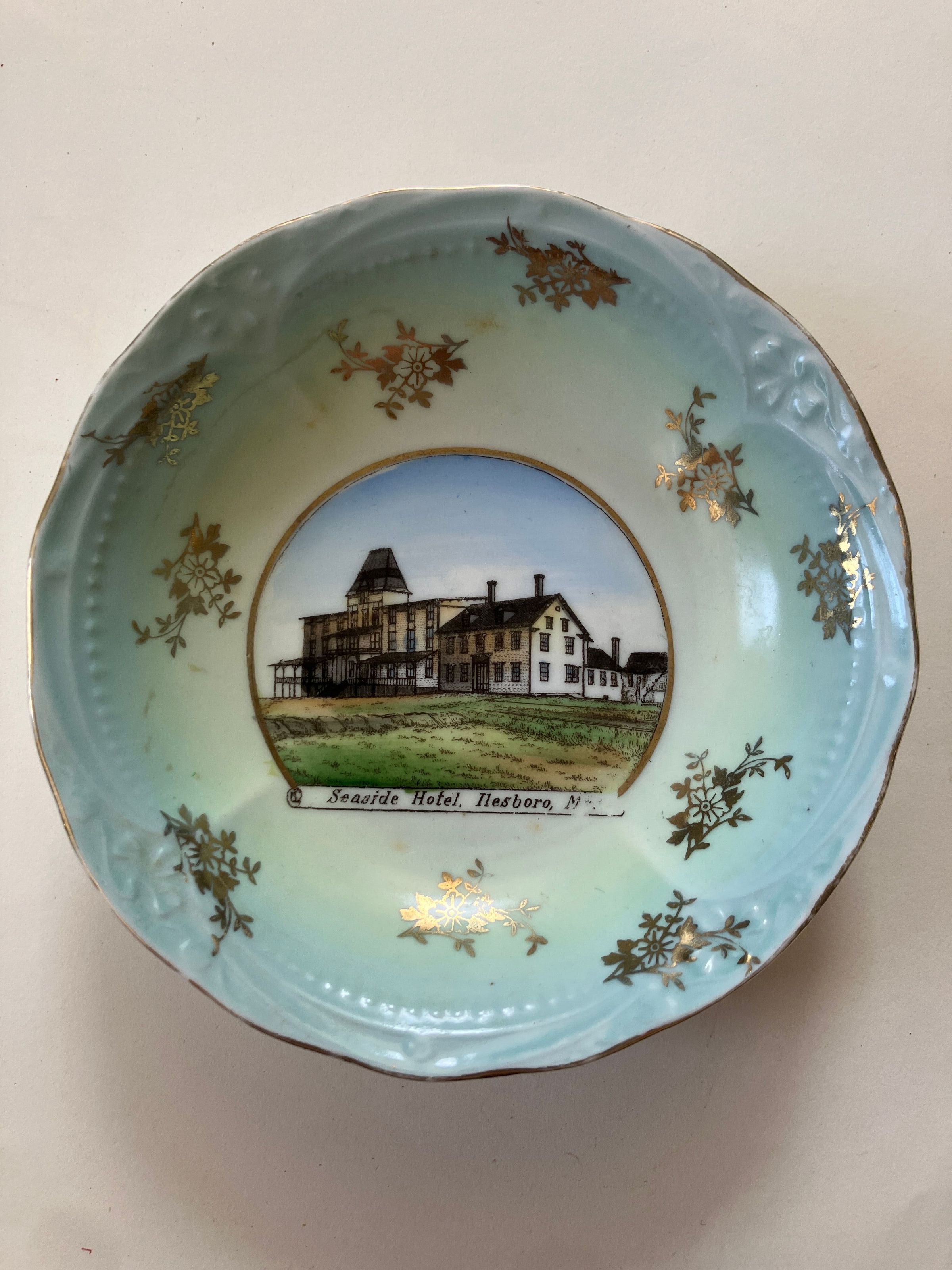 Small dish, 5 1/4 inches in diameter, base 3 inches in diameter, 1 inch deep. On the inside of the dish is a painting of the Seaside House and the sides of the dish are painted light blue grading into a pale yellow. Within the painted area are gold-colored blossoms and leaves. At the bottom in the center of the dish is a painting of the Seaside Hotel. The outline of the parts of the hotel are linked or etched in with dark gray pigment. The hotel is painted in dark gray. At the bottom of the picture is a scrolled sign --inscription below.