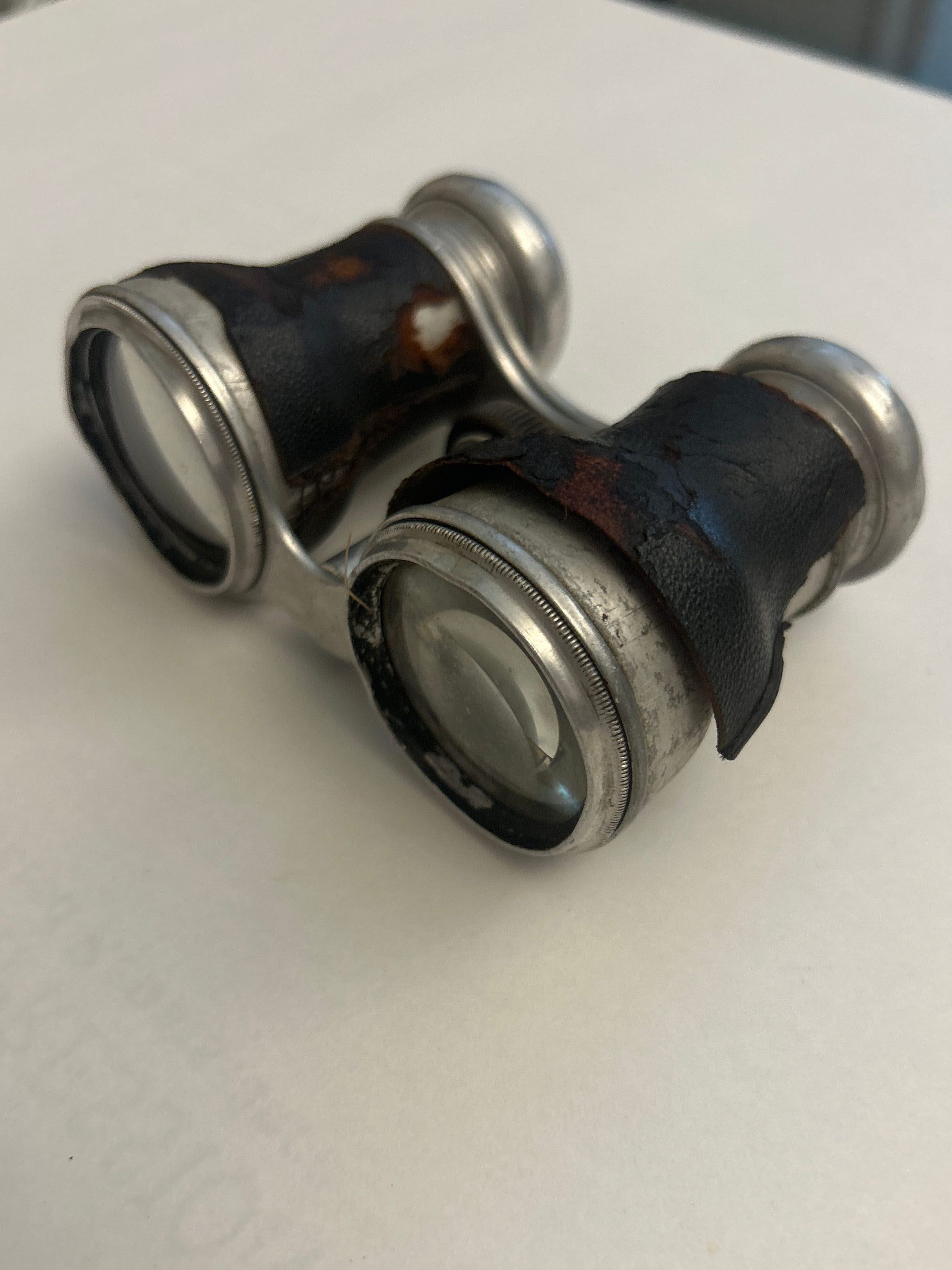 1 1/2 inches in diameter. Two leather-covered metal tubes separate the two sets of lenses. Adjustment knob in between the two metal tubes focuses the lenses.