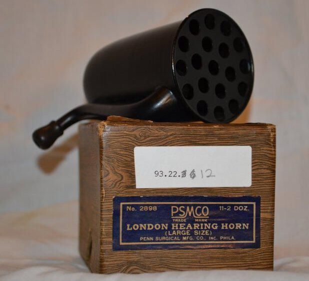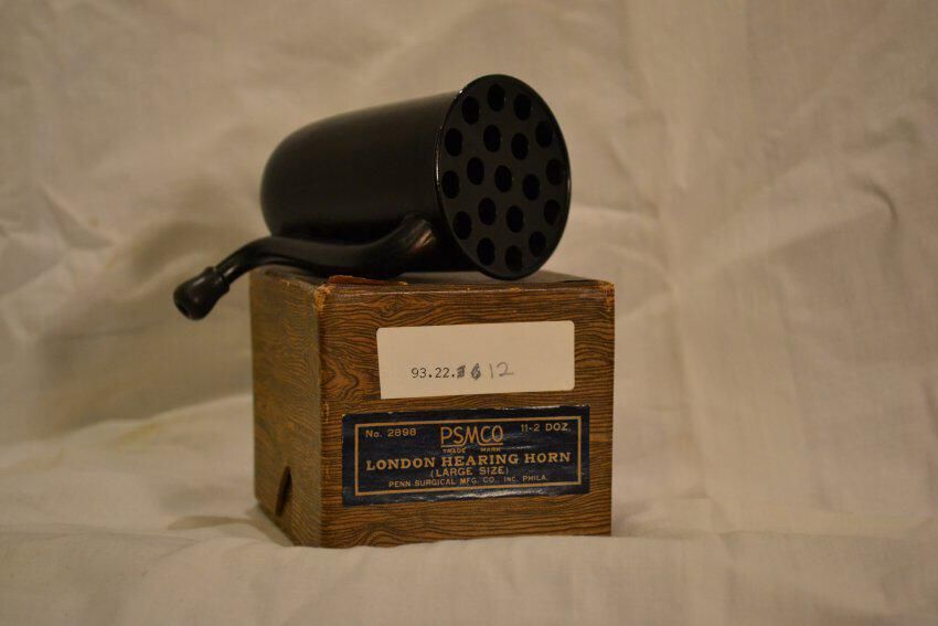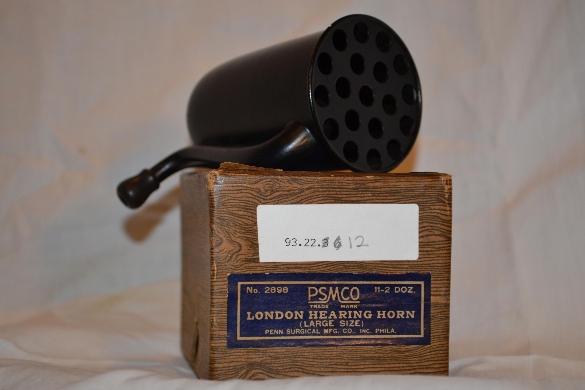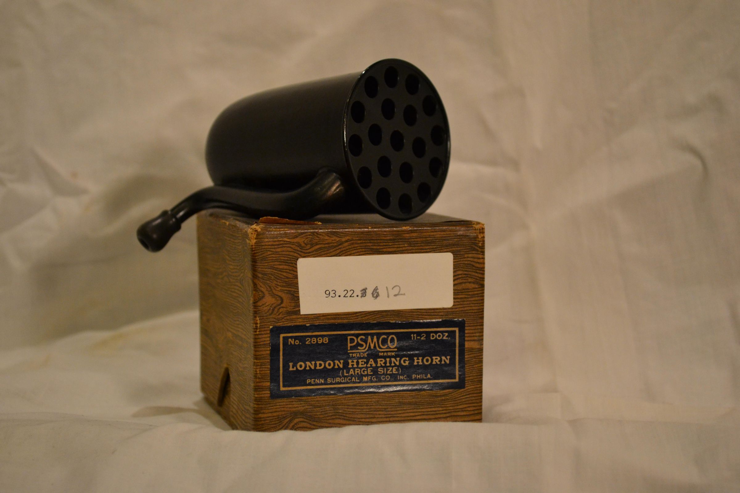 Black metal horn, 4 1/2 inches long, rounded and closed at one end and open at the other end. Open end is 2 1/4 inches in diameter and covered with a metal disc containing 19 holes. A short, narrow, curved metal tube leads into the side of the horn. The free open end of the tube is inserted into the persons's ear. Sound from the horn travels through the tube into the ear.