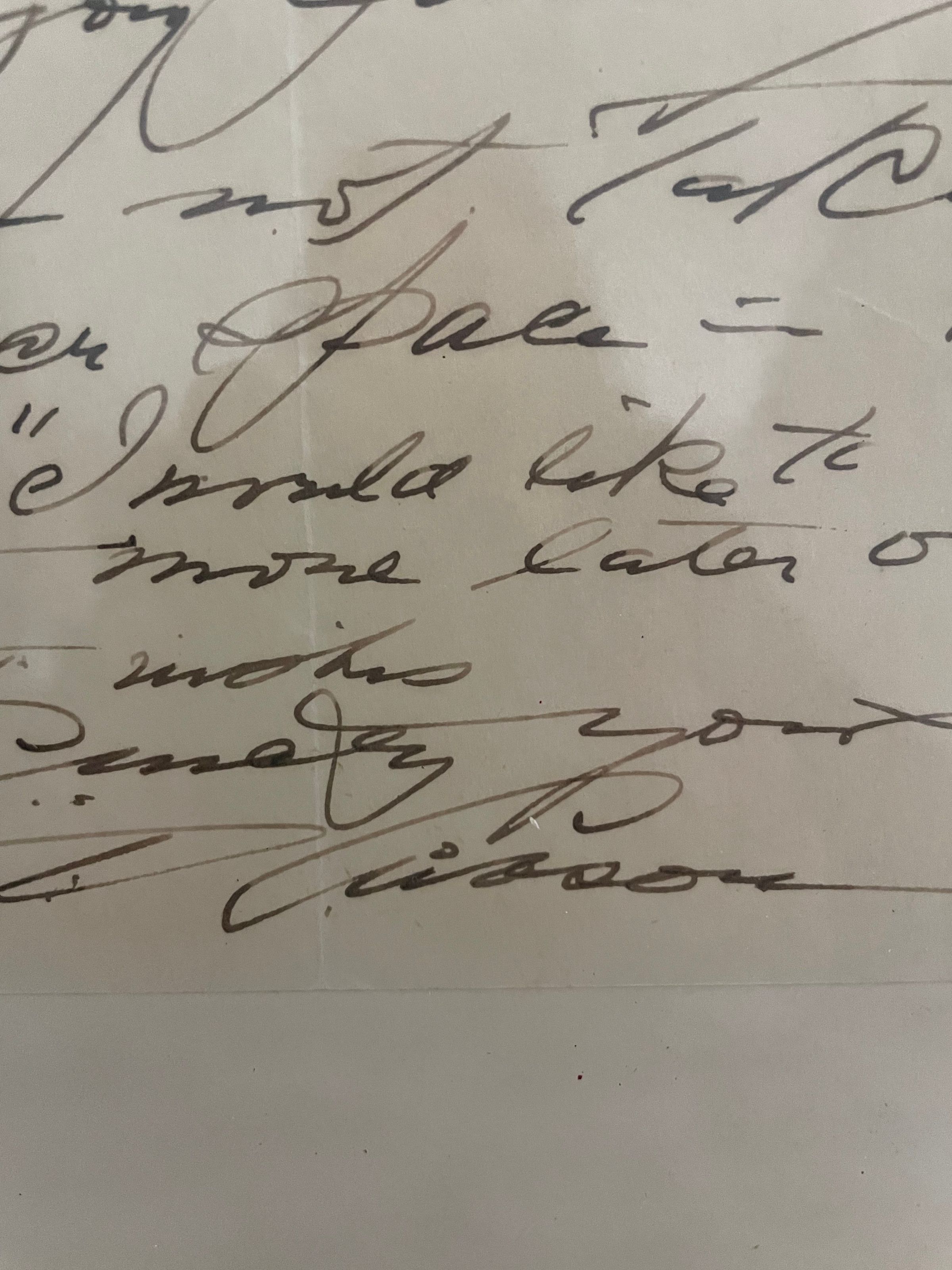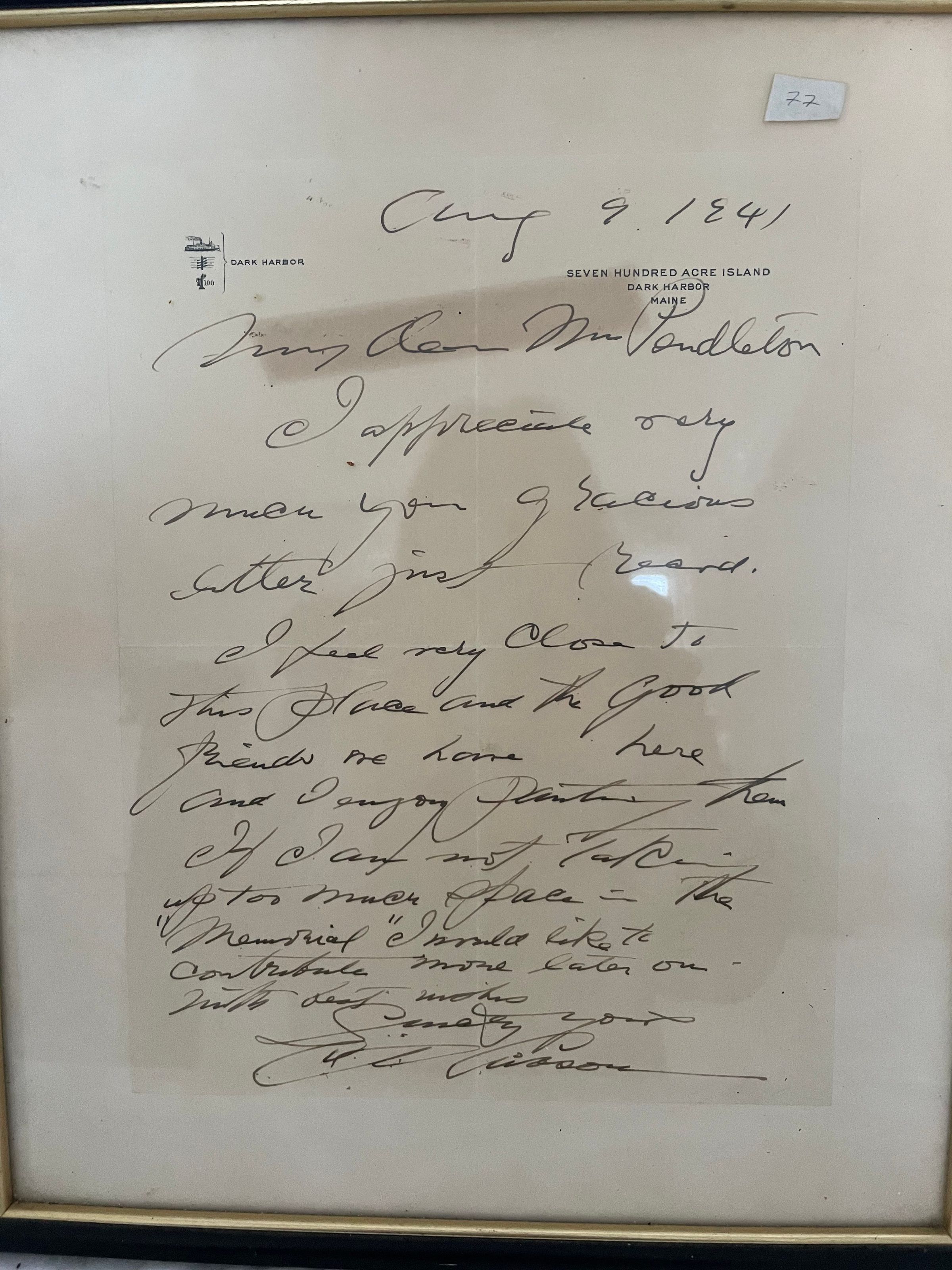 A framed letter from Charles Dana Gibson, written on acher island stationary, to Alice L. Pendleton, in appreciation for the memorial and flag pole that is outside of the library