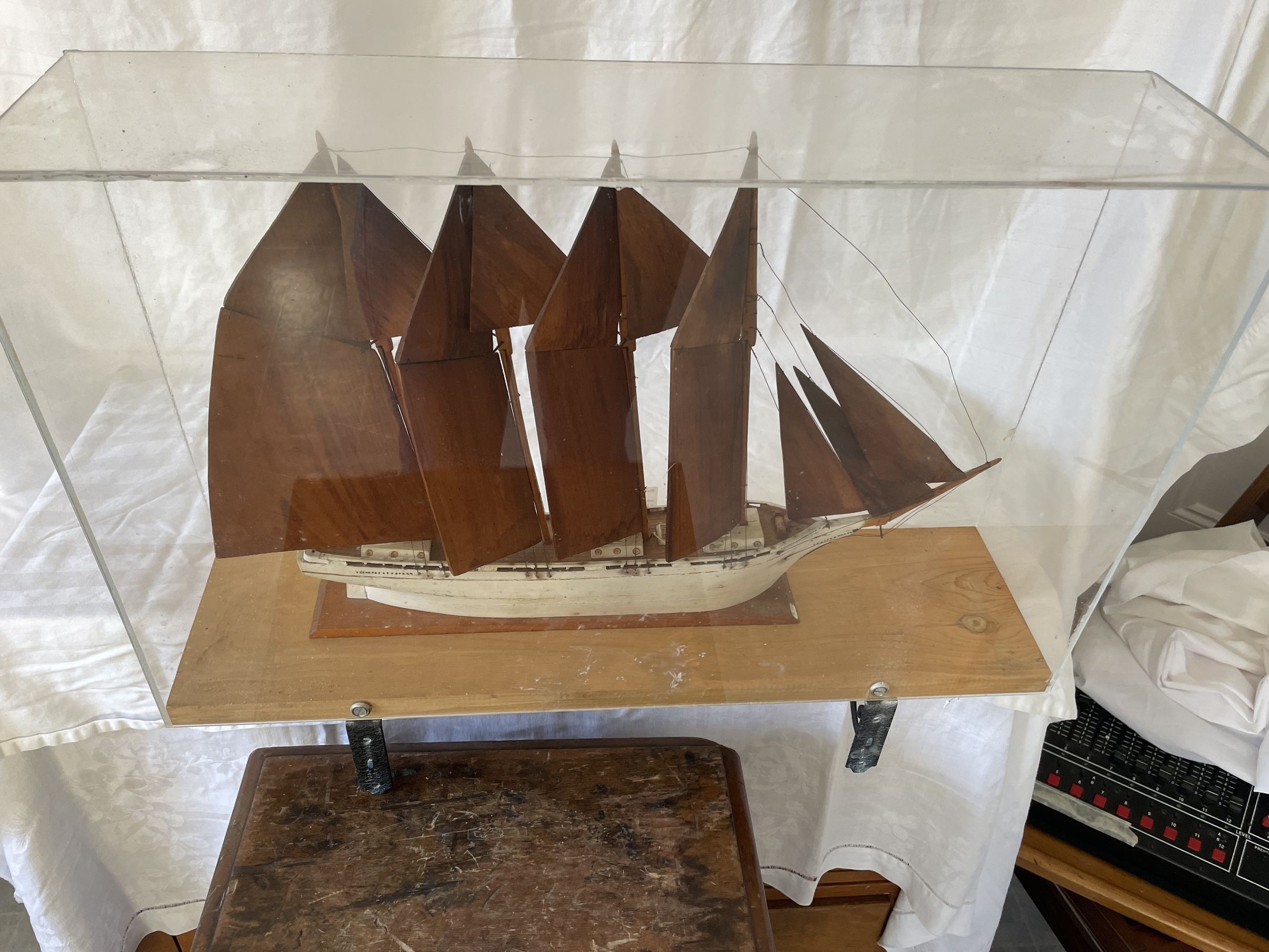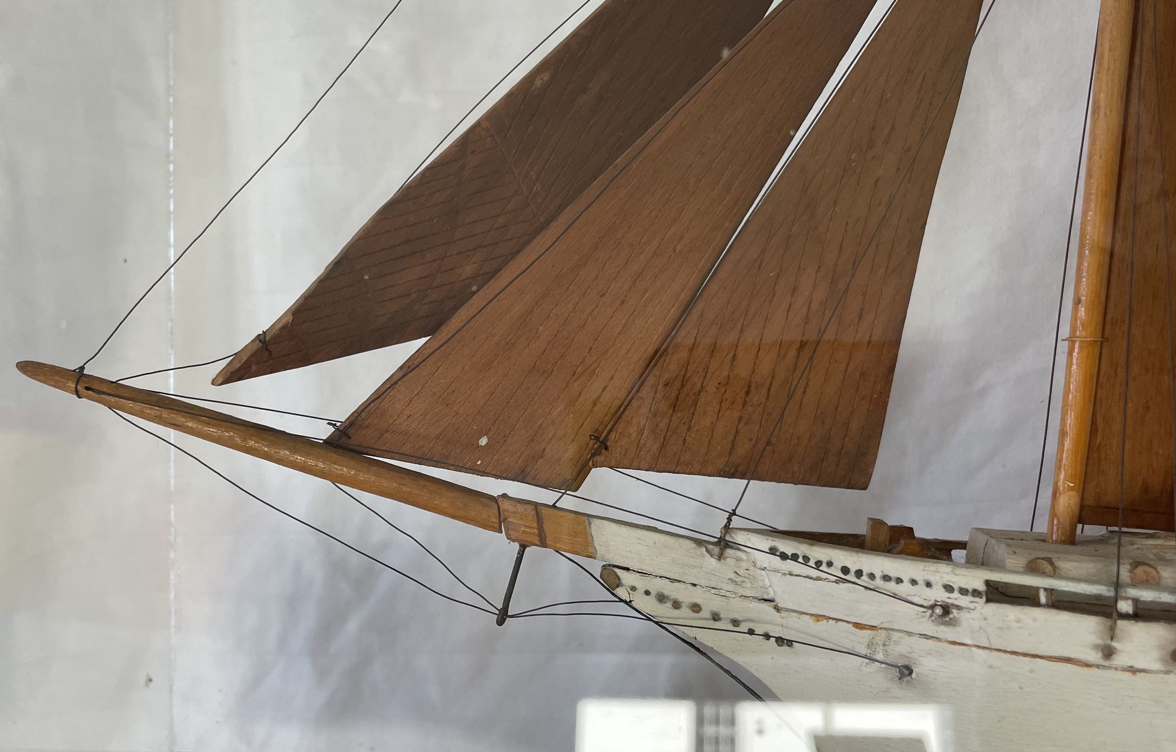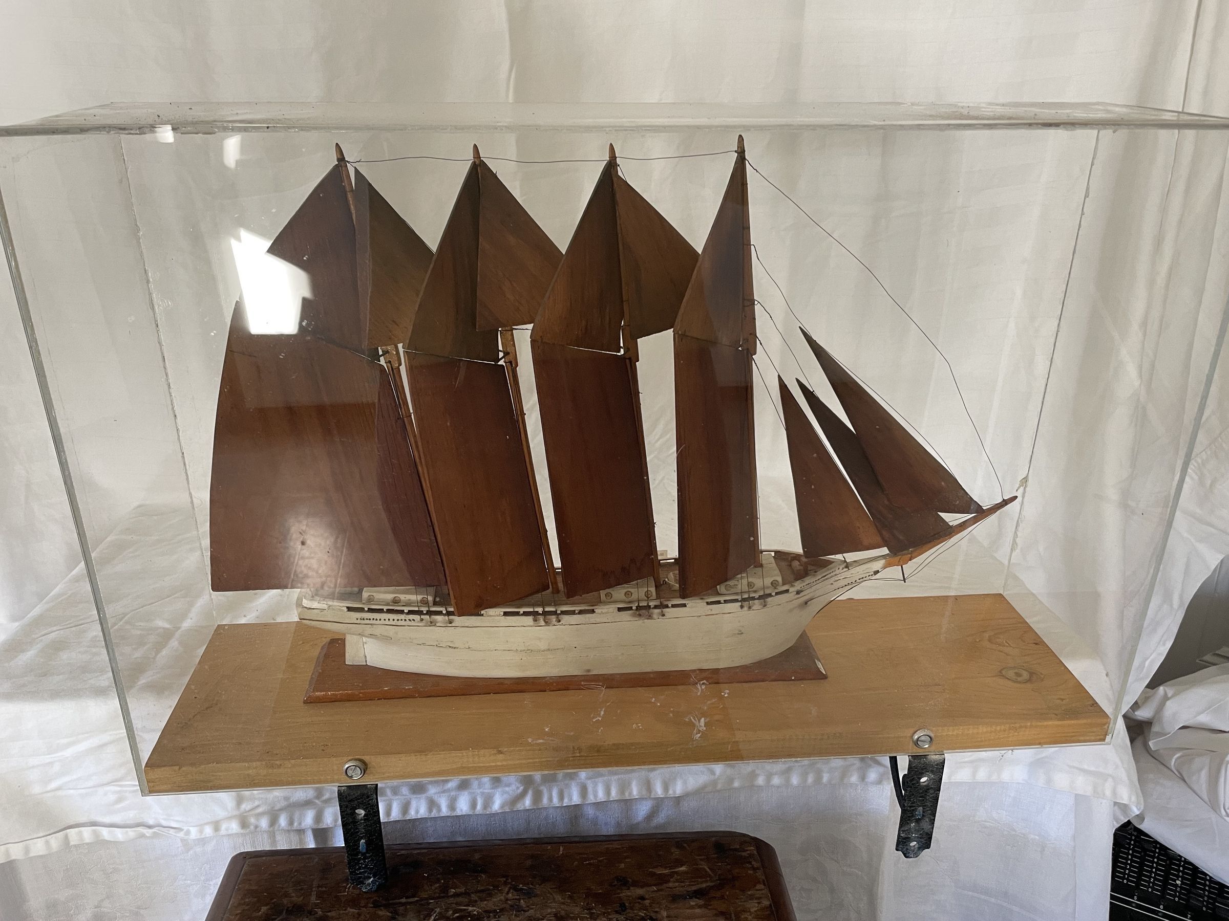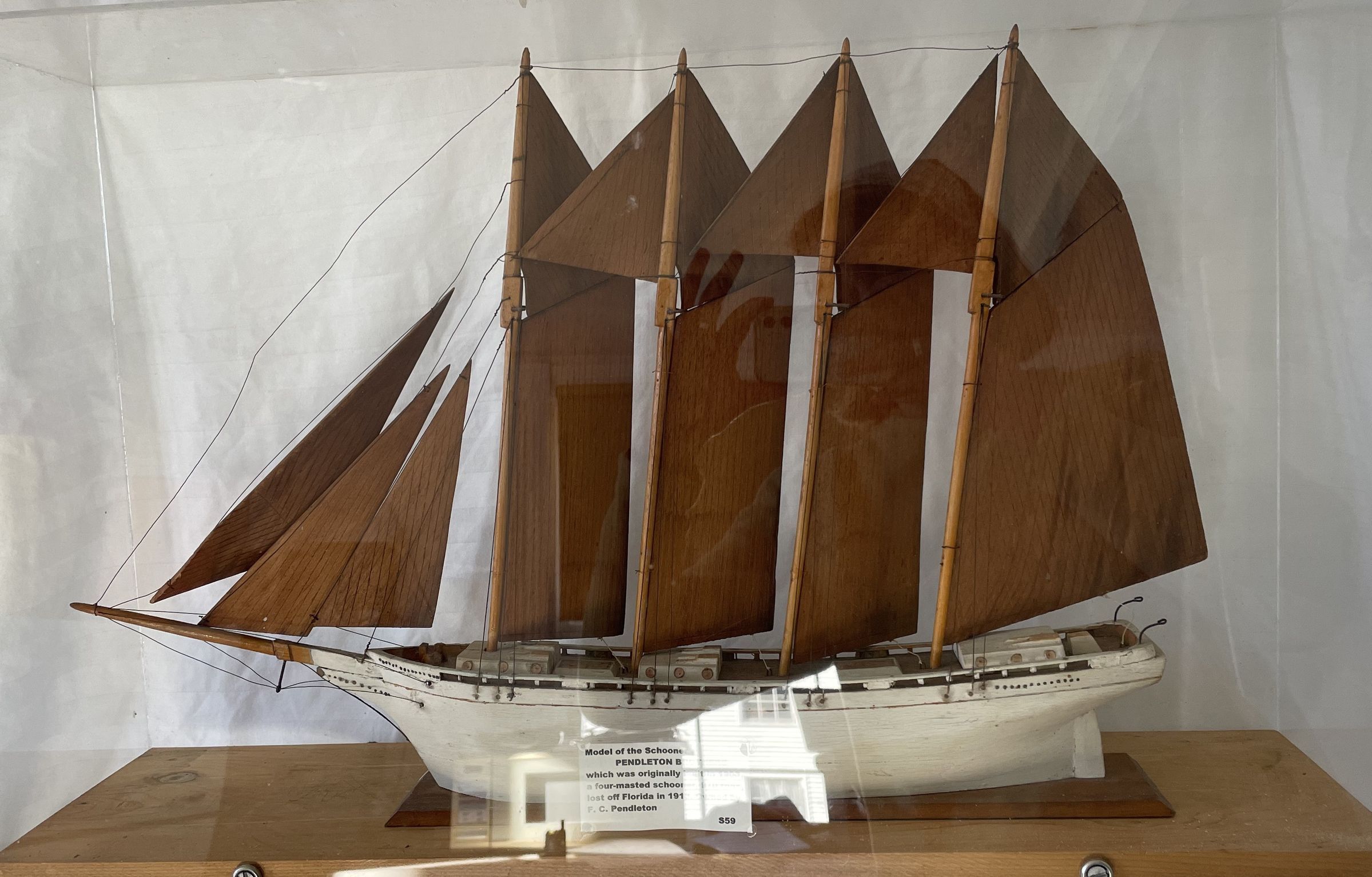 Housed in plexiglass. The ship was built in 1903, and wrecked off Florida in 1913. Depicted with wood sails. White haul and three jib sails.