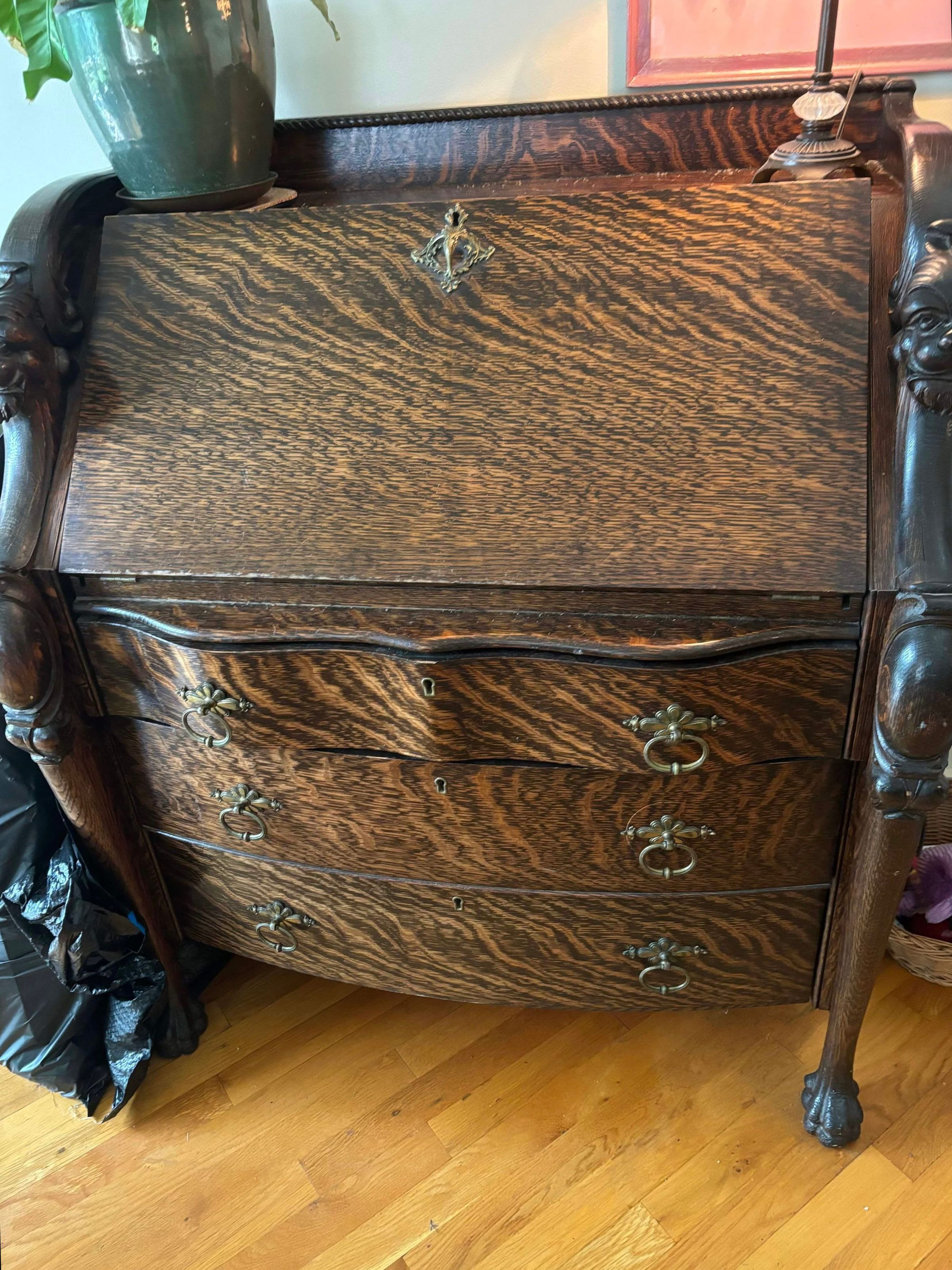 Desk, possibly tiger maple, drop front, three drawers below. Purported to have been rescued from the Islesboro Inn as it burned (1950s?). The story comes from Stanley Pendleton, handed down from his father, Thomas Carroll Pendleton, who did build his house from lumber salvaged from the inn.