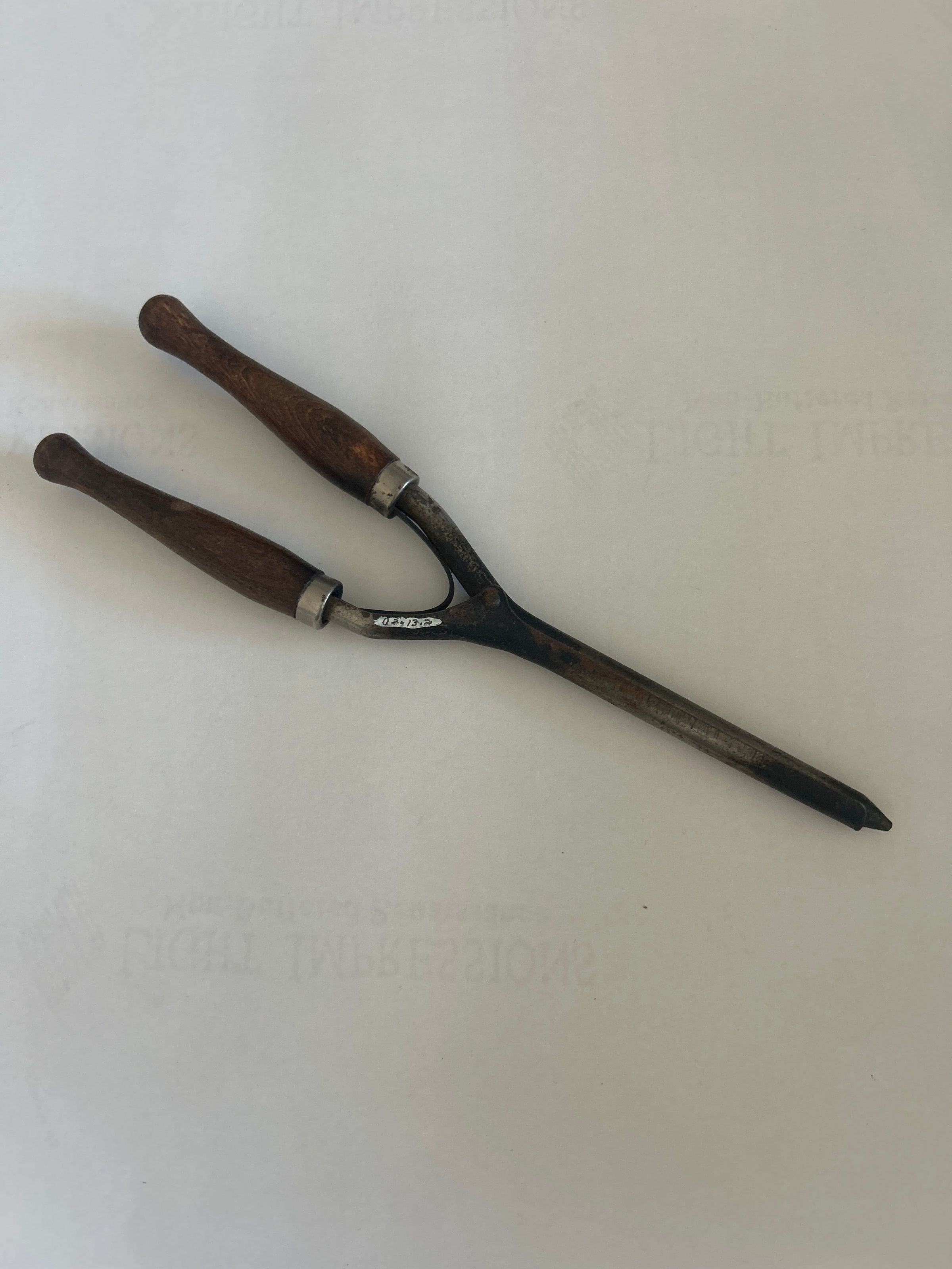 3 1/4 inches long spread apart from each other and supported by a flat spring. Two metal rods each 5 3/4 inches long, one solid and the other curved so that it fits over the solid rod are connected to the handle. Rods are discolored by the heat.
