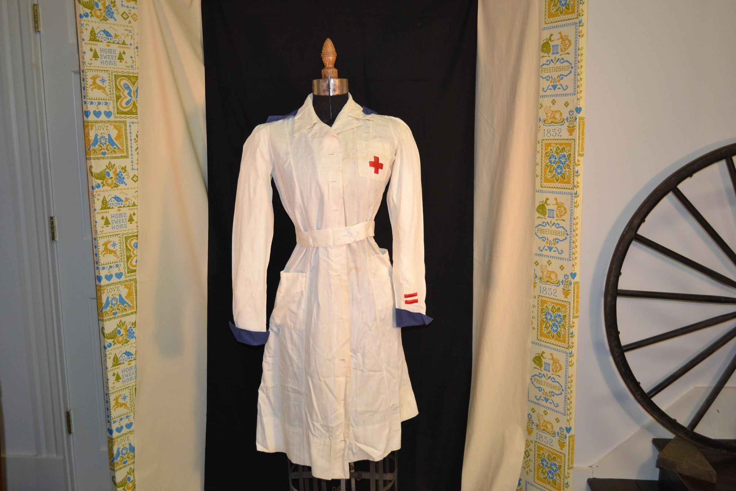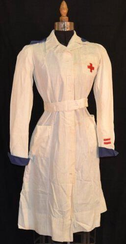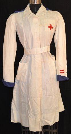 A volunteer Red Cross uniform made of white cotton. A long dress buttons up the front, with long sleeves. Has two side pockets and a breast pocket with a Red Cross patch sewn on to it. Sleeves have blue cuffs and there are epaulets on the shoulders in matching blue. Belted at waist. Length = 40 1/2 inches; Waist = 35 3/4 inches; Sleeves = 24 inches.