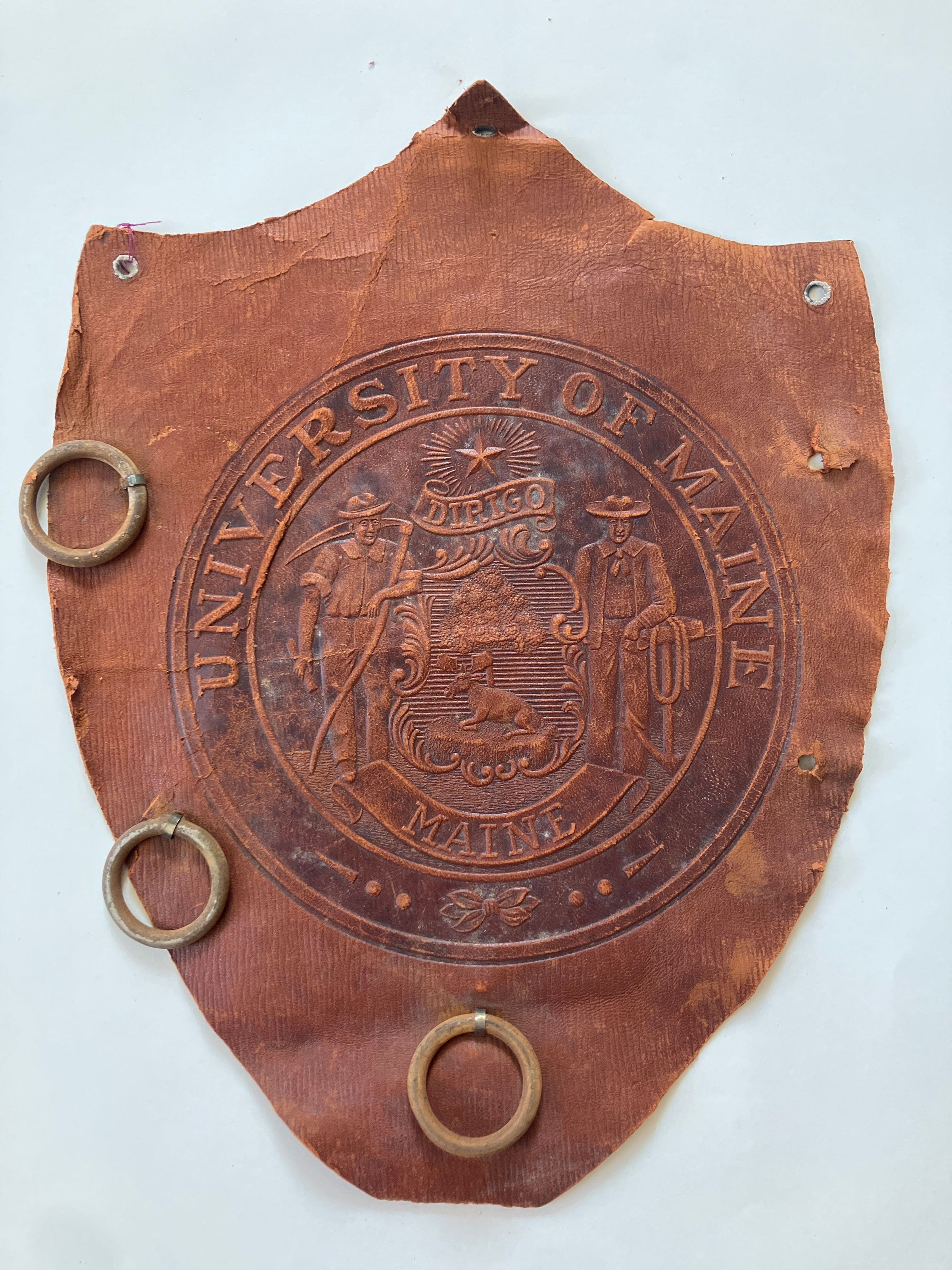 Brown leather shield-shaped patch 9 inches x 13 inches, with the seal of the University of Maine imprinted. Three eyelets at and near top of patch for possibly hanging, 5 punched holes, not reinforced, 2 on each side and one at the bottom. Three holes contain rings and 2 holes are empty.