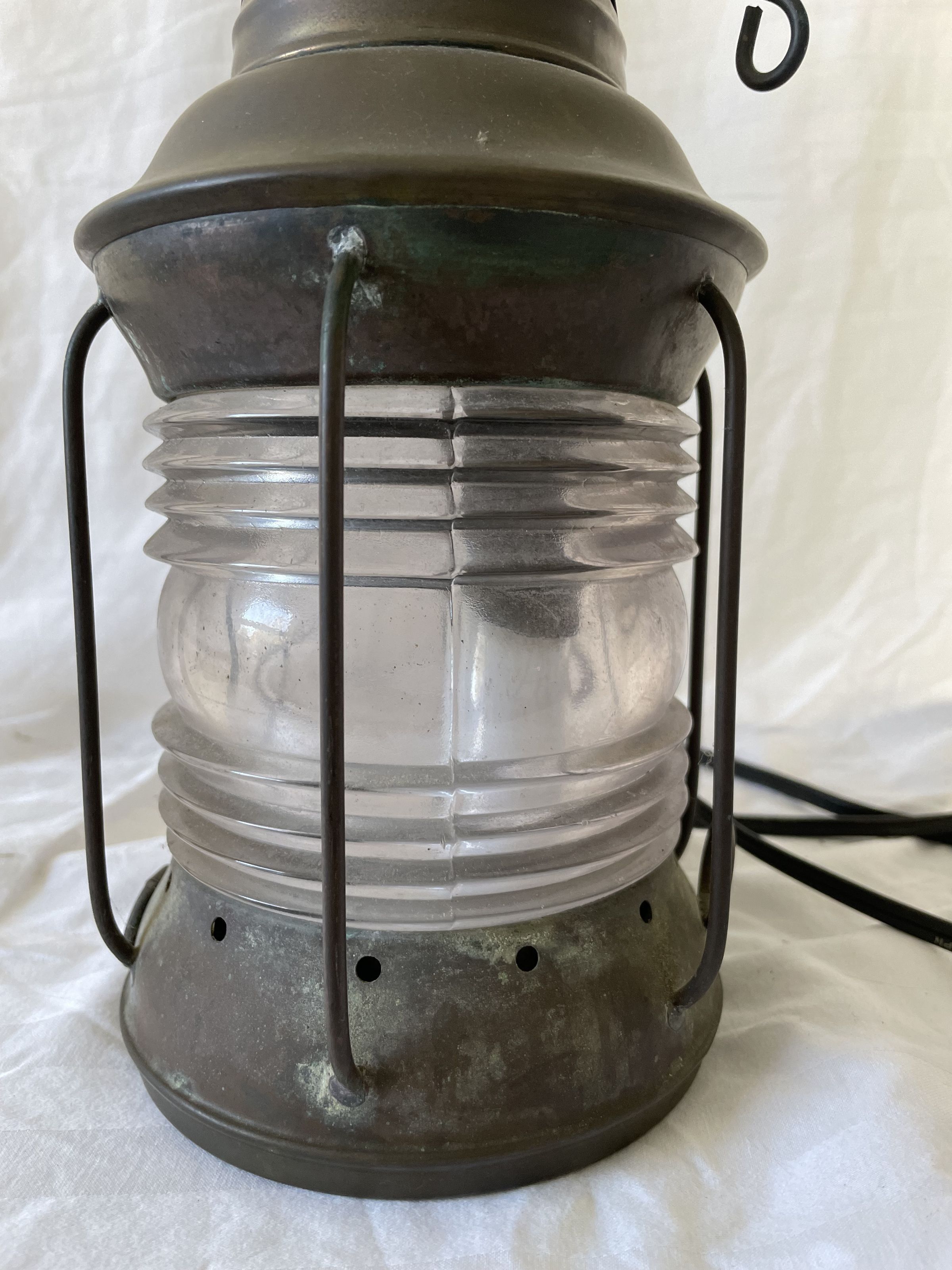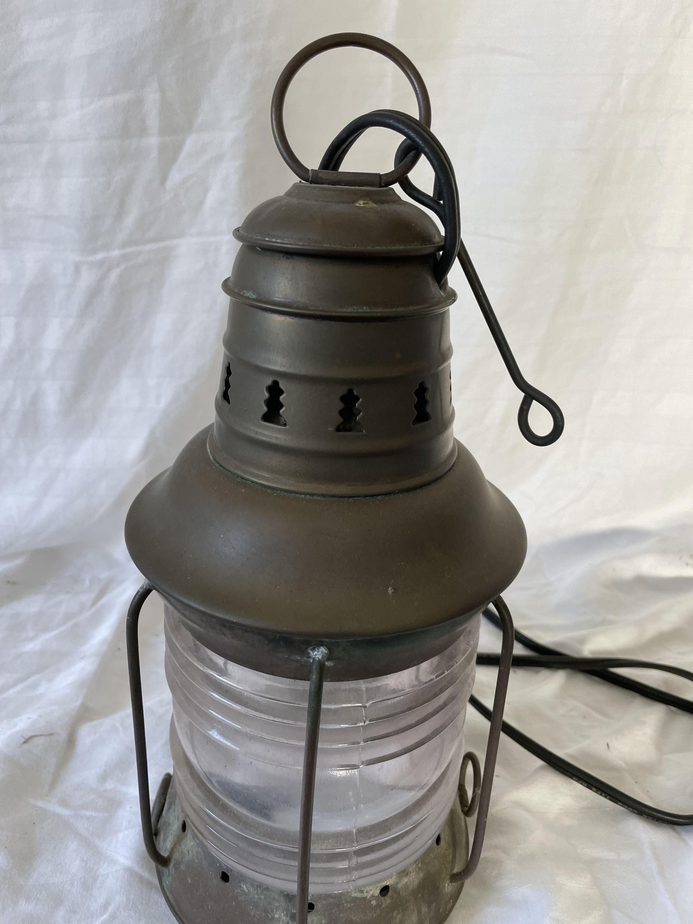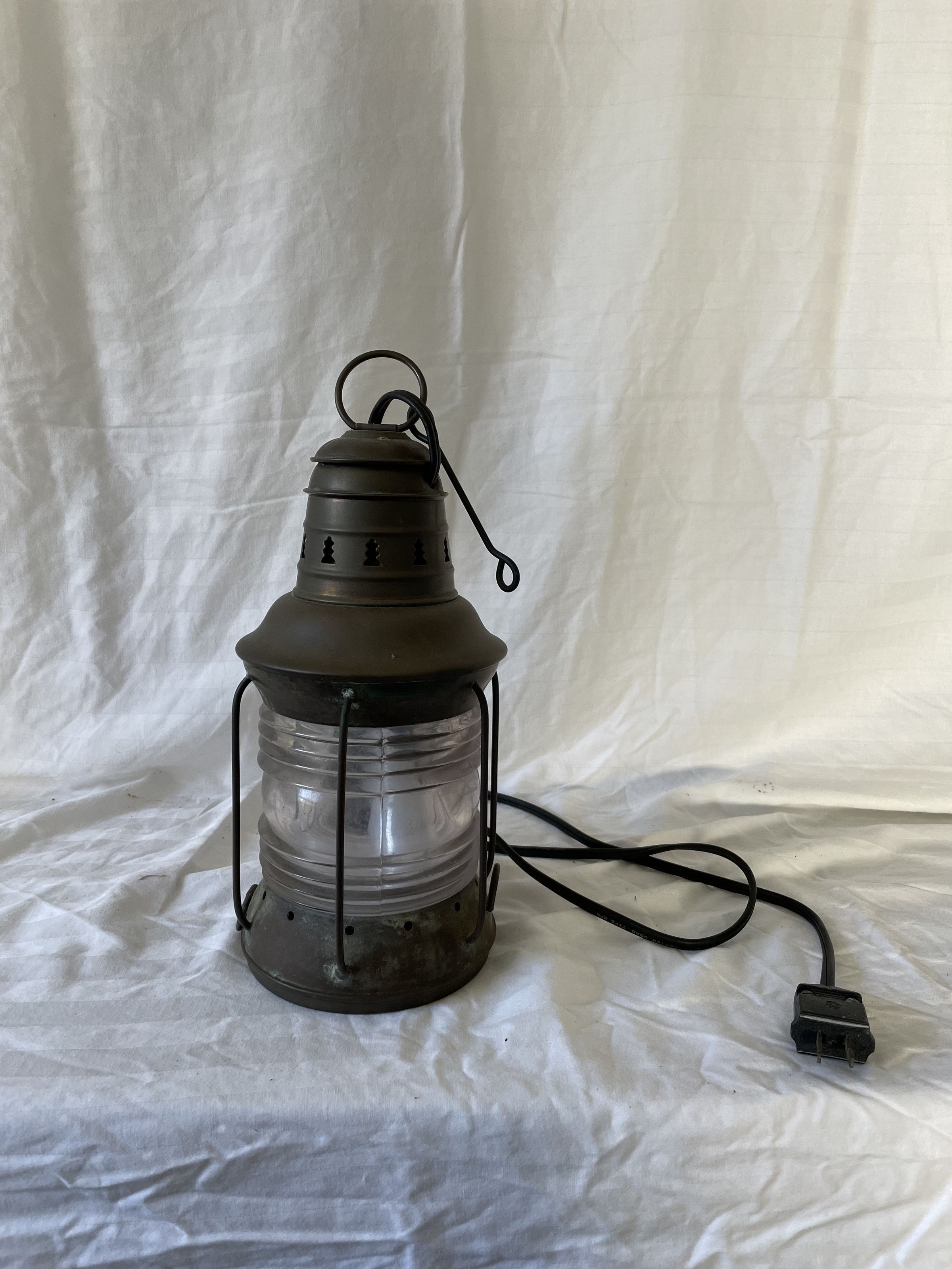 Electrified brass ship's light. Top has a large loop eyelet and lighthouse/Christmas tree shaped cut outs. Possibly a Fresnel lens. No S#