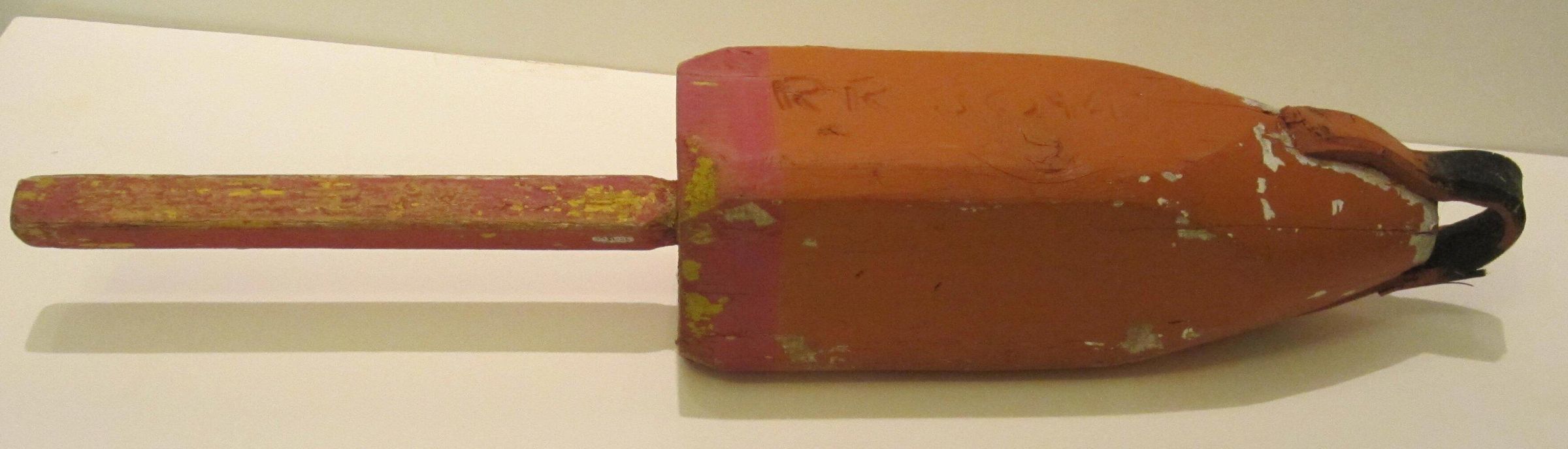 A wooden buoy used on a lobster trap.