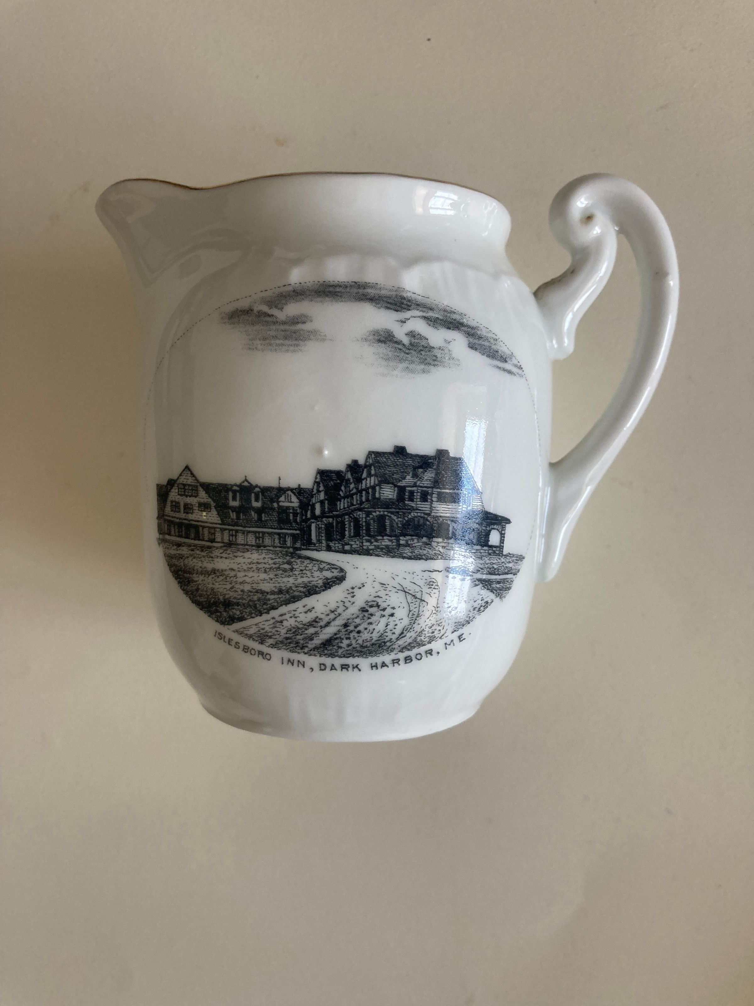 Small souvenir pitcher made in Germany for Sprague and Pendleton, Dark Harbor, Maine. Depicts the Islesboro Inn. White china, 3.5" high, gold tracing the spout and handle. Black and white oval image.