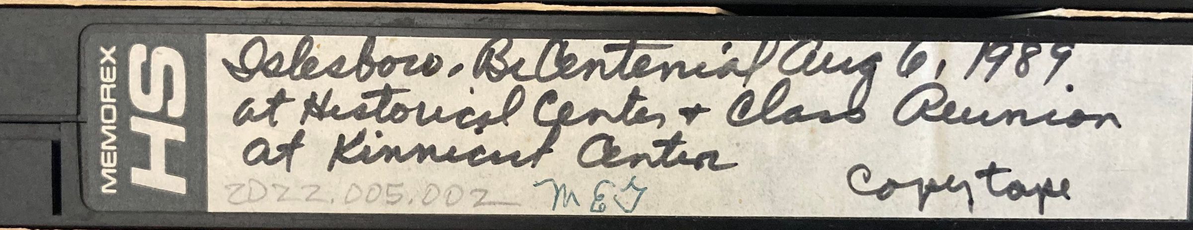 Video recording by Rocky Coombs dated August 6, 1989. Label lists the island bicentennial at the "Historical Center" and class reunion at the Kinnicut Center. "Copy tape."