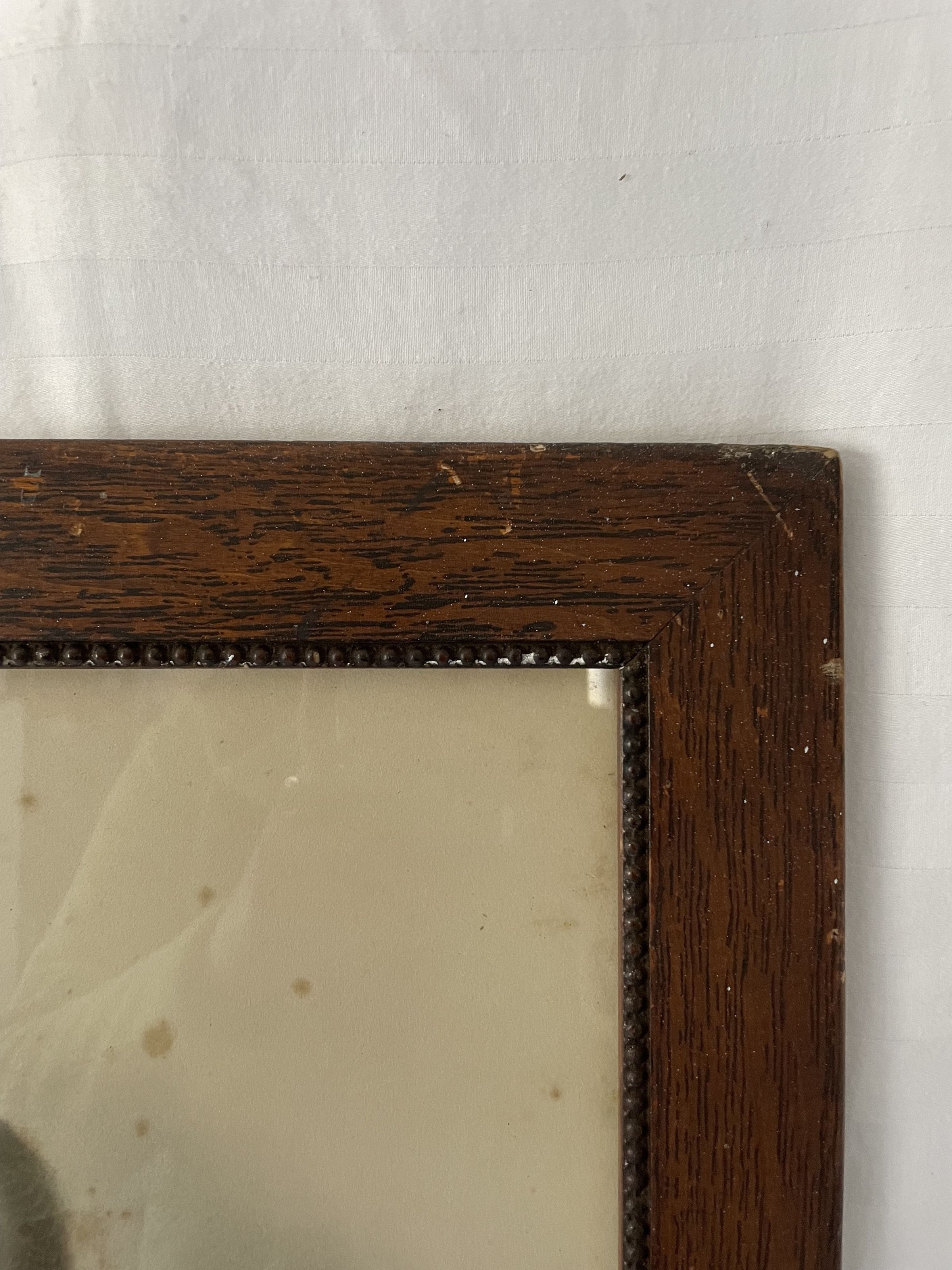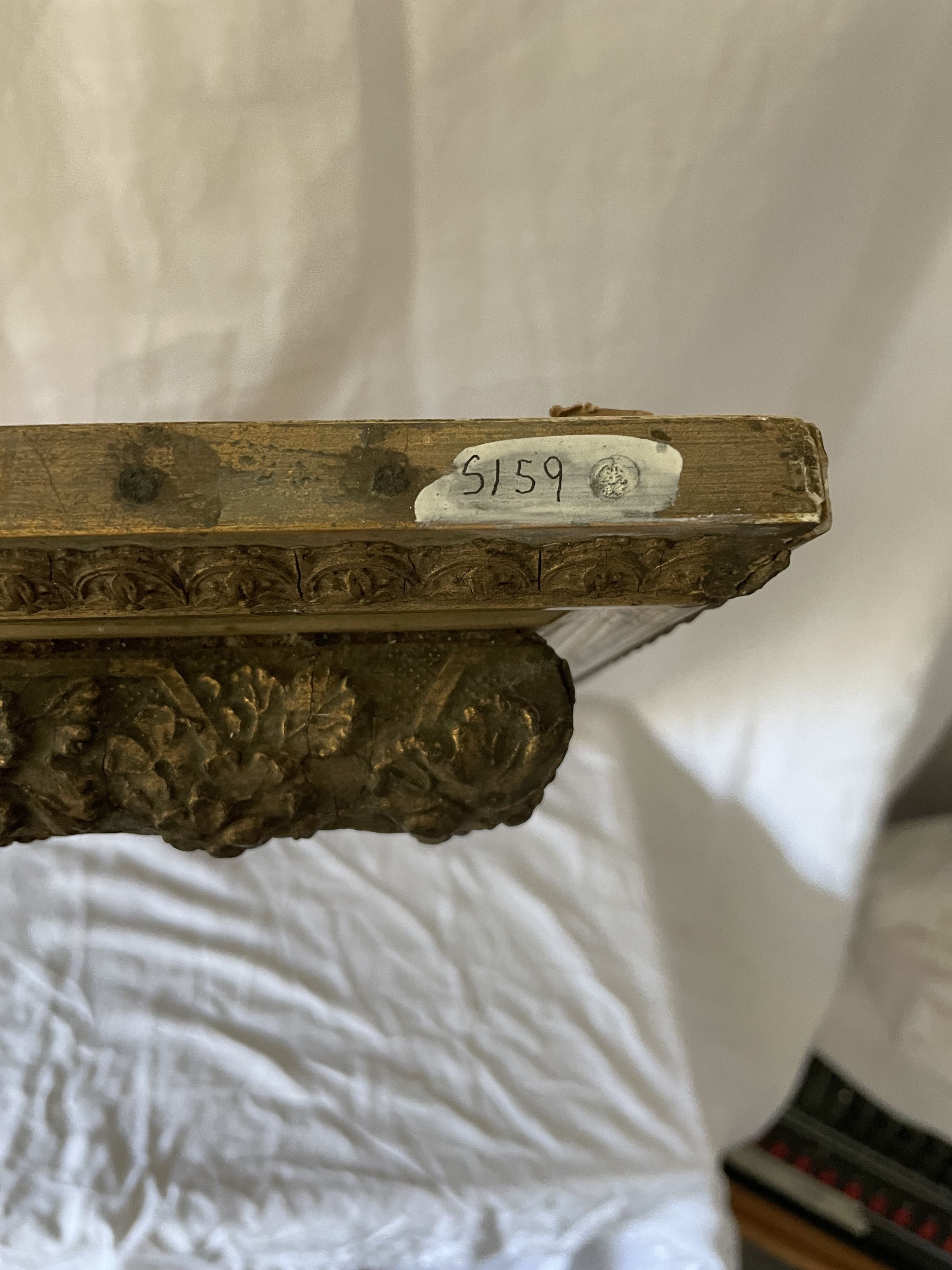 The image has a white to grey oval vignette. It is framed in a intricate gold frame, with tiered carvings.