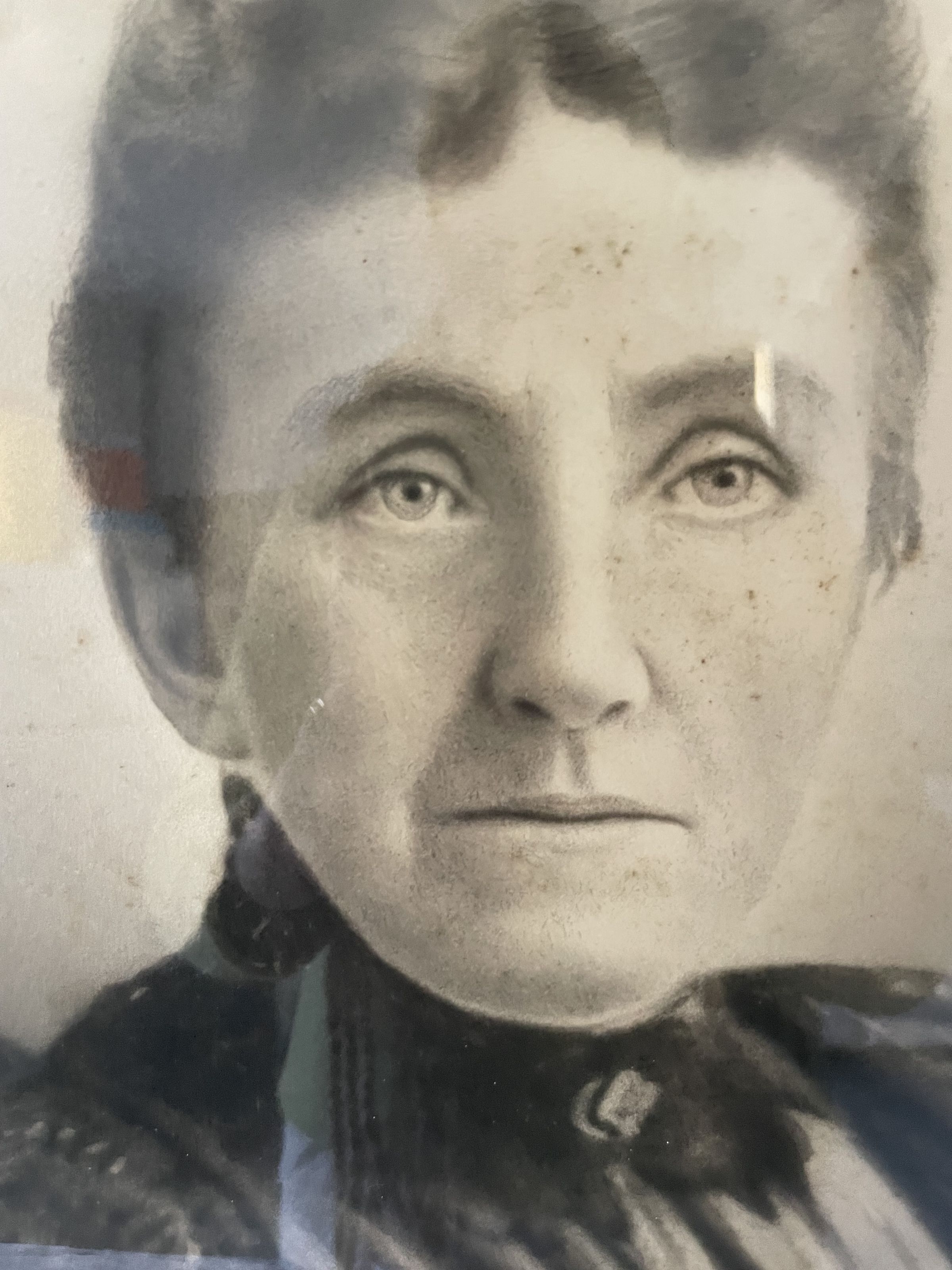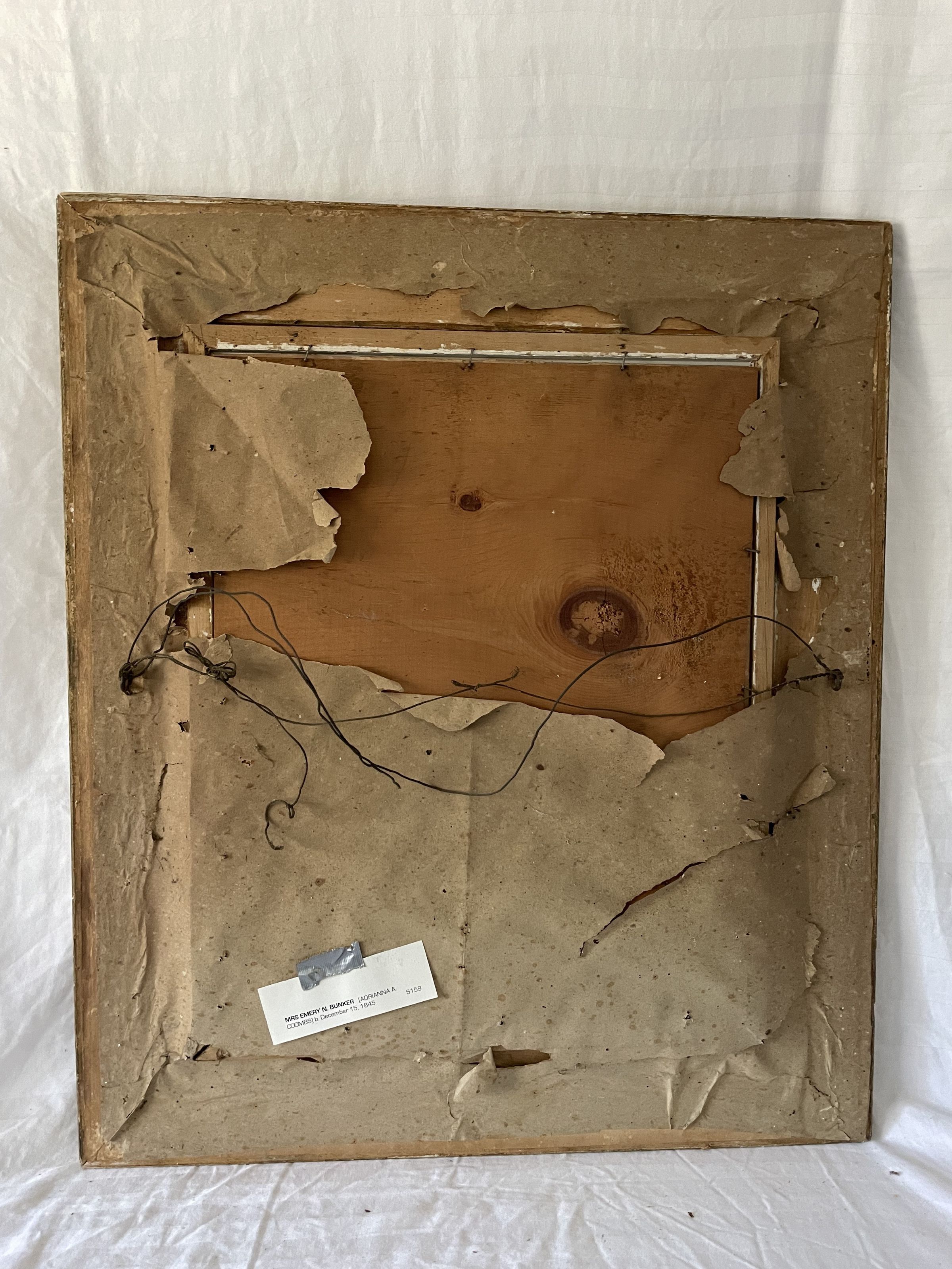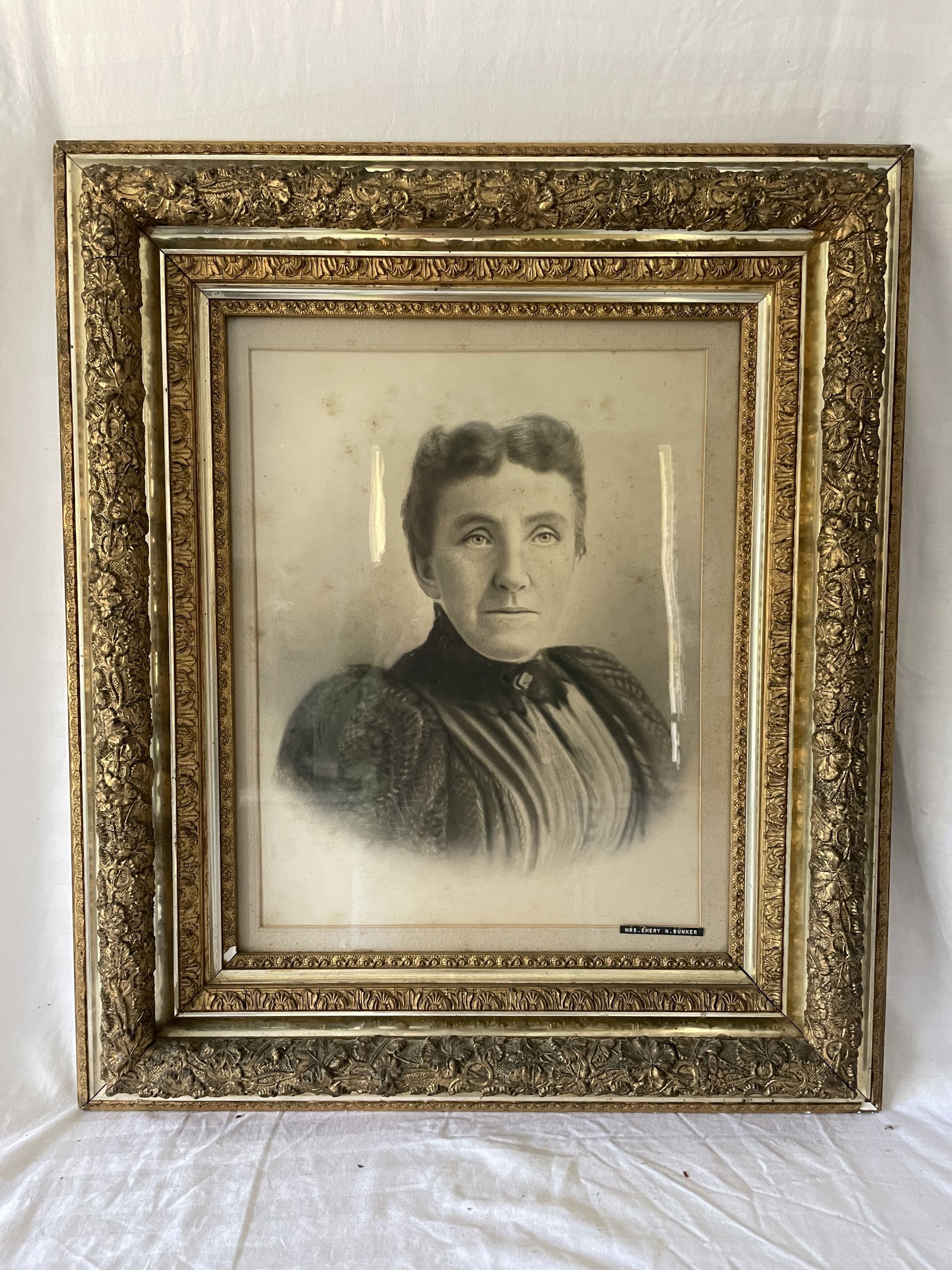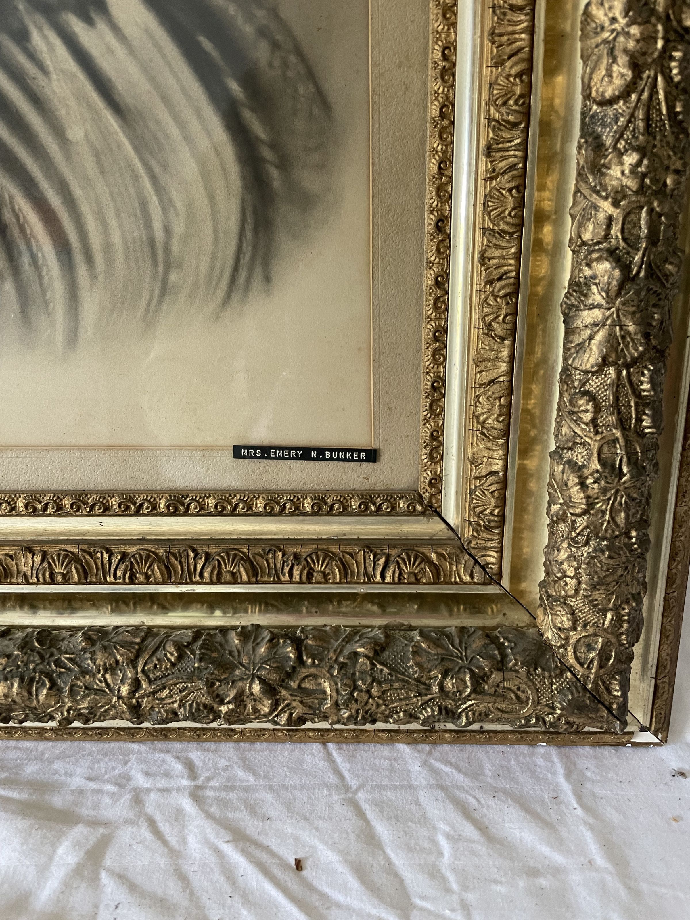 Large framed portrait photograph of a woman, identified as Emory N. Bunker. The portrait is taken from the chest up, and the woman is looking towards (but not at) the camera. She is wearing puffed sleeves and a high neck.
