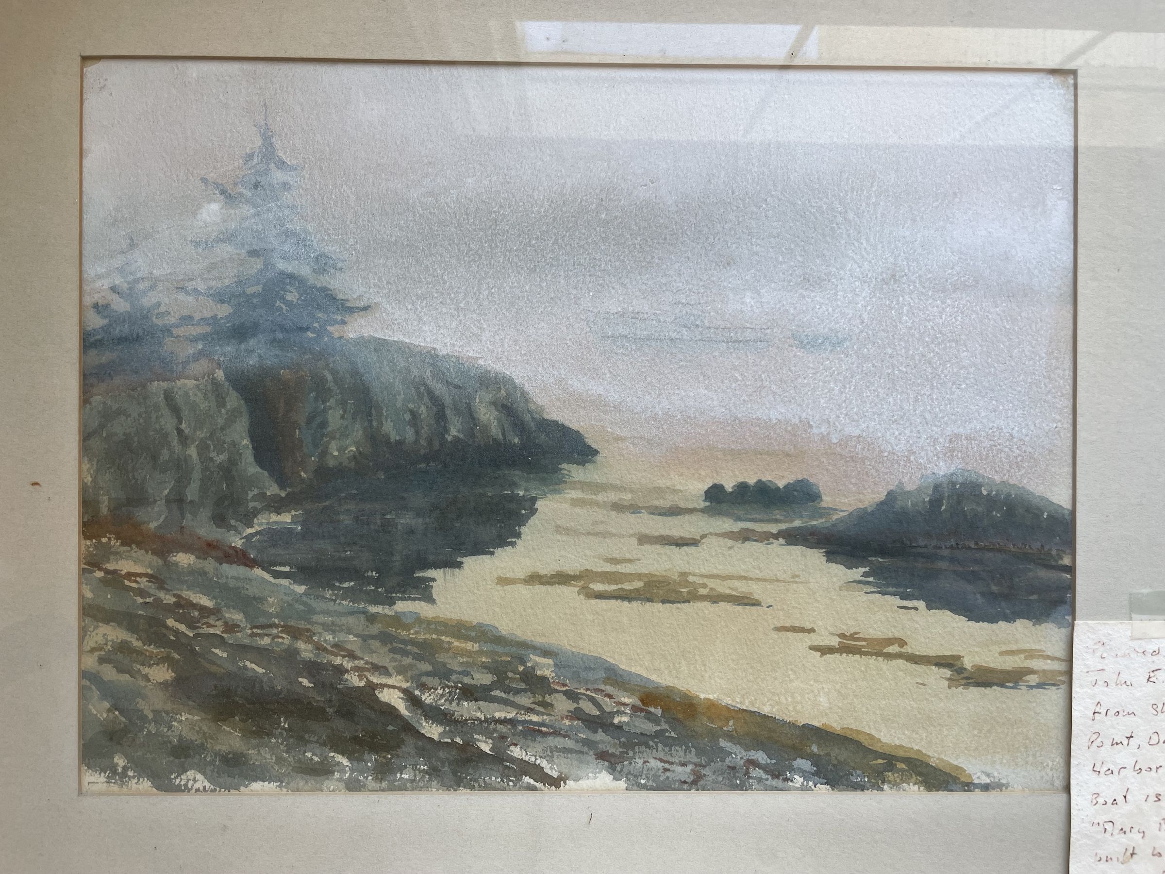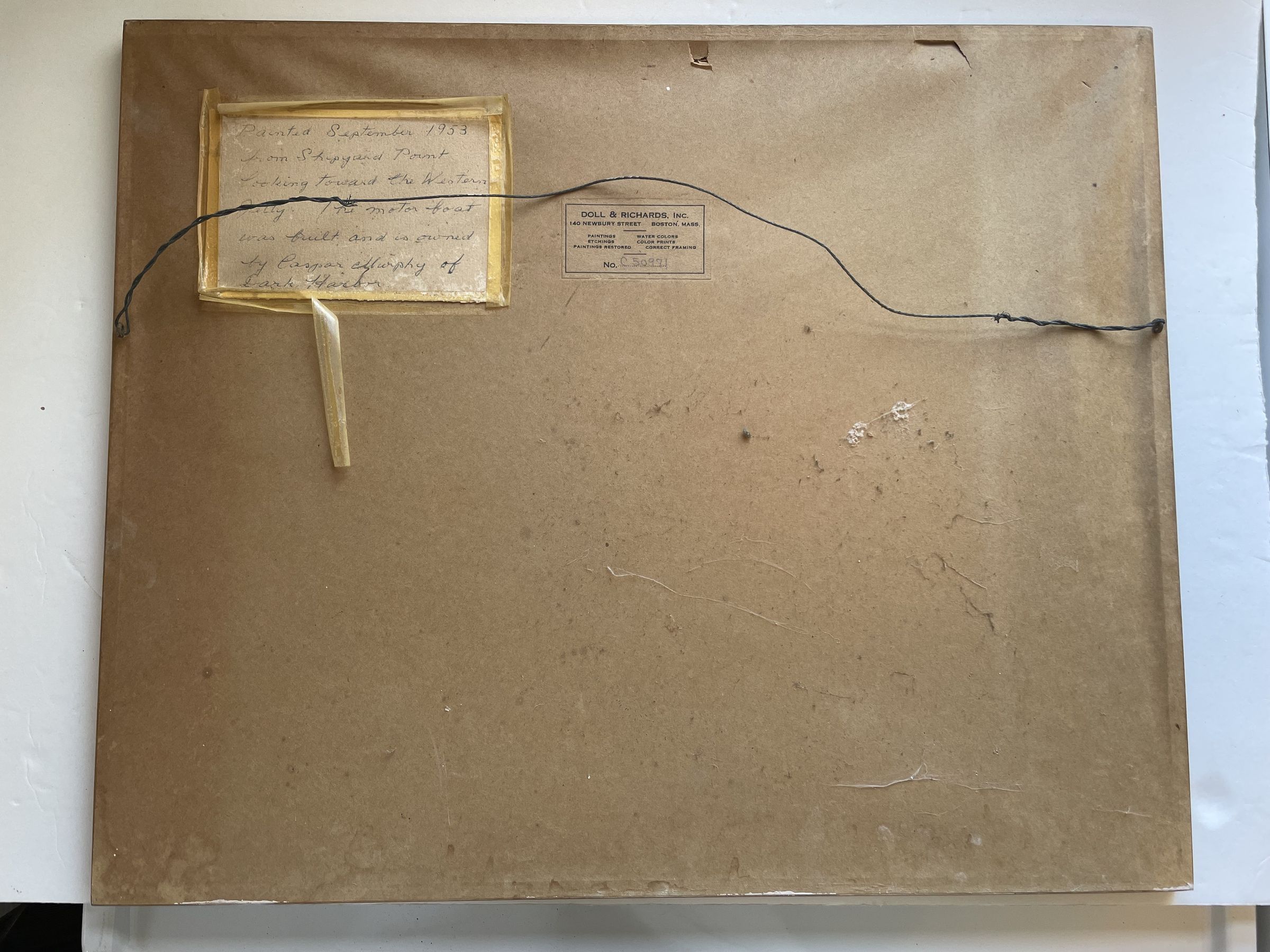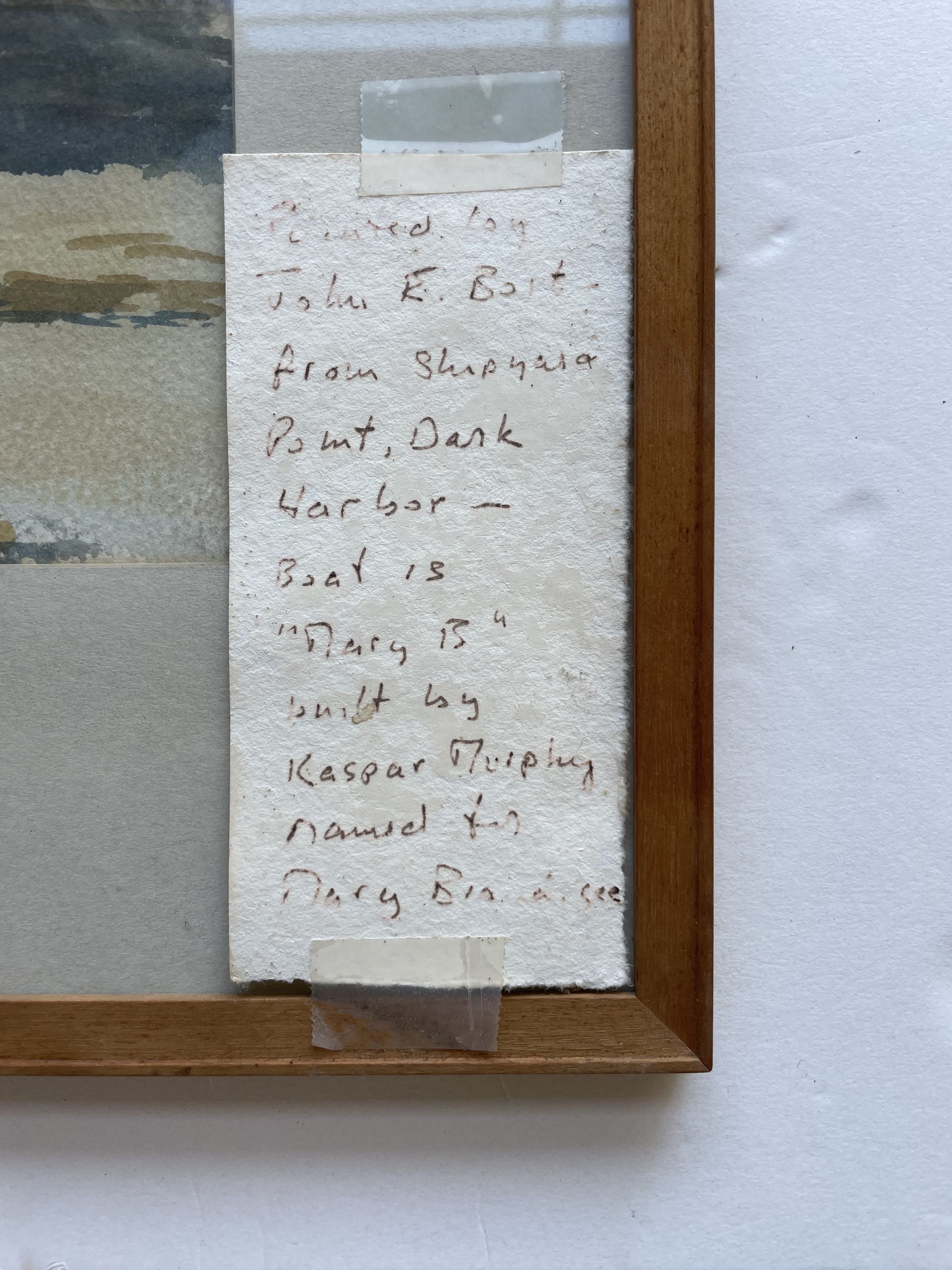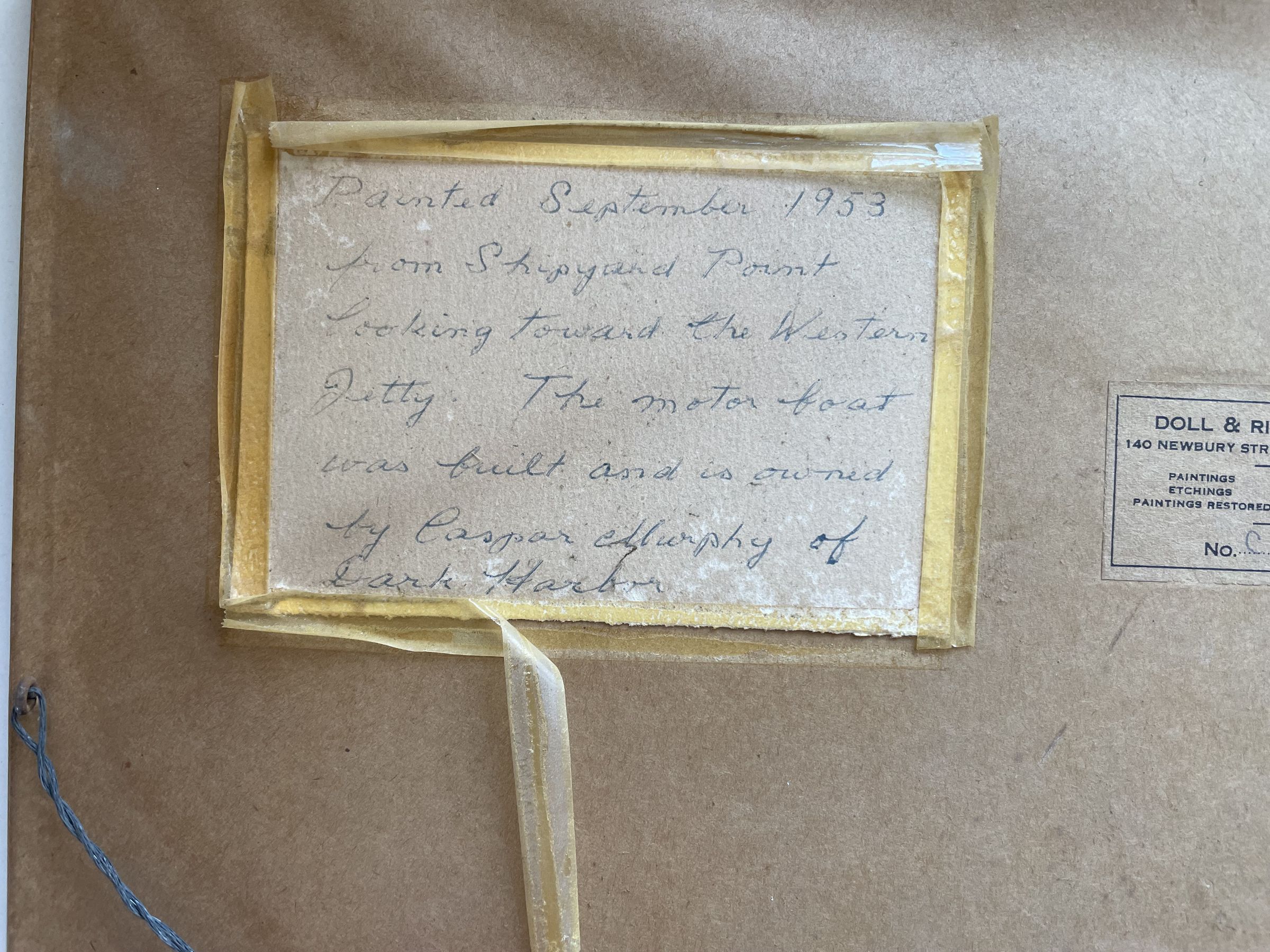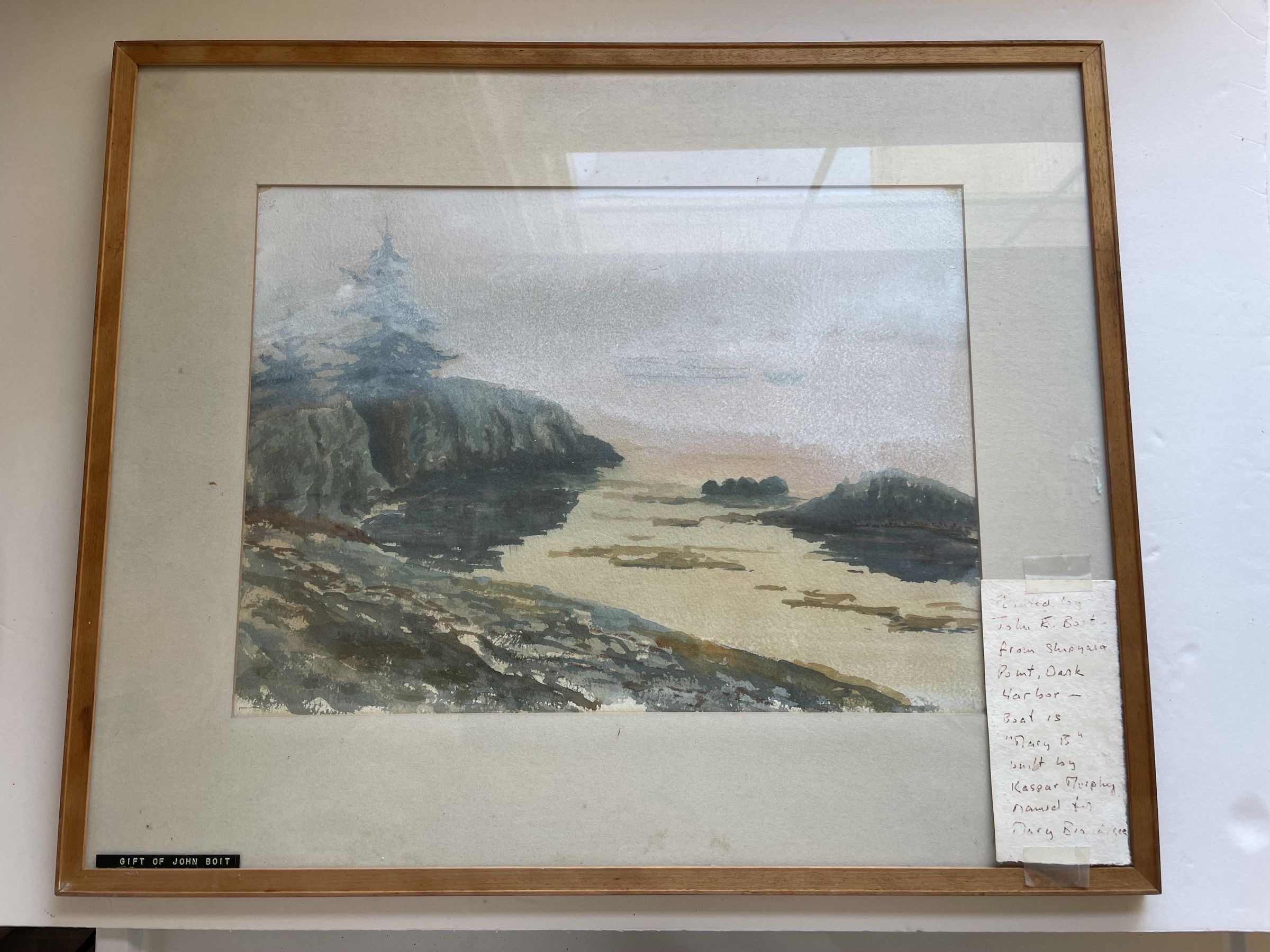 Water color painting of dark harbor by John E. Boit, painted in 1953. The label on the back reads: "Painted September 1953 from Shipyard Point looking towards the Western Jetty. The motor boat was built and is owned by Caspar Murphy of Dark Harbor".