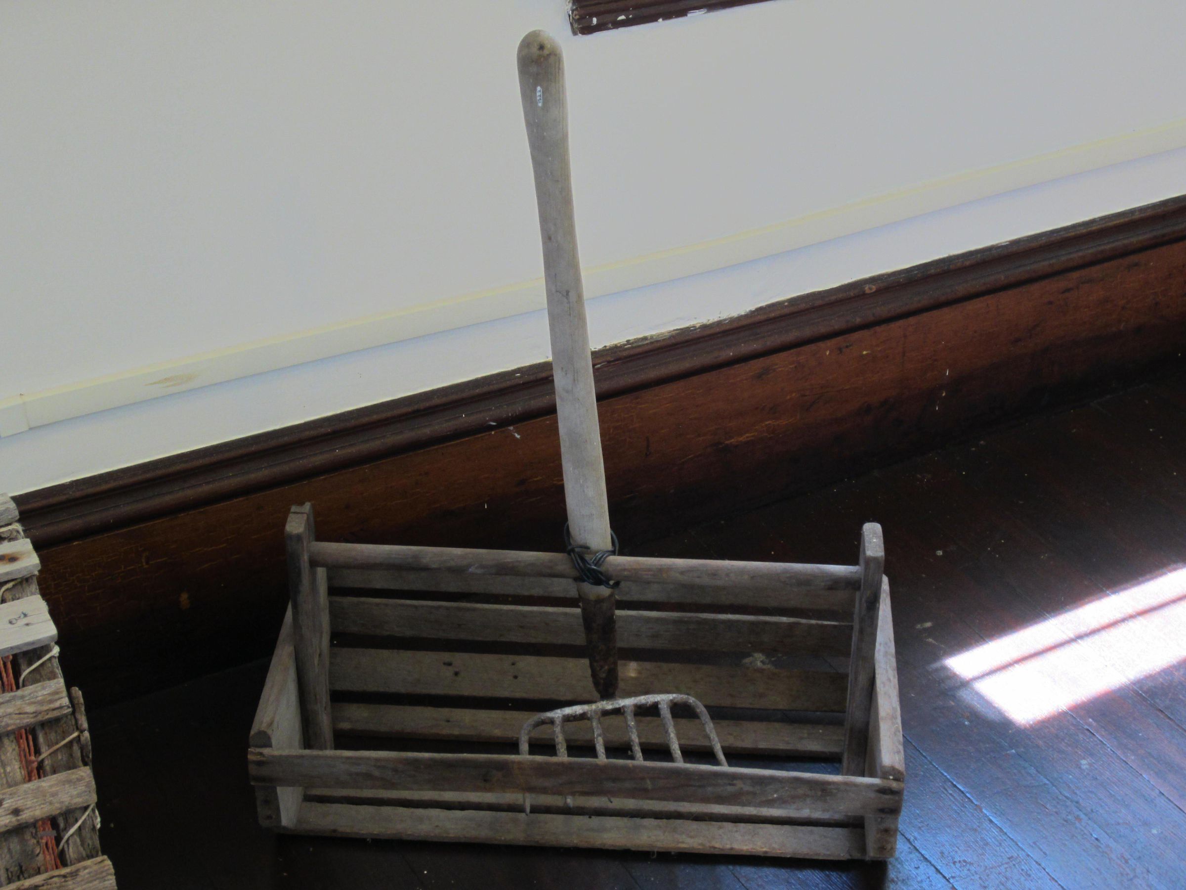 Wooden handle 26 inches long, fitted into a heavy metal sleeve 5 inches long which is attached to six metal tines, each 6 1/2 inches long and slightly curved. aka clamming rake.