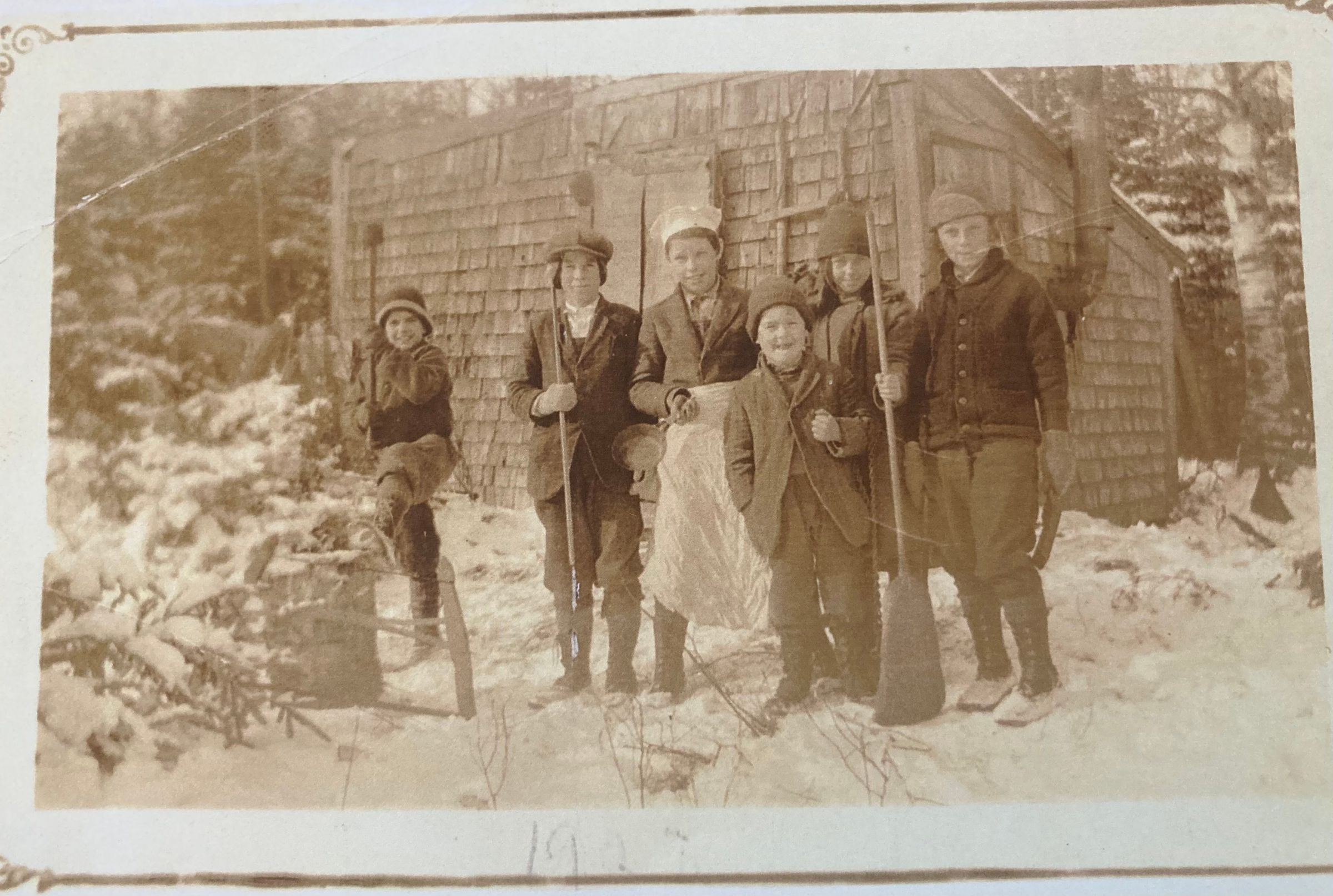 Group photograph of six children, lined up in the snow outside their clubhouse. Notes on the verso by Mary Ella (Rolerson) Grinnell identifiy them: