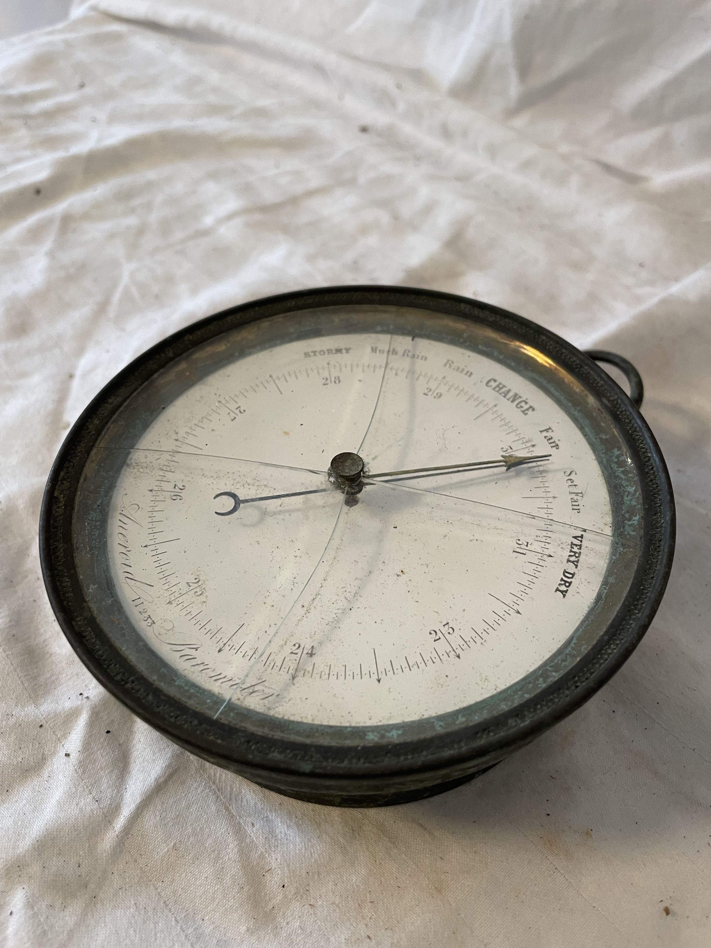 A silver metal barometer used for gauging weather, rainy/stormy/wind