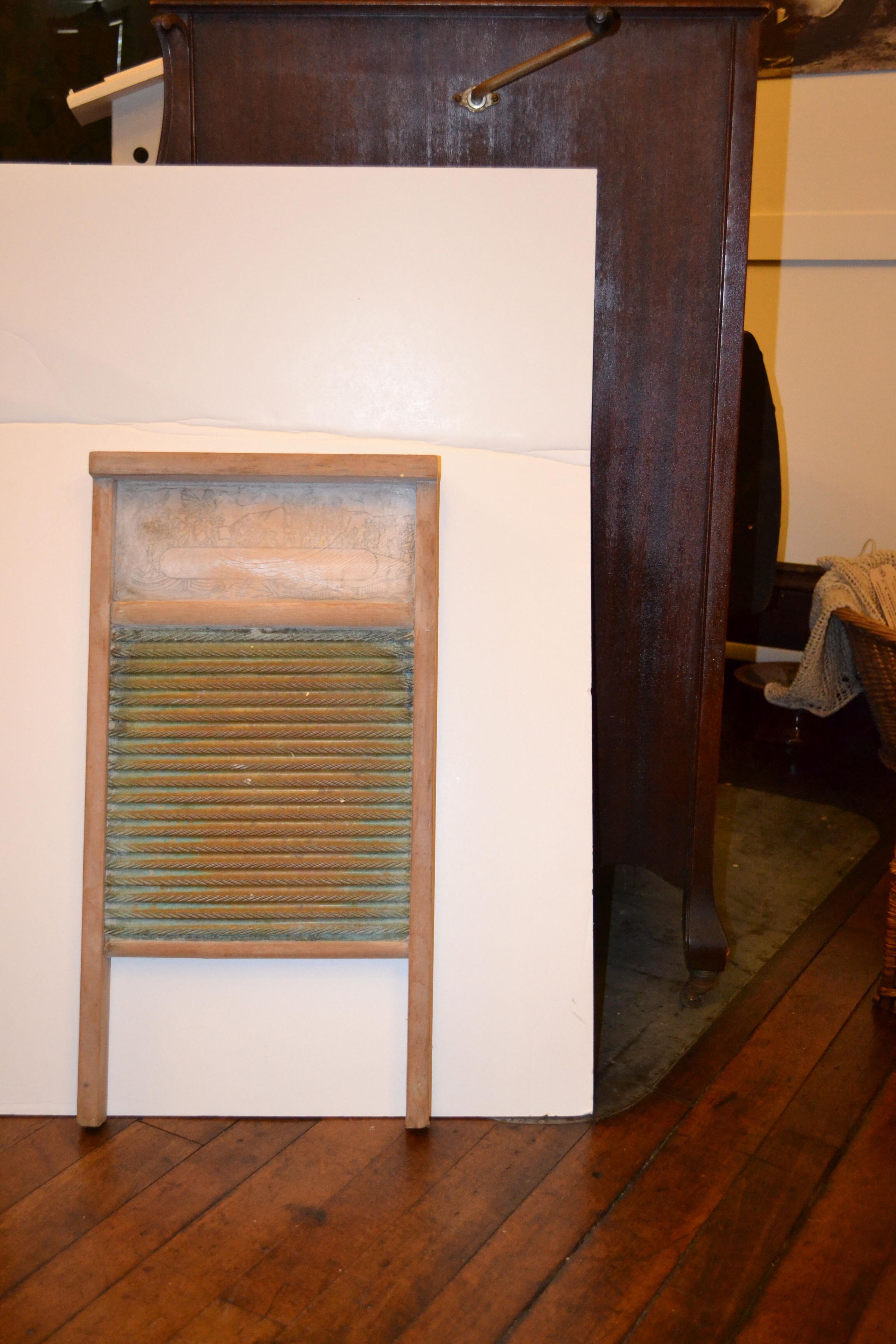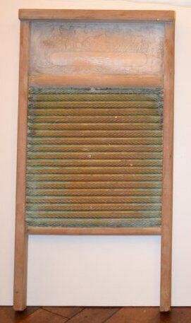 A washboard made with a solid hardwod frame, and protector top. The rubbing surface is made out of a sheet of corrugated brass. The open back is braced with half round rods. The rubbing surface is 10 3/4 inches x