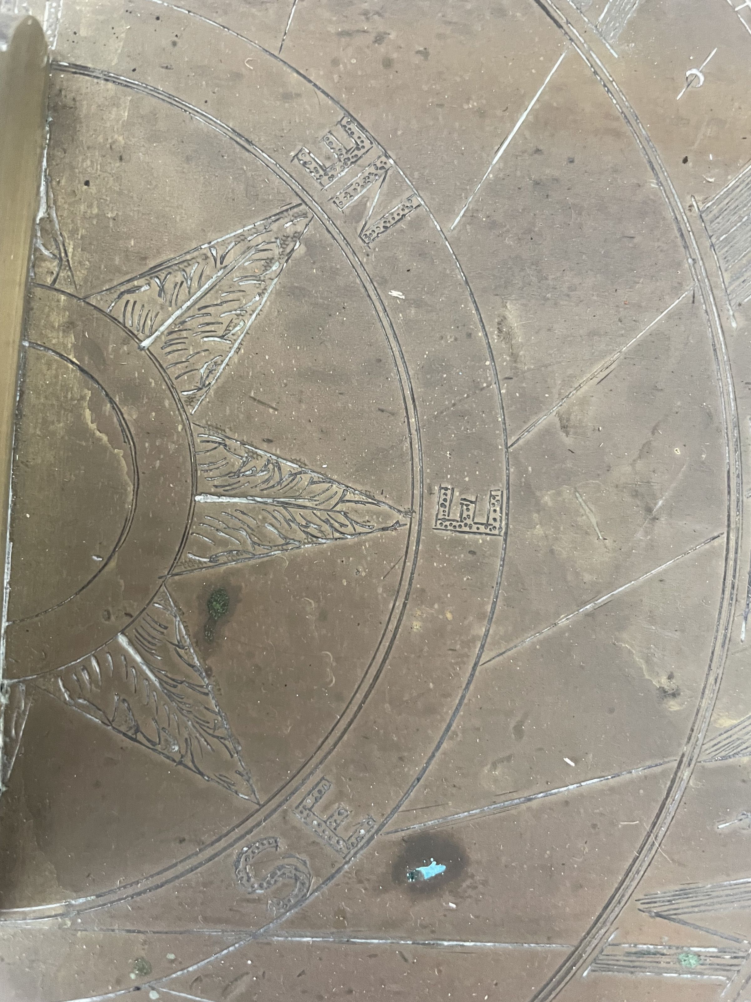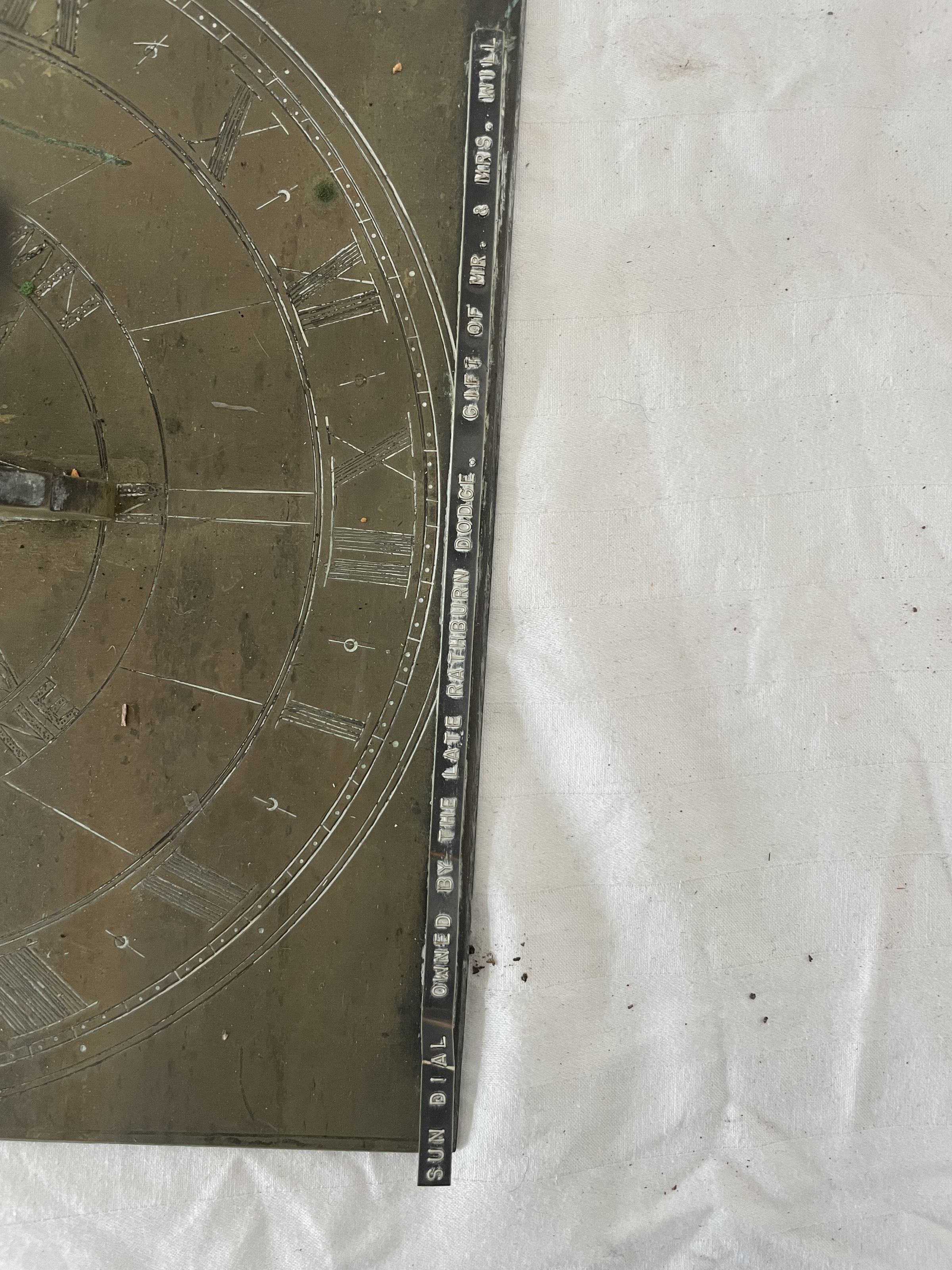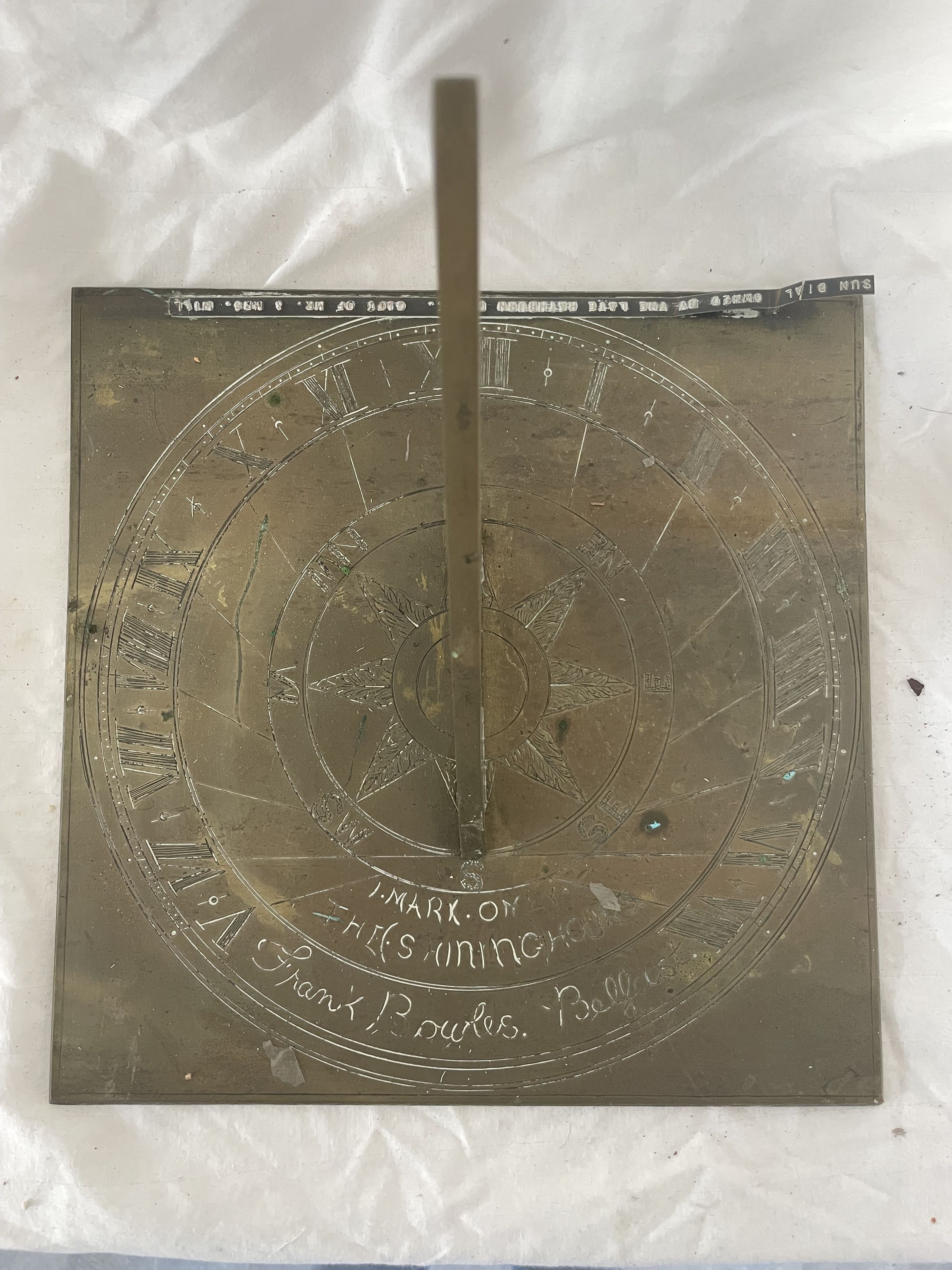 A square based sundial made from brass. The dial reads: "I mark only the shining hours"
