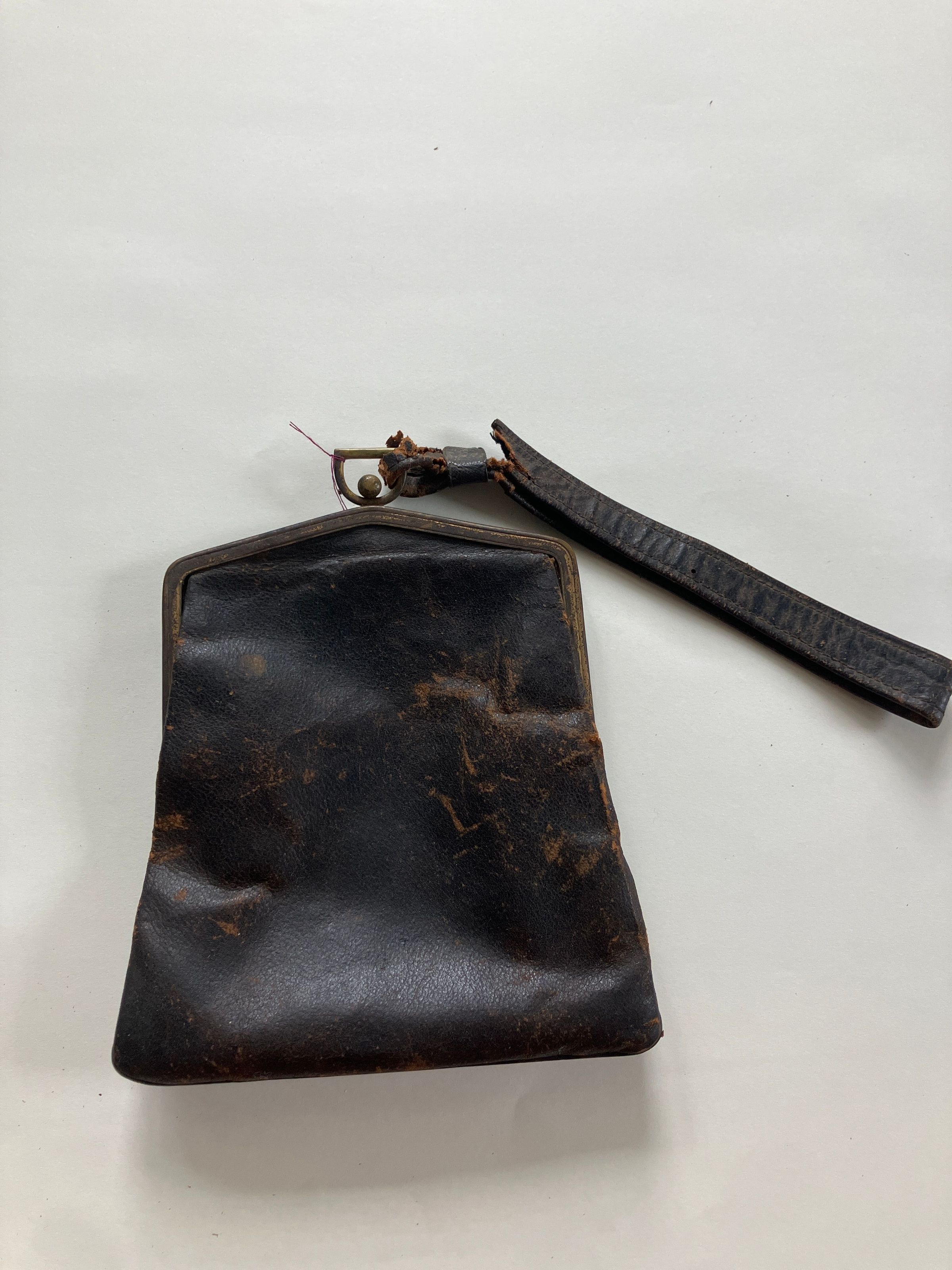 5 3/4 inches wide at bottom and 4 1/2 inches wide at top. Metal clasp and rim at top. Ring at top holding a looped black leather strap for easy carrying. The inside is lined wih deep pink cloth.