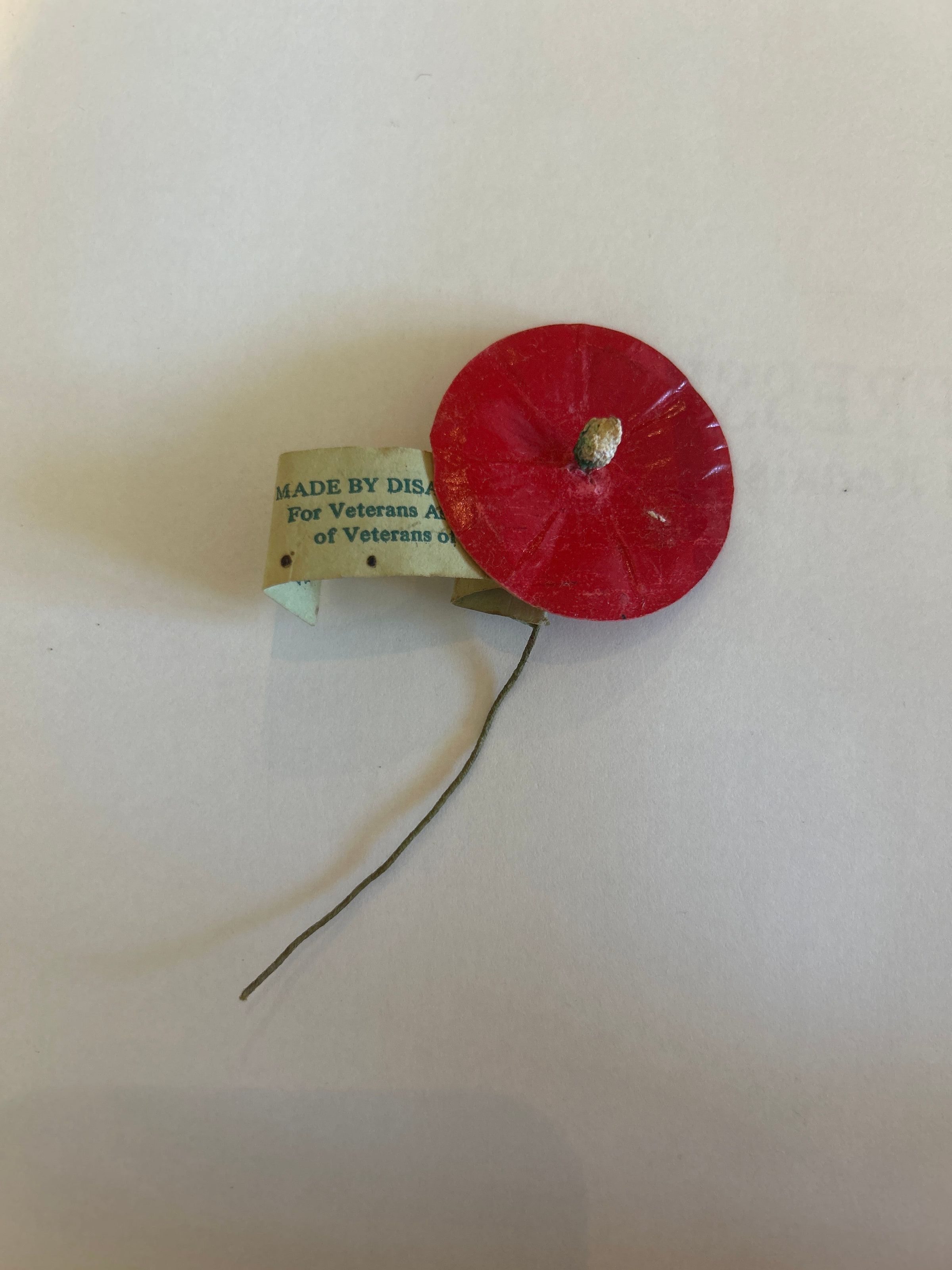 INSCRIPTION: On tag attached to stem: front, "Buddy" Poppy Trade Mark Reg. U.S. Patent Office ''Wear It Proudly' ; reverse side, "Made by Disabled Veterans for Veterans Assistance Program of Veterans of Foreign Wars." Each side of tag has the insignia of the Veterans of Foreign Wars.