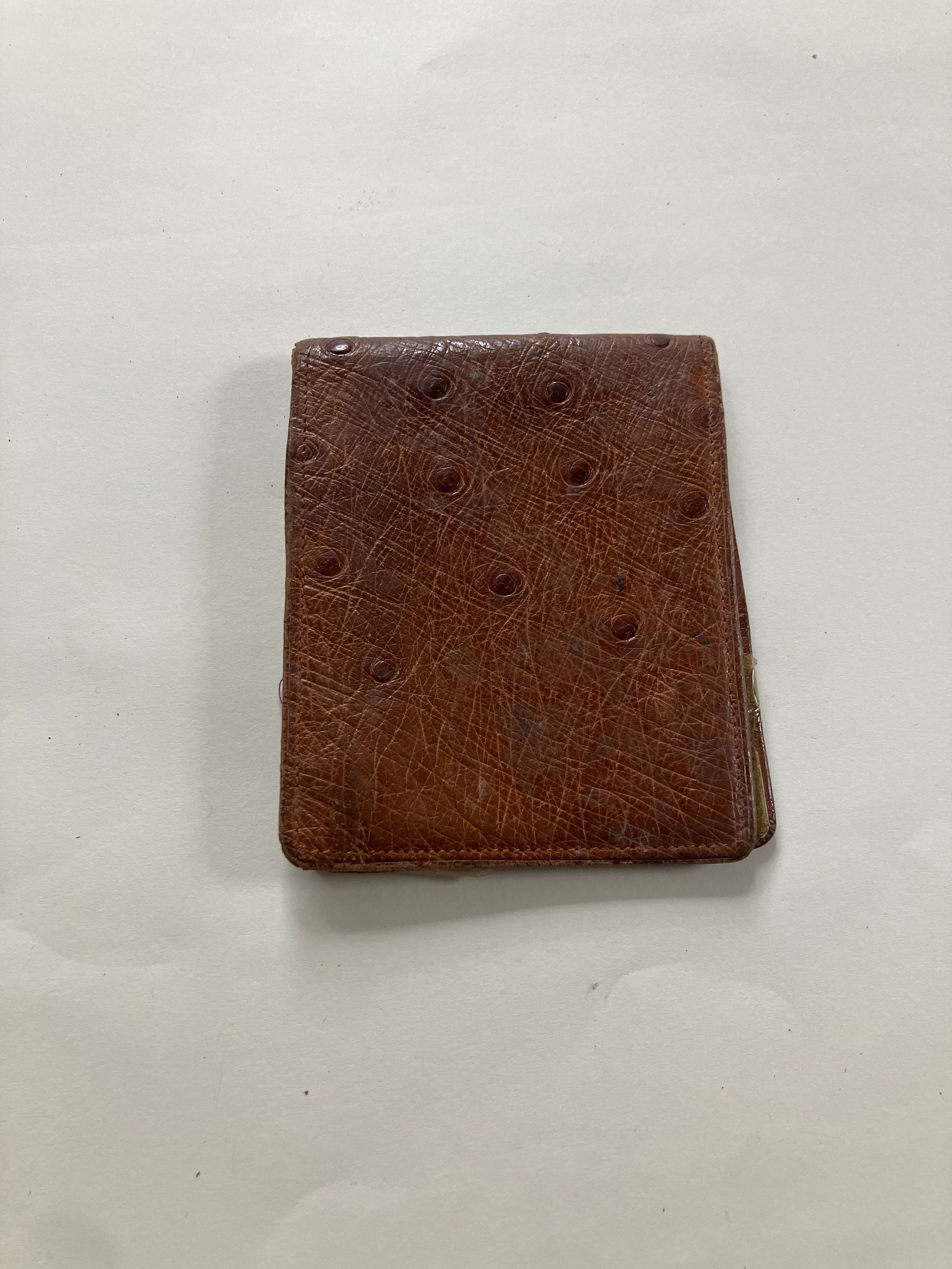 Brown leather folding wallet 9 7/8 inches x 3 1/2 inches (unfolded). Inside,