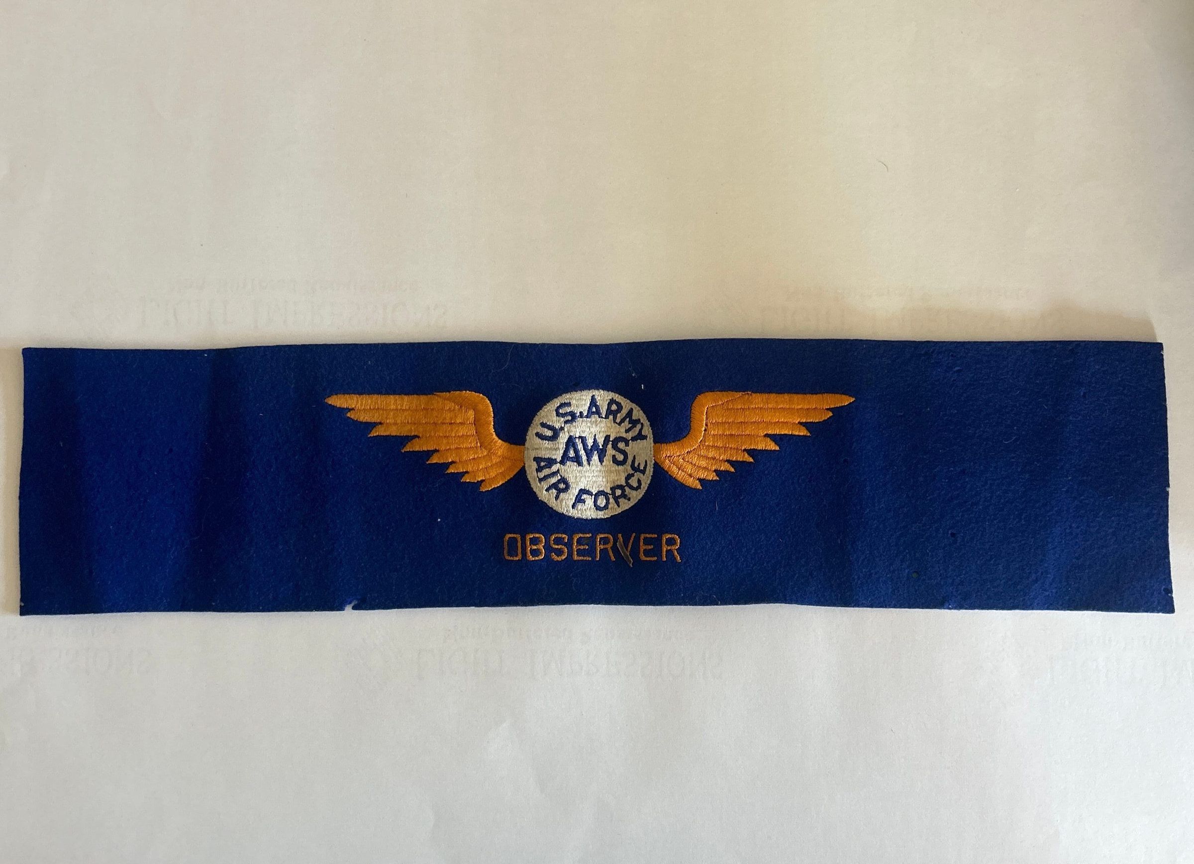Insignia in center of band, consisting of white circle from which extend two yellow outstretched wings. In the middle of the circle is the inscription given below.