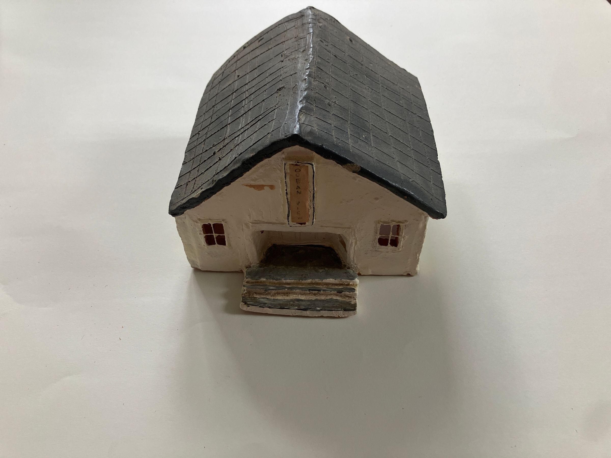 Ceramic model of the Ocean View Theater. White with green roof. 5 1/4 inches x 5 inches, roof 3 3/4 inches at peak. Roof has cross striations representing roofing shingles. The building has 4 windows on each side and 2 on either end. The front has a sign over the door "OCEAN VIEW", recessed door with steps leading out. The back has a large opening with a small window over the opening besides the 2 windows. All the windows have divisions indicating window panes.