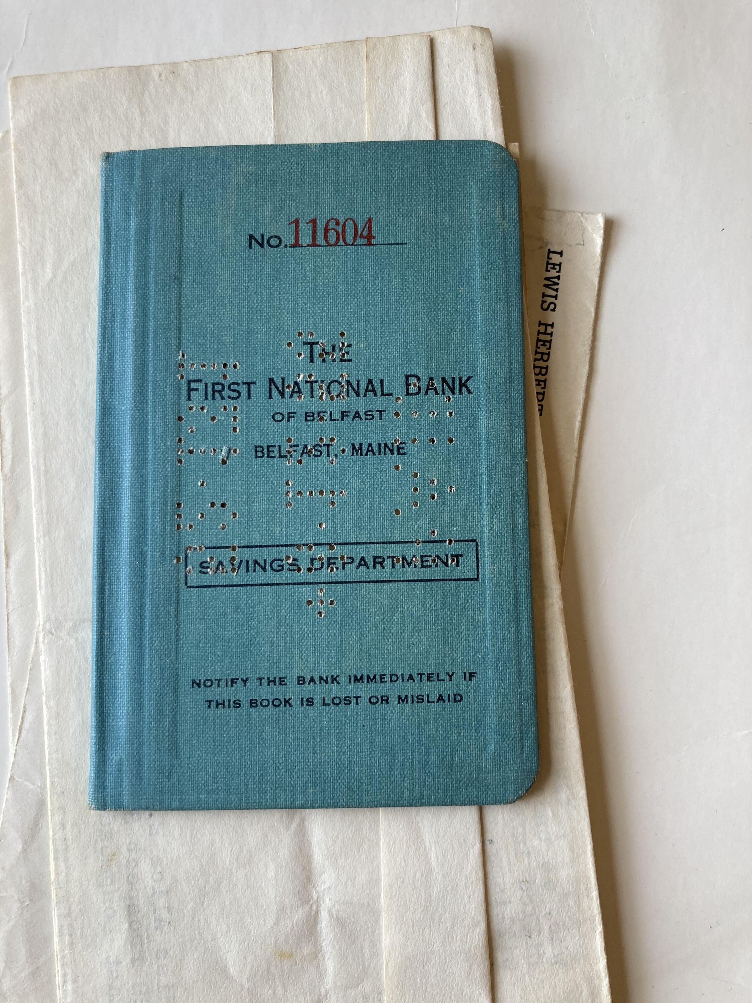 1. Bank book from the First National Bank of Belfast in the name of Alice E. Williams, Trustee, Costello M. Williams Monument Fund, 88 Prospect Street, East Longmeadow, Mass. Entries start in December of 1941 and run through August 1955.