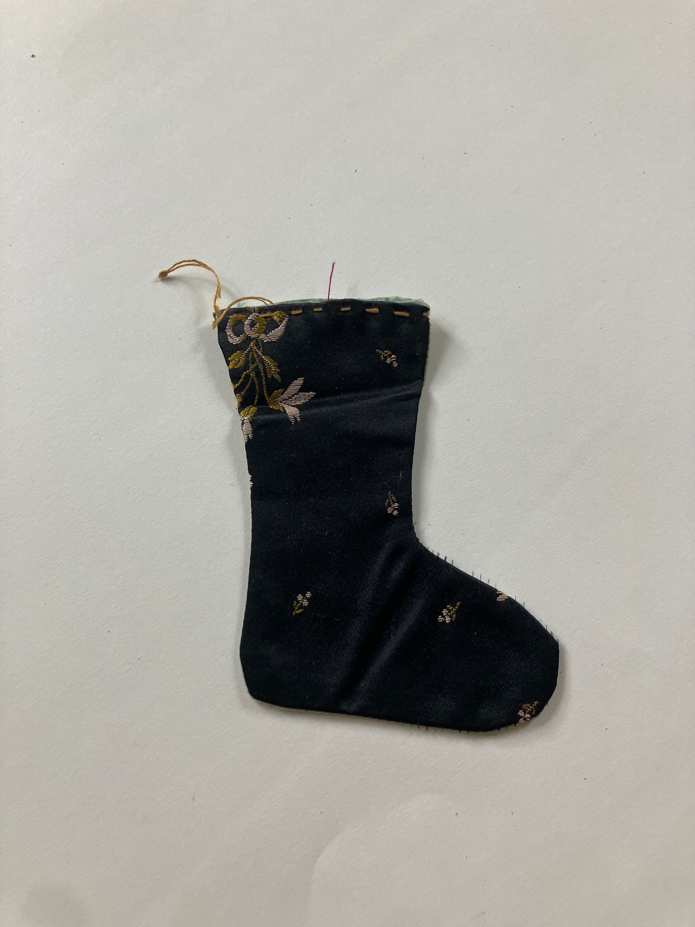 A small pouch in the shape of a sock. The front is made of black silk with a floral pattern, the back of light green.