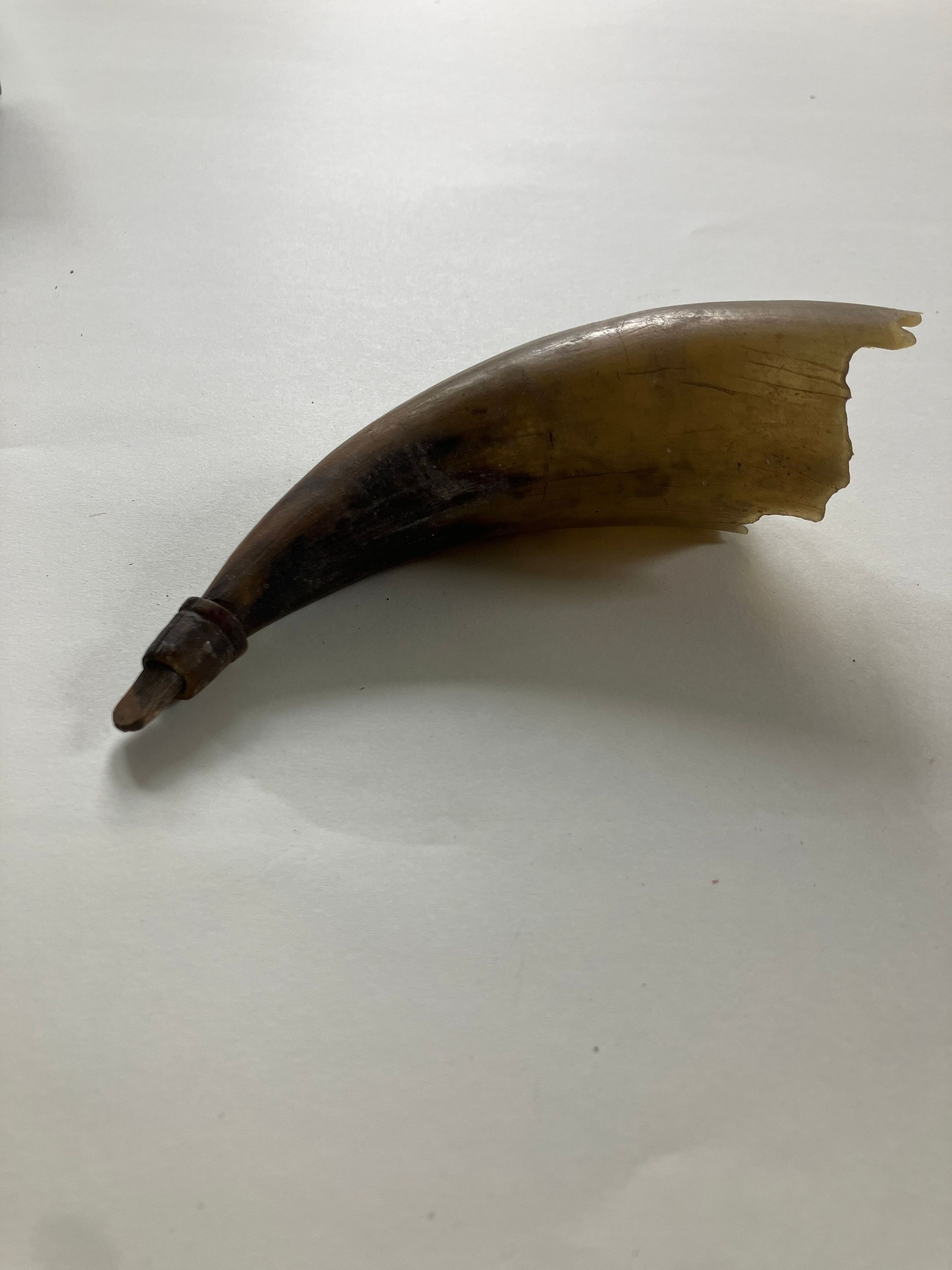 Powder horn possibly made of cow's horn. Curved, slightly oval, hollow horn,