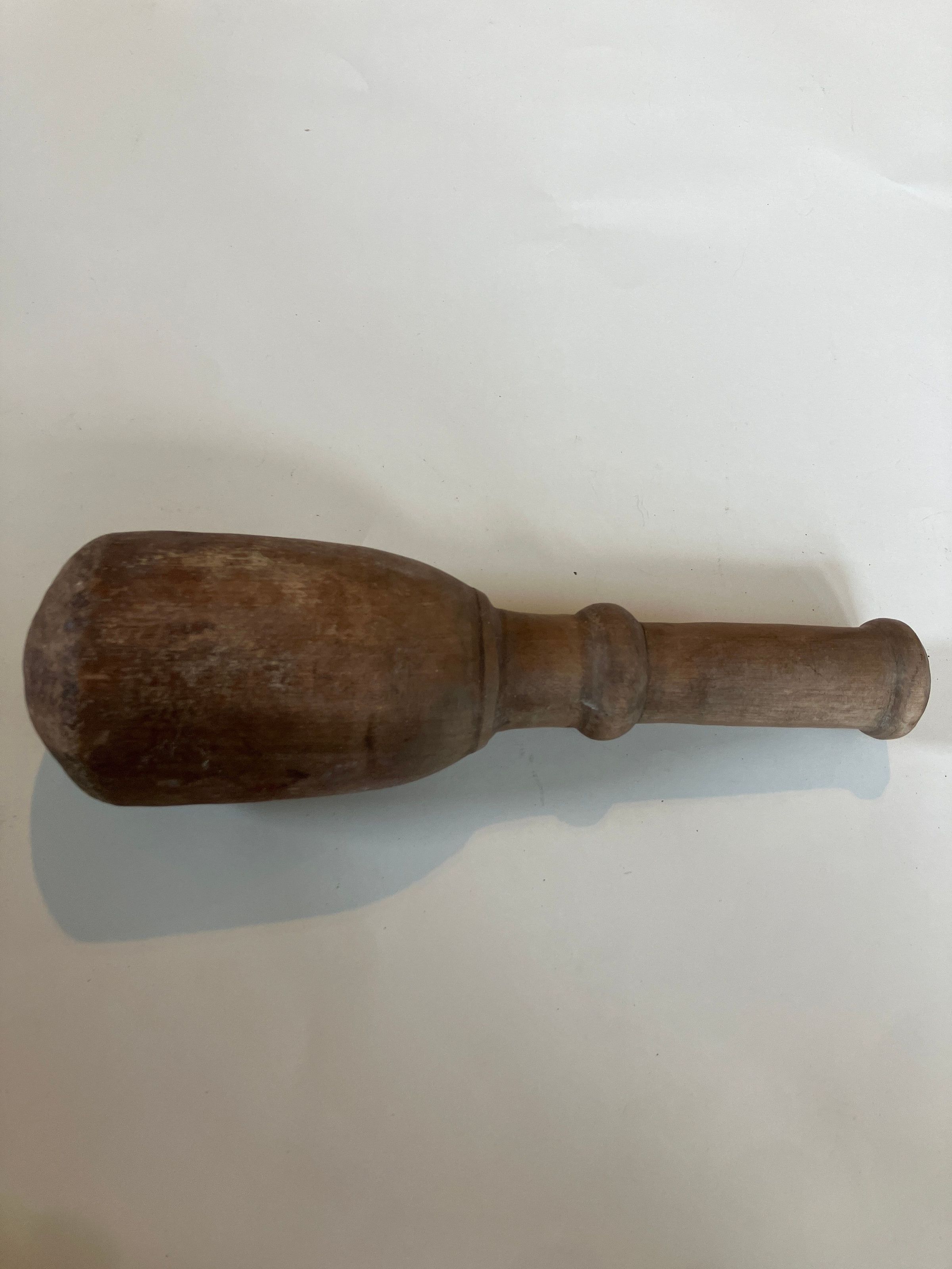 Pestle made from one piece of wood. Round handle 5 inches long. "Bowl" approximately 5 inches long and 10 inches in circumference at its widest.