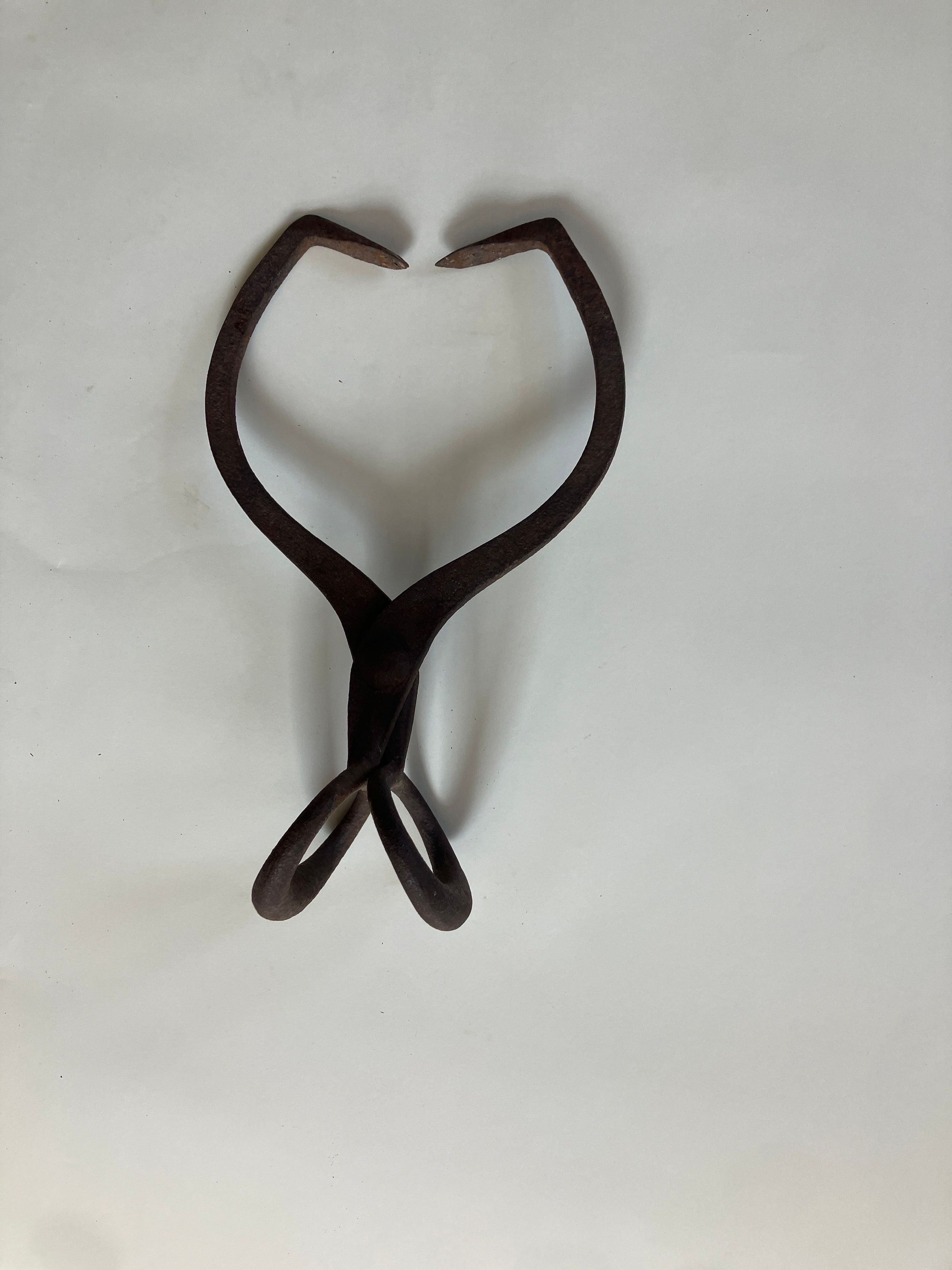 Measures 13 inches x 8 inches when closed. Two pieces of iron each with an oval handle and a curved piece ending in a prong at right angles to the piece. The two pieces are held together with a bolt.