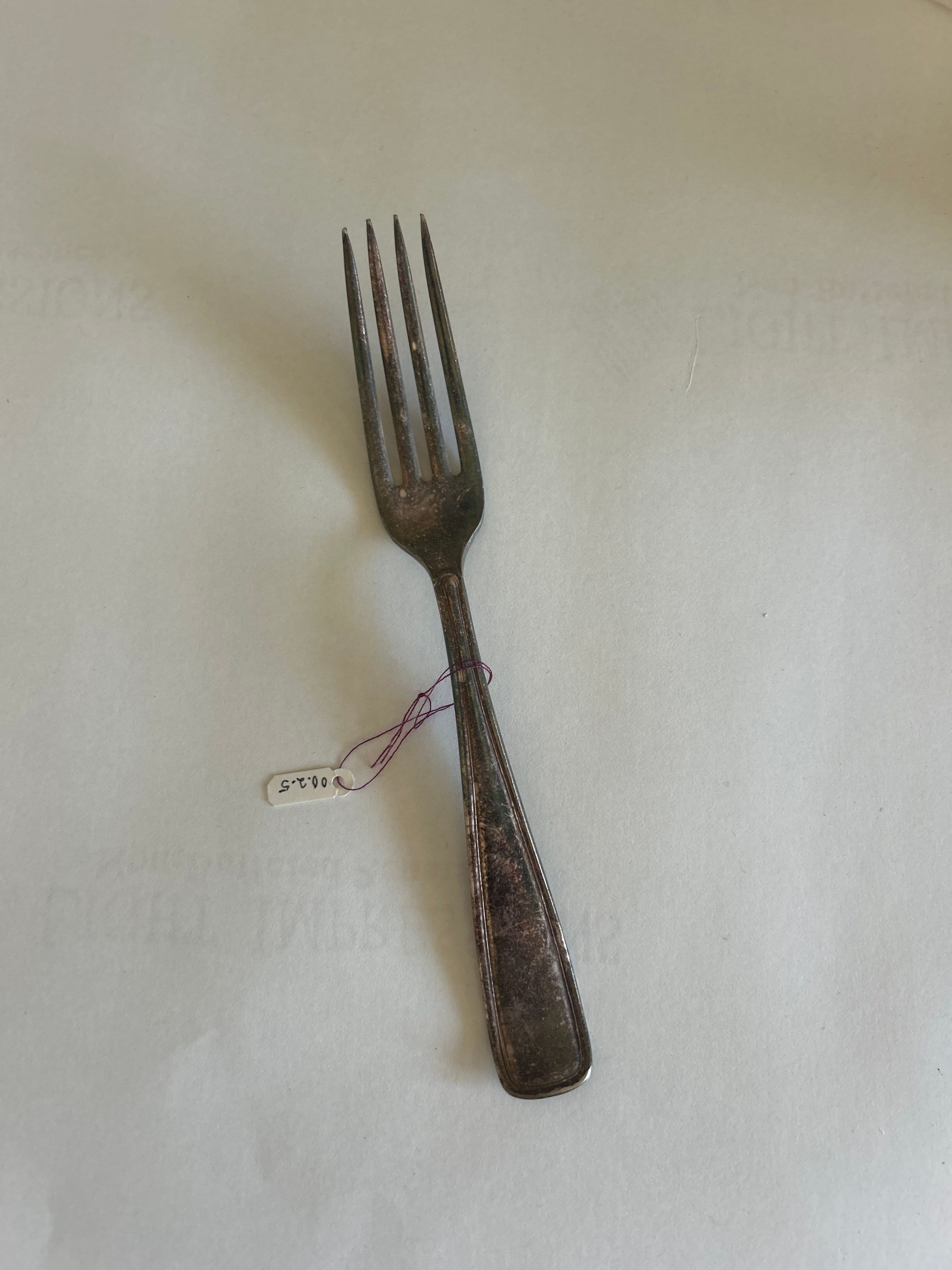 Handle has a groove on its edge and is approximately 4 1/4 inches long and the tines (4) are approximately 2 inches long. INSCRIPTION: "HOLMES & EDWARDS 9 ISLESBORO INN"