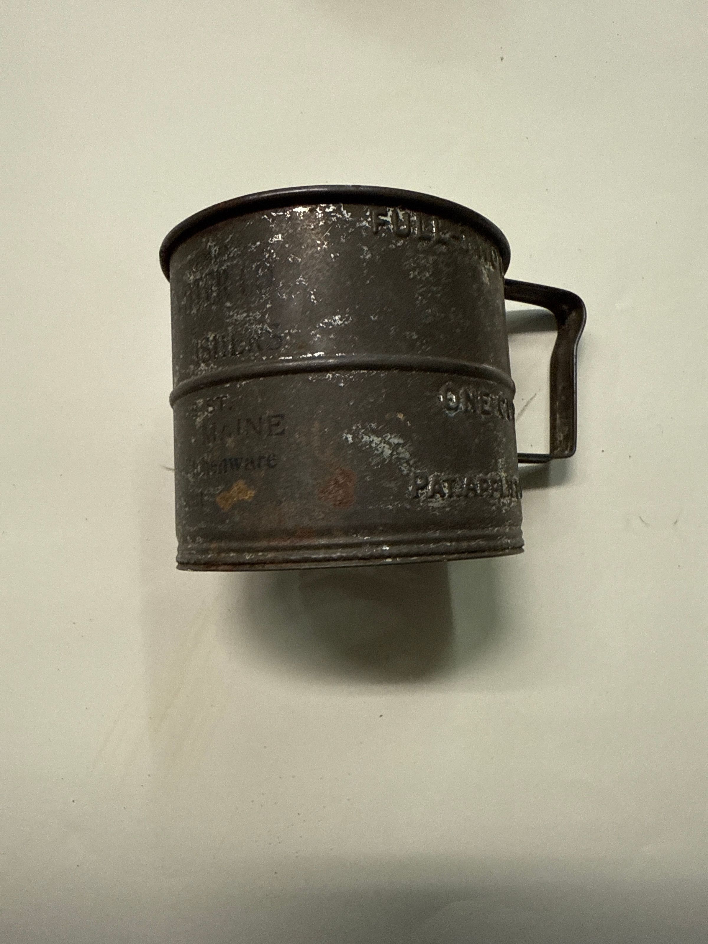 3 1/2 inches in diameter, 3 1/8 inches high. Screen at bottom of sifter. Handles 2 1/8 inches x 1 1/4 inches. The paddle is part of the handle. When the handle is moved back and forth the paddle also moves and pushes the flour through the screen.