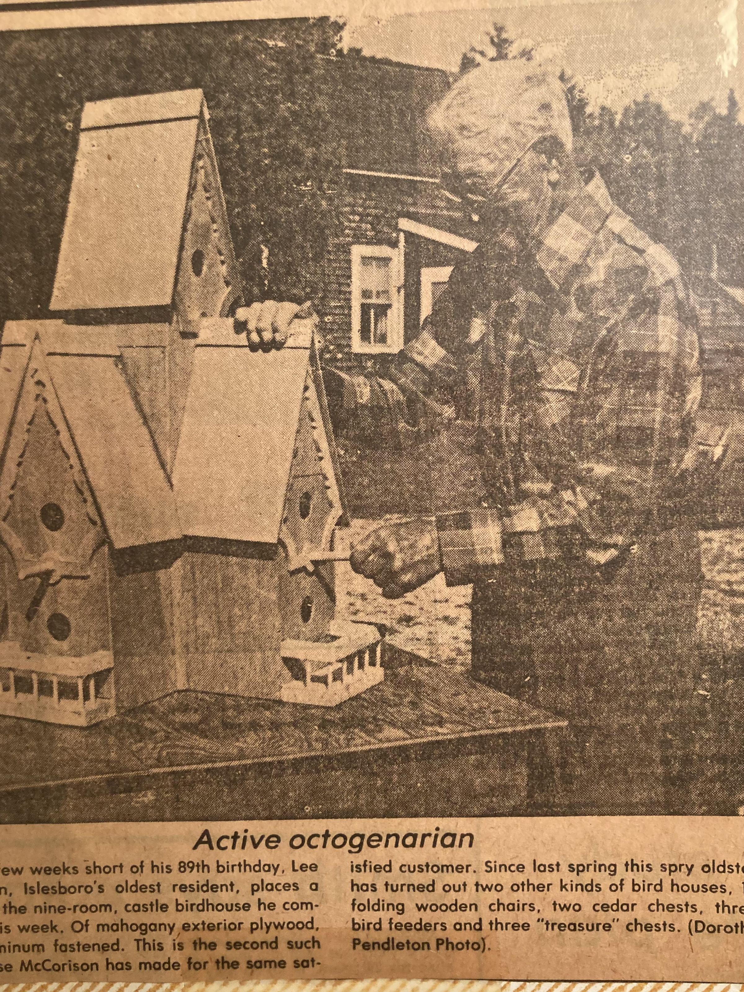 "Active Octogenarian," Bangor Daily News, September 30, 1981 (photo of Lee McCorison putting finishing touches on his nine-room "castle" birdhouse).