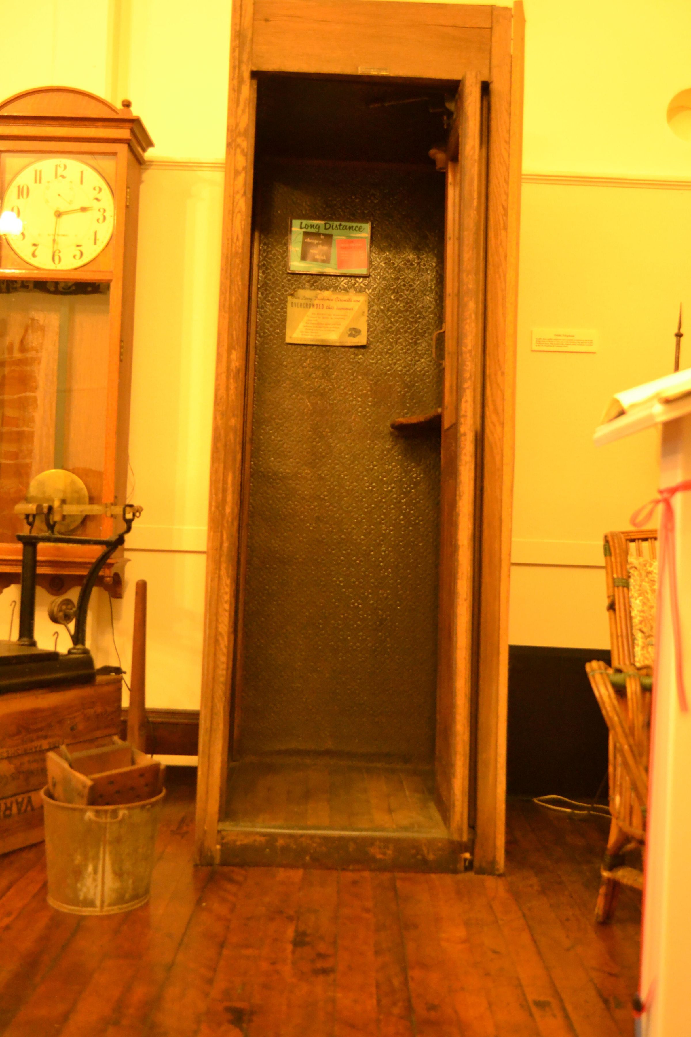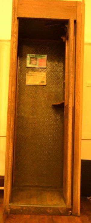 Pressed metal interior. Wood shelf to hold phone. Cream colored ceremic light fixture in back right corner. Two paper signs, one framed, one taped to interior, advertising long distance.