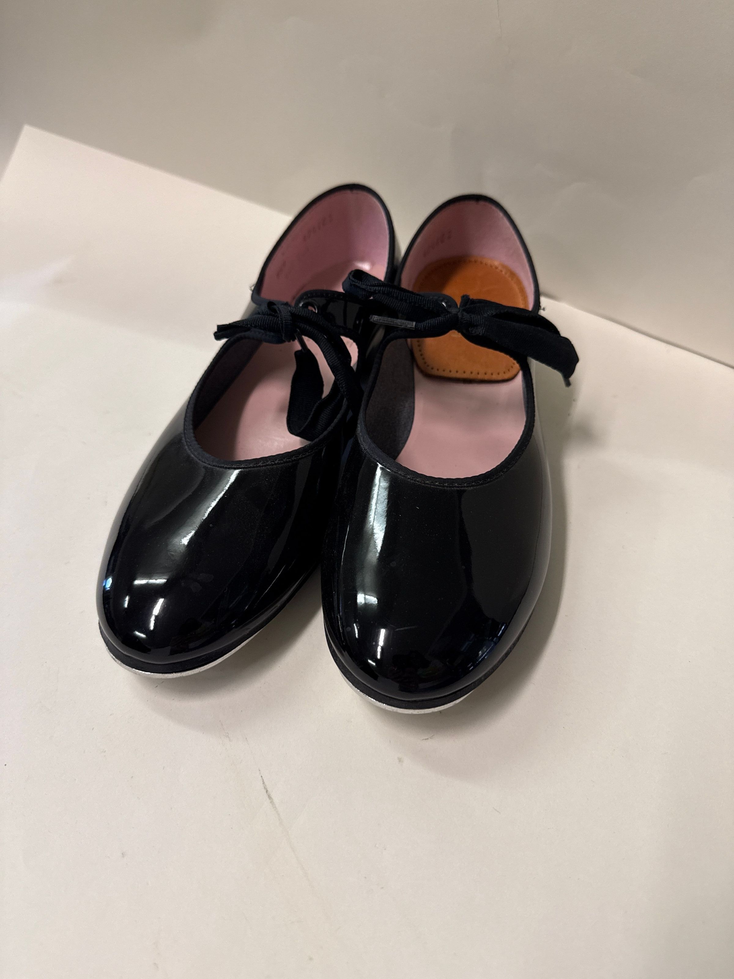 Pair of black patent leather tap shoes, size 9 1/2. Black ribbon shoe strings. Pink interior. Left shoe has added leather heel support.
