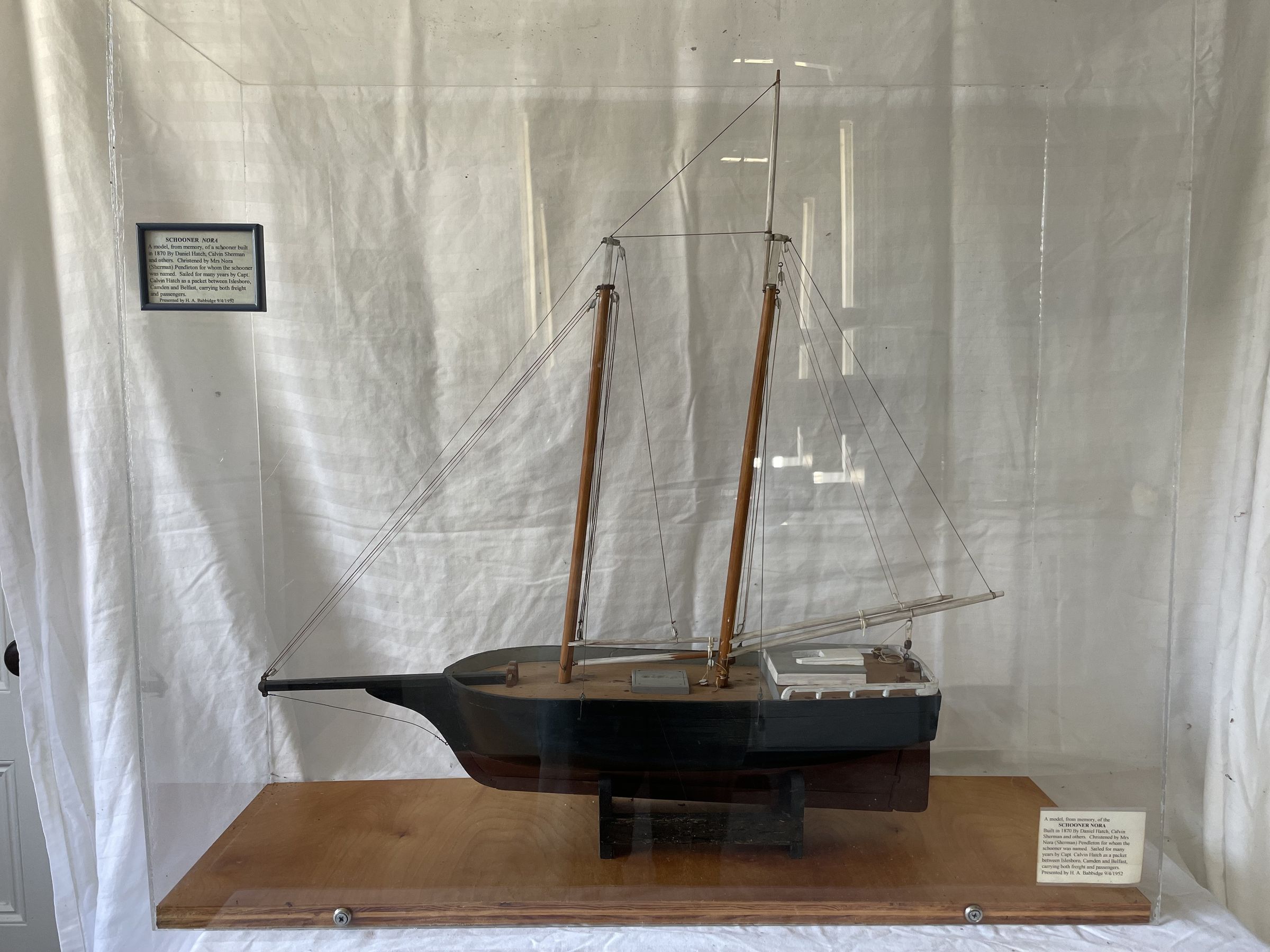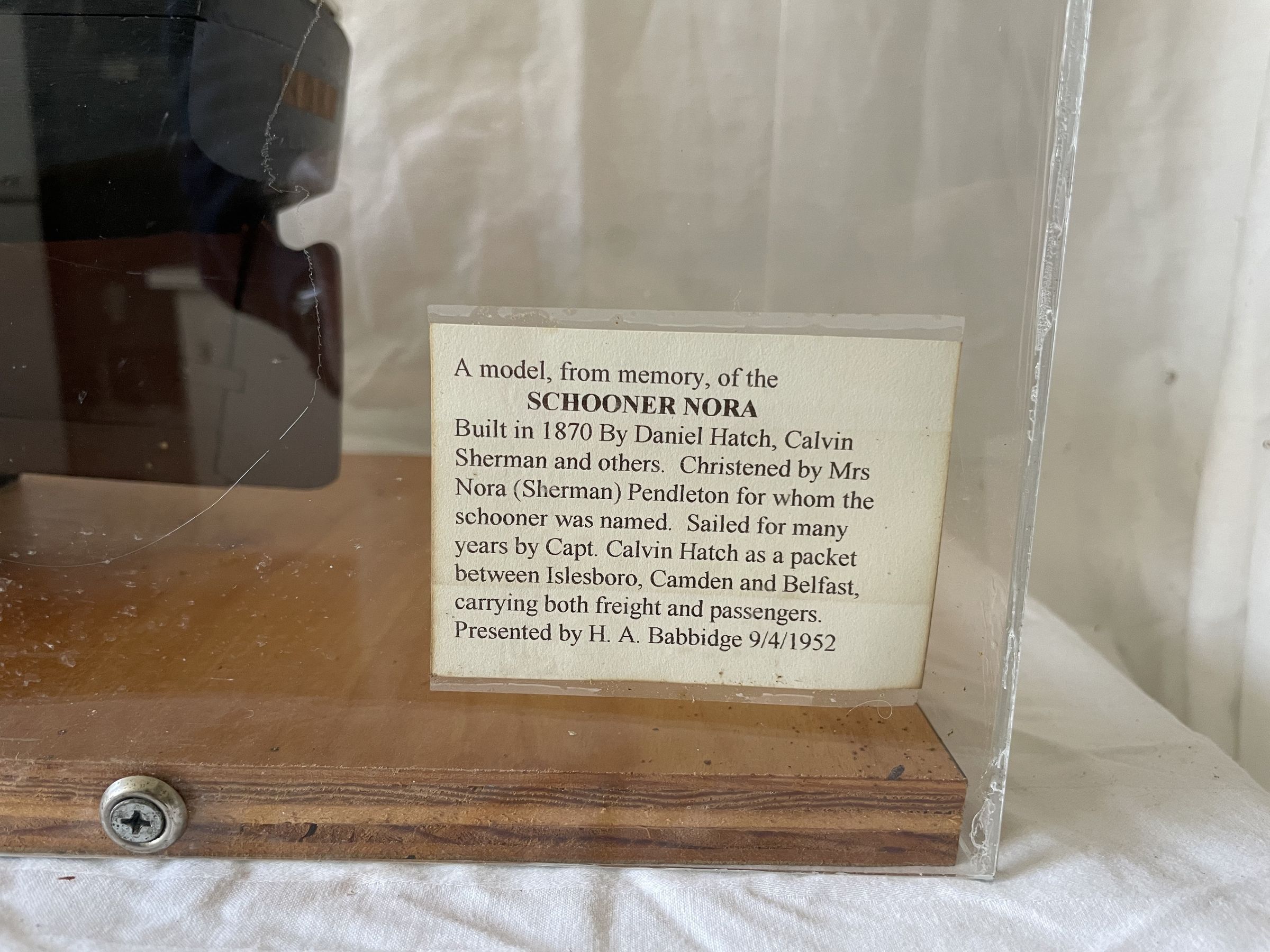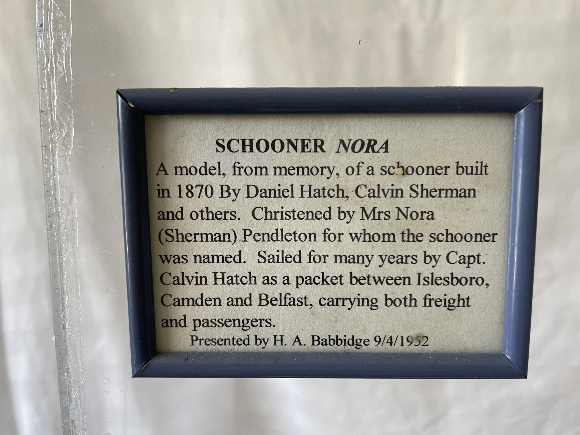 " A model made from memory of the Schooner Nora. Built in 1870 by Daniel Hatch, Calvin Sherman, and others. Christened bu Mrs Nora (Sherman) Pendleton whom the schooner was named. Sailed for many years by capt. Calvin Hatch as a packet between Islesboro, Camden, Belfast, carrying both freight and passengers. Presented by H. A. Babbidge 9/4/1952"