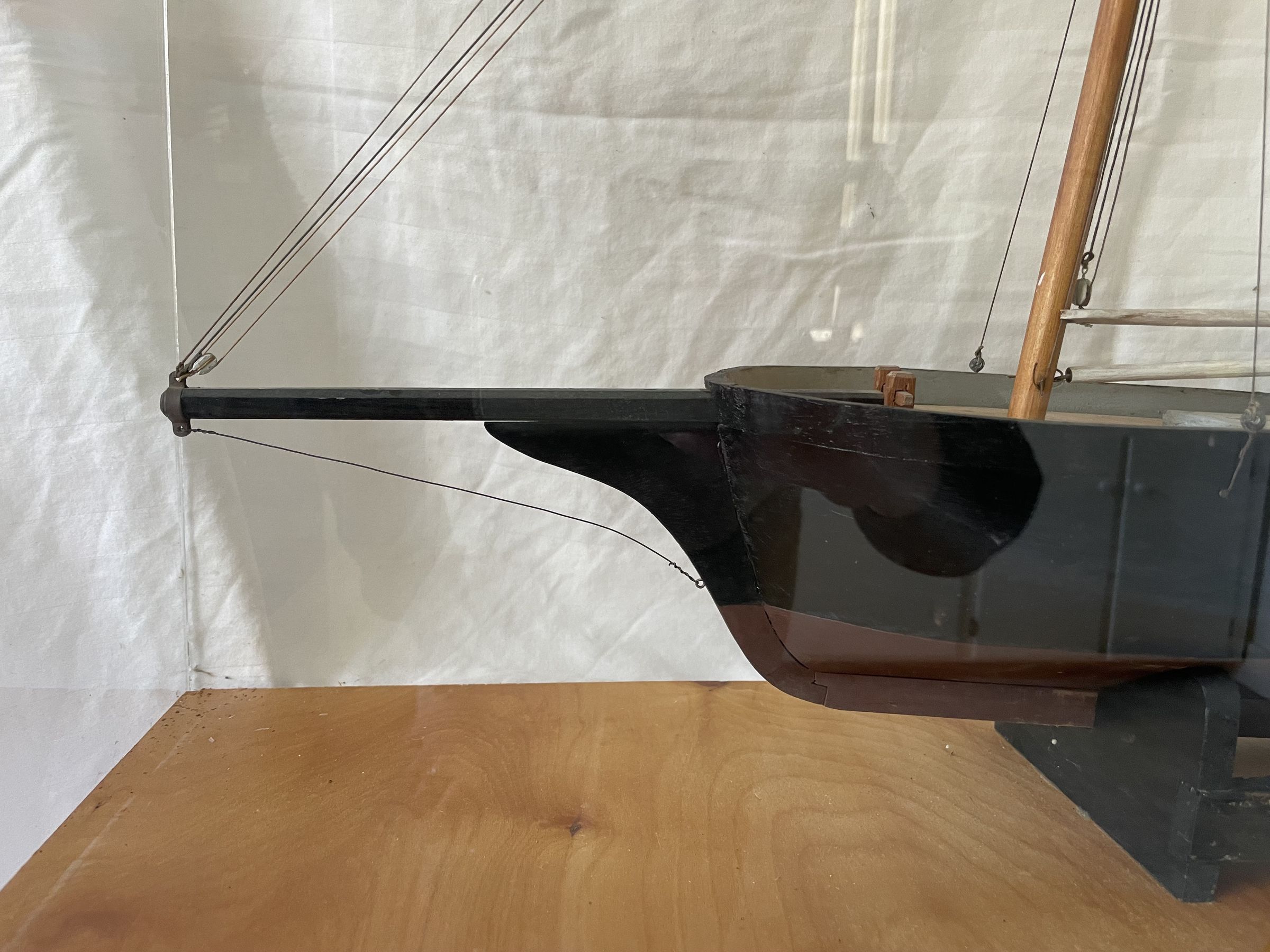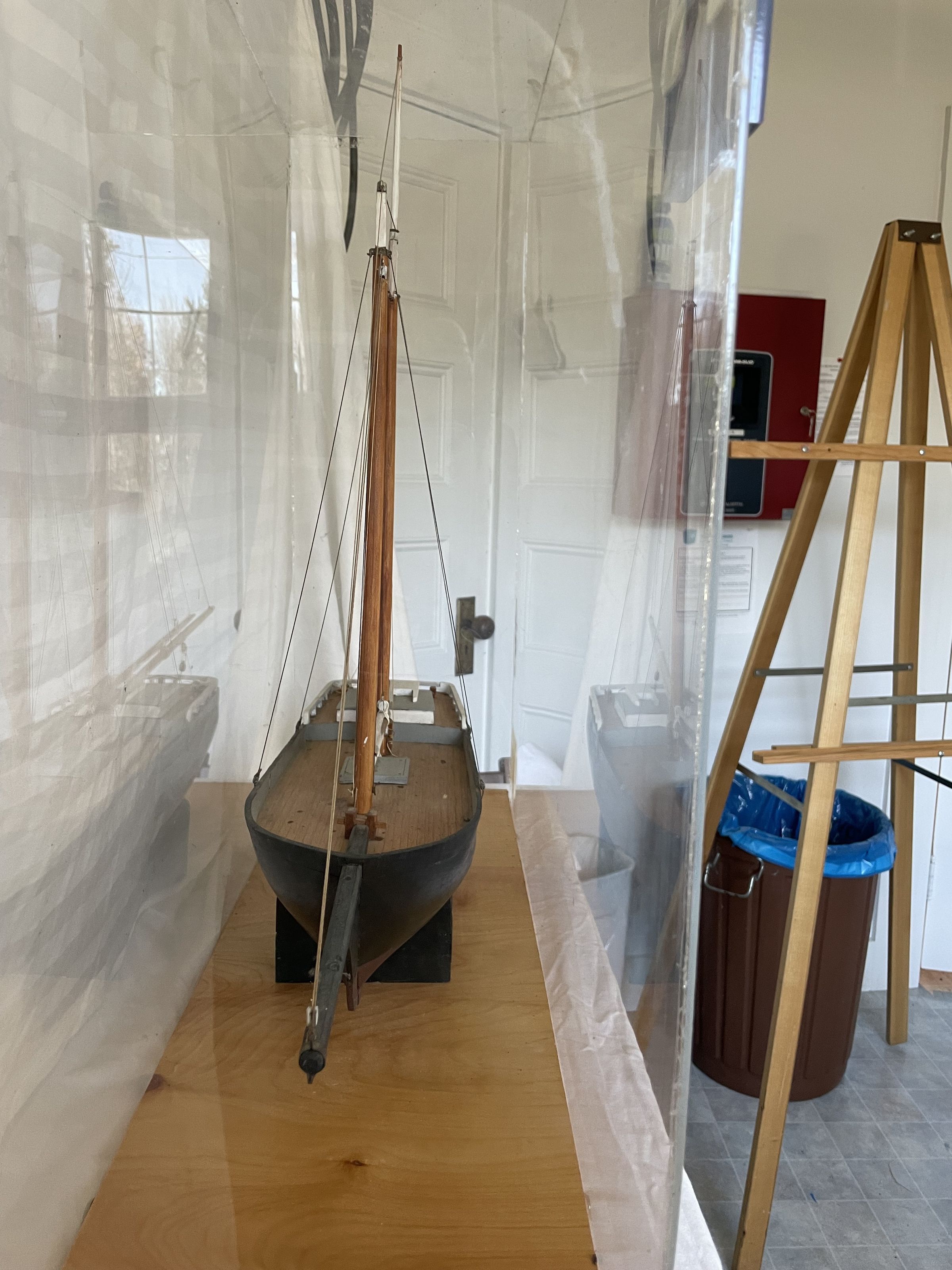 Large model of two mast schooner encased in plexiglass. The model has a black haul and treated wood masts, with white booms. The ships cabin at the back also has white trim. Labels read:
