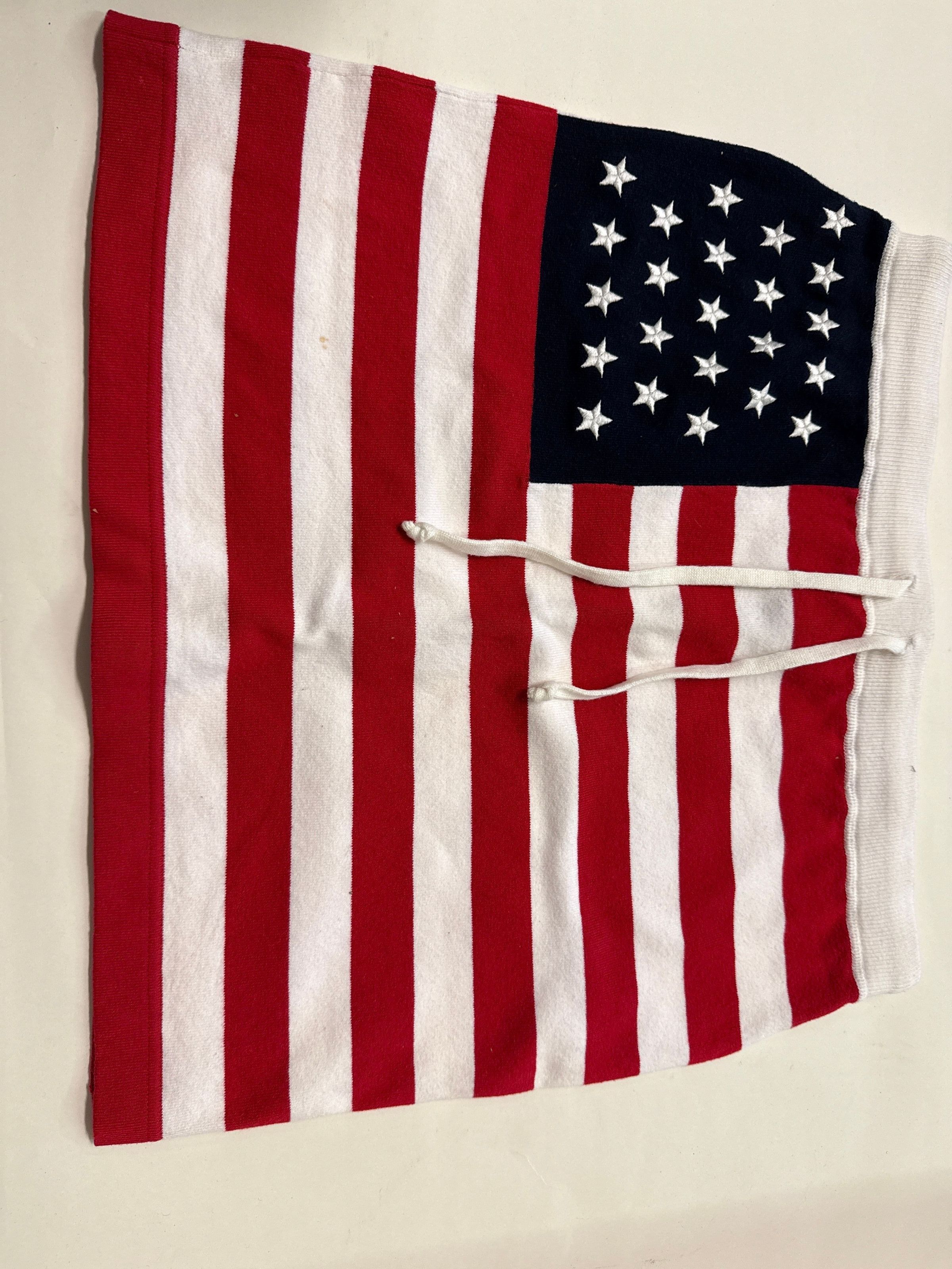 Red, white and blue mini skirt depicting the American Flag. 23 white embroidered stars on blue square background in upper left corner. 7 red stripes, 6 white stripes. White drawstring waistband. Ralph Lauren makers label inside waistband. Ralph Lauren Polo Sport label on outer upper back of skirt.