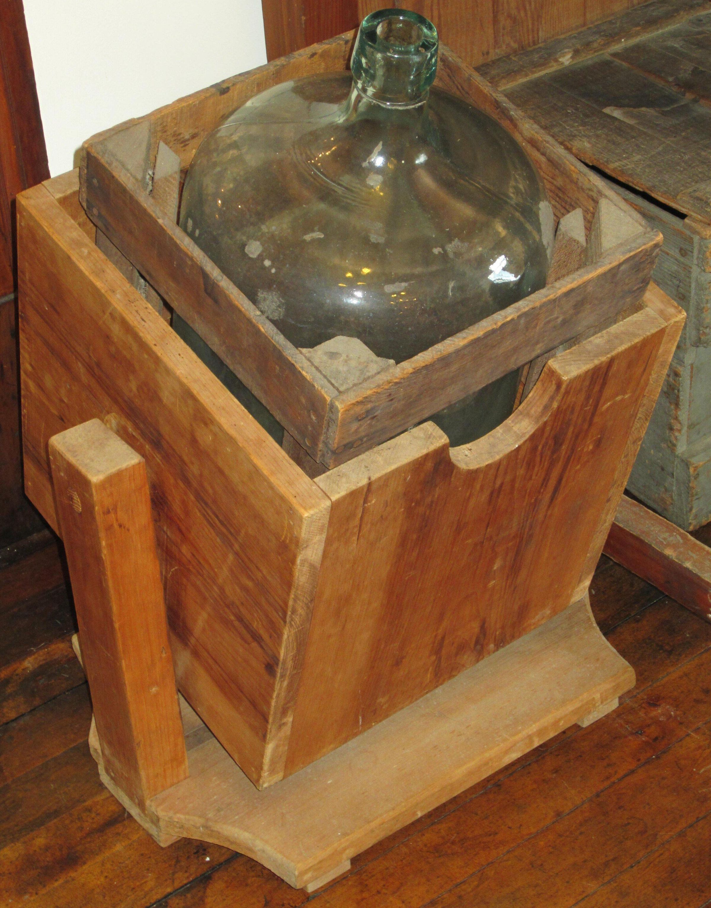 A wooden water jug cradle. Water from Pyam Hatch's spring was delivered to homes in glass bottles of varying sizes. This wood bottle cradle was made for the Devereaux cottage to hold the largest bottle, a five-gallon jug. Frances Devereaux Train remembers it in her mother's bathroom. It was probably last used in the 1940s. The cradle/bottle holder is c 14" in all dimensions, a wood box mounted by dowels on a wooden frame allowing the bottle to be tilted horizontally to facilitate the pouring of water from the encased bottle.