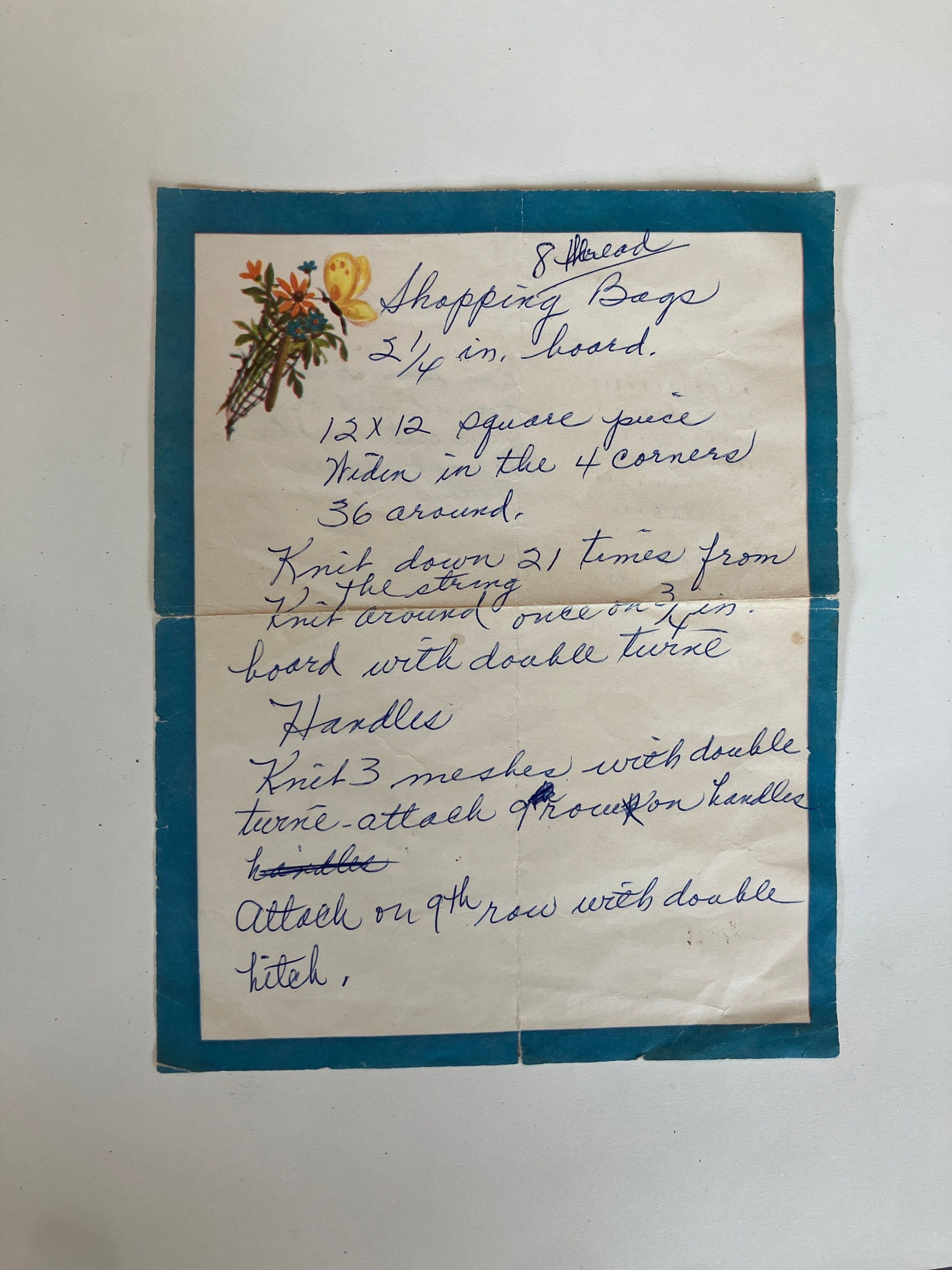 handwritten instructions for "8 thread Shopping Bagd 2 1/4 in. board"