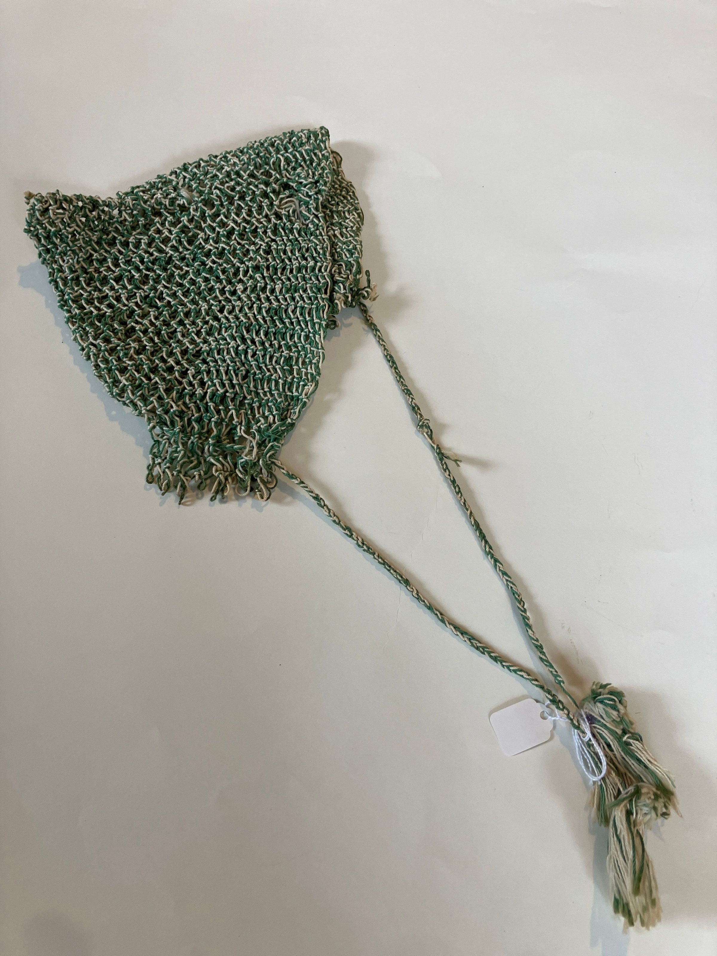 green and white twine bonnet, labelled "netted bonnet, small" 8" x 8" x 16" with two braided and tassled ties. Made in same technique as fish nets.
