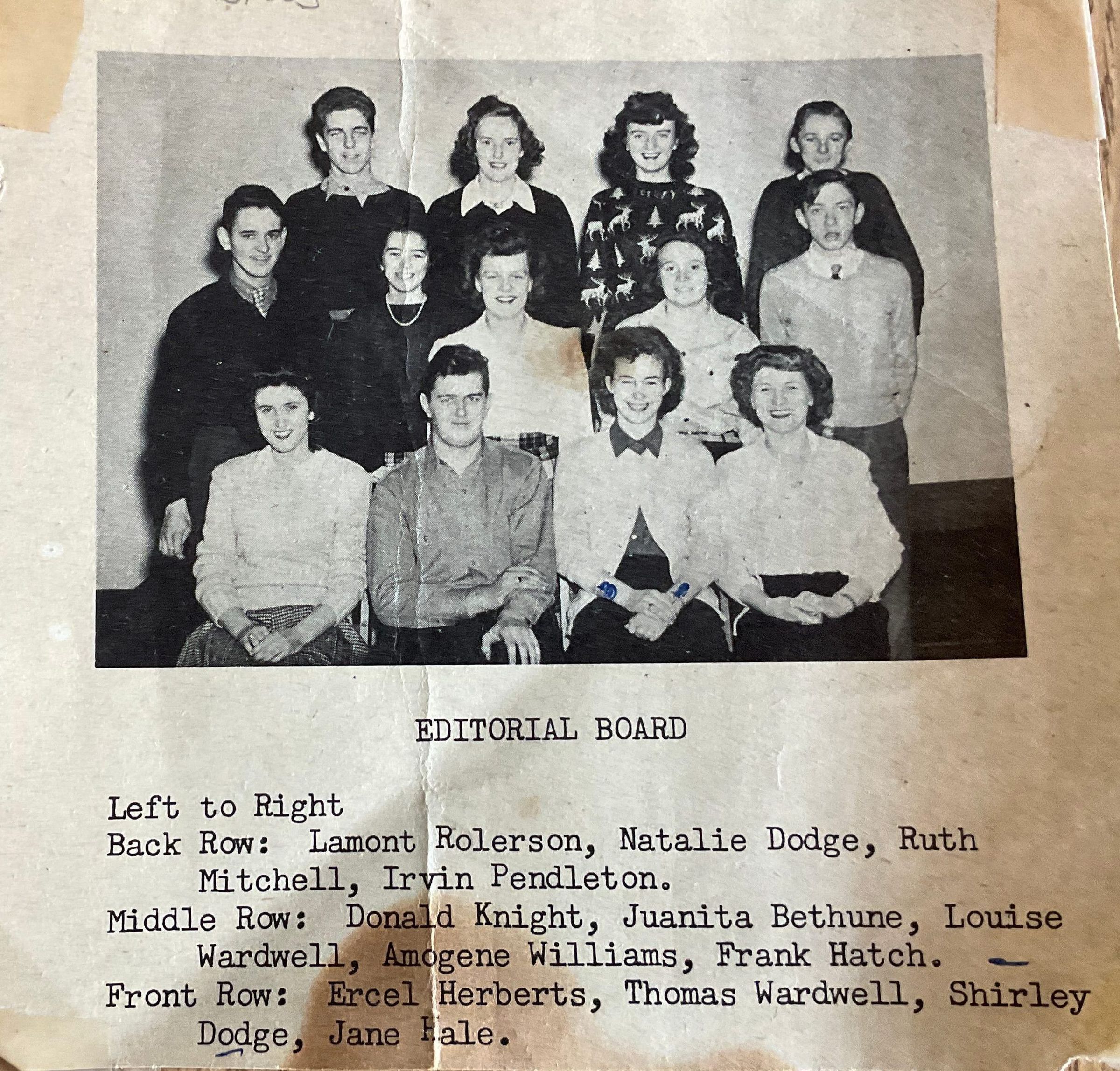 Page from ICS yearbook? Photo includes: Lamont Rolerson, Natalie Dodge, Ruth Mitchell, Irvin Pendleton, Donal Knight, Juanita Bethune, Louise Wardwell, Amogene Williams, Frank Hatch, Ercel Herberts, Thomas Wardwell, Shirley Dodge, Jane Hale.
