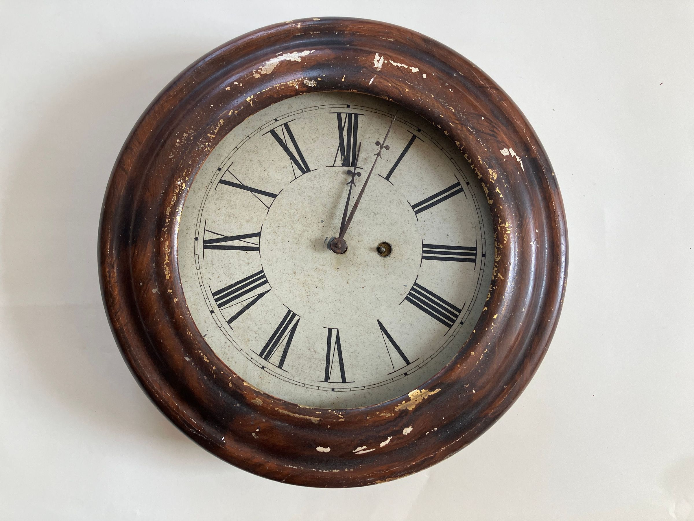 Round wood case (14.675" diam.) tin face with Roman numerals, two hands with fleur de lis design. No alarm or hour strike. One spring, one winder (no key). In pencil on back written "Free Baptist Church Clock," "no charge," "---- --- 1892," "Cle Dec 02, HJL" {ed.?? writing unclear]. Glass missing on face. Face surround is painted metal, "grained" to look like wood, badly scraped..