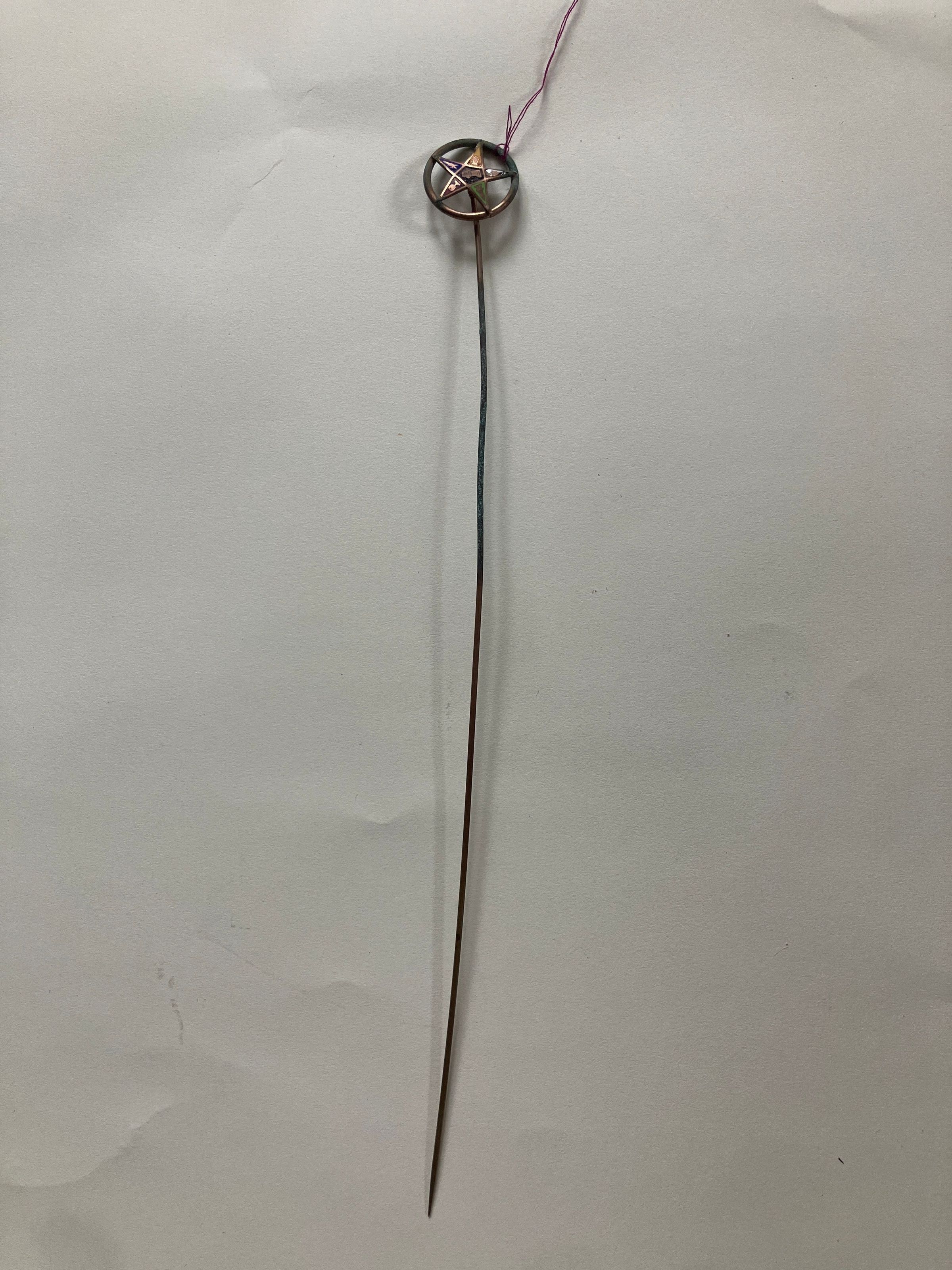 Hatpin with symbol of the Order of the Eastern Star (5-pointed star within circle). Gilded. 11" long